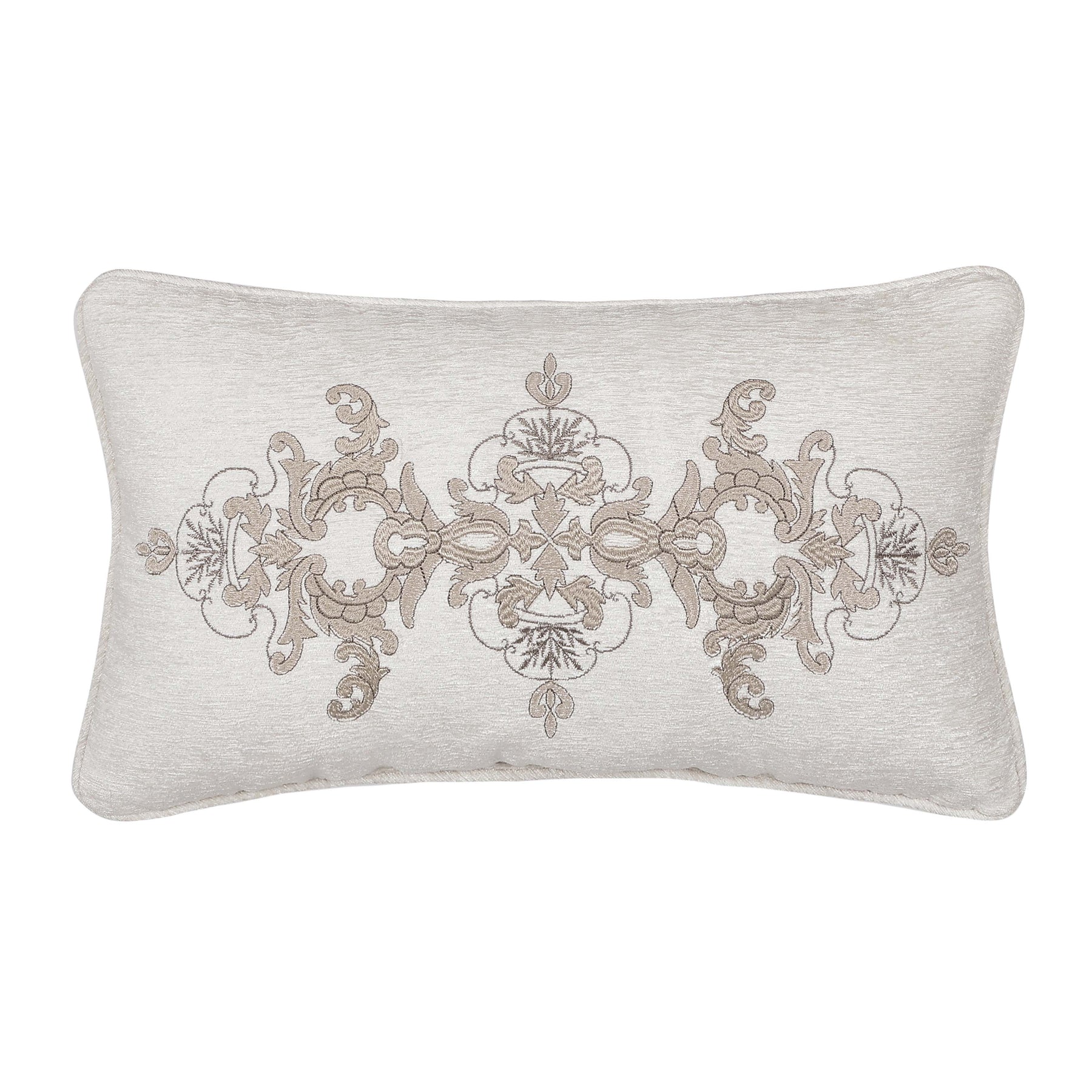The queensbury boudoir throw pillow features a stunning woven chenille fabric with a highly detailed embroidered damask design. This luxury traditional accent pillow was designed to coordinate with the queensbury bedding collection.