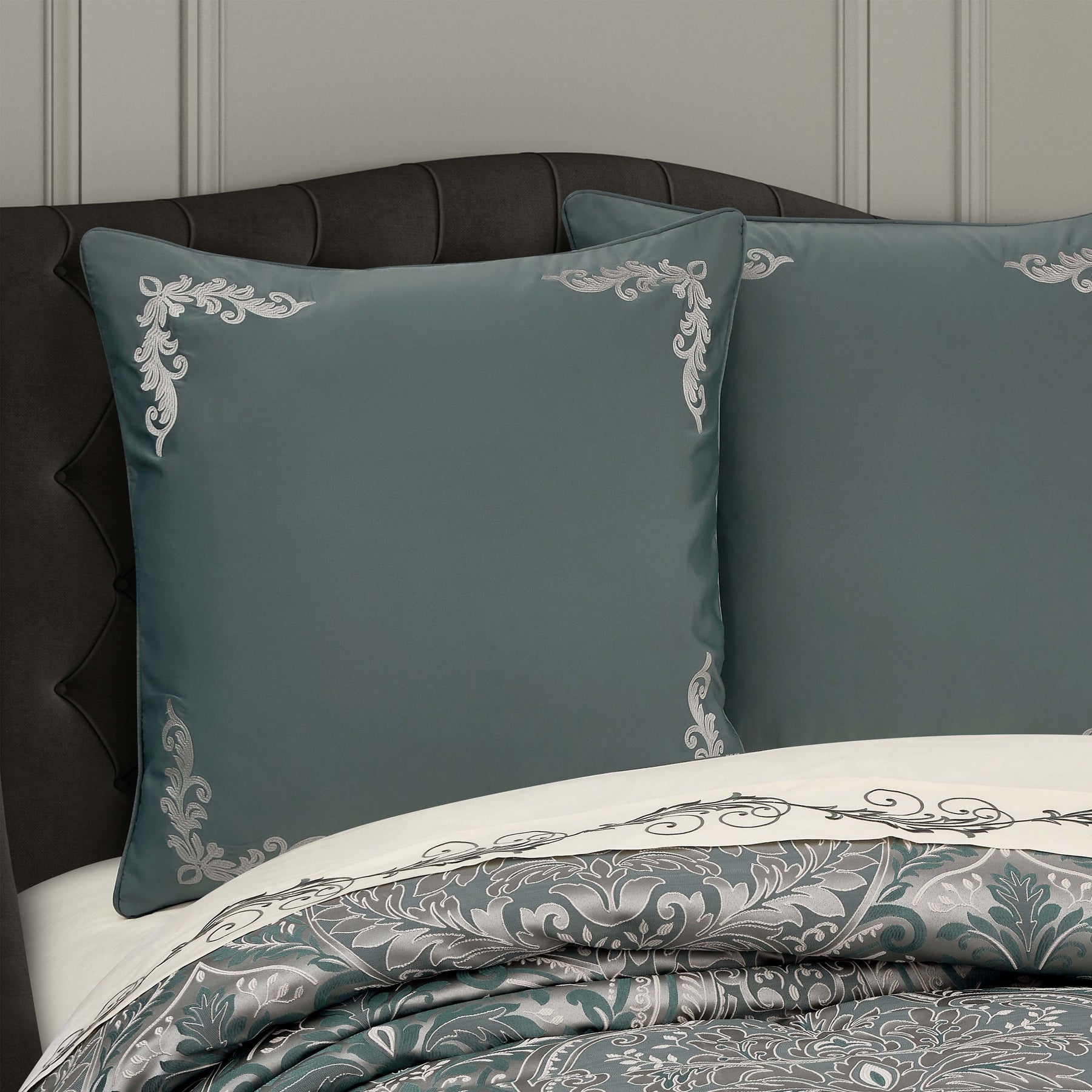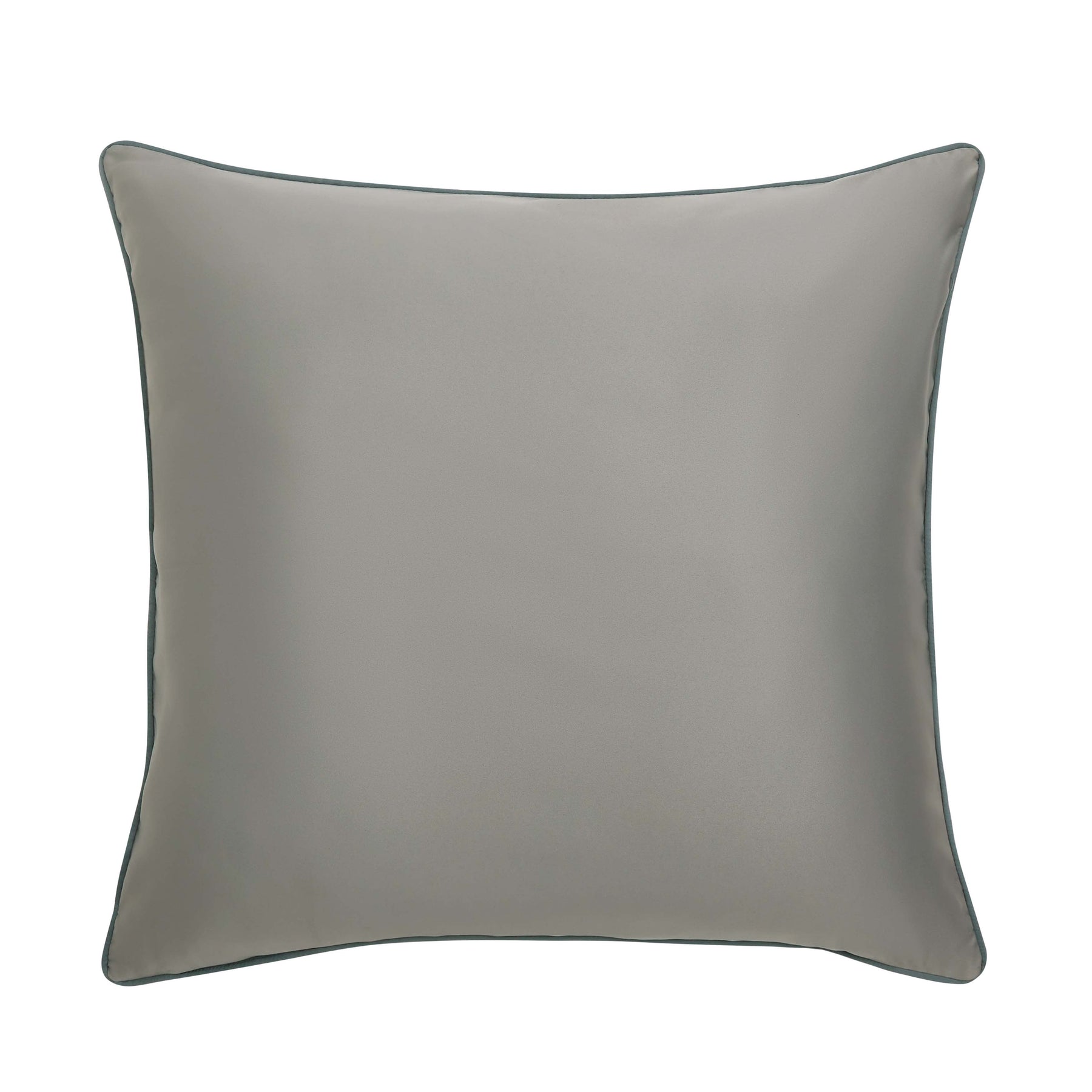 The renata euro sham features a woven scroll border design to create a detailed frame. Trimmed with a self-fabric cord on all corners with a teal and silver satin fabric. This elegant euro sham is made to coordinate with the renata bed set for a complete look.