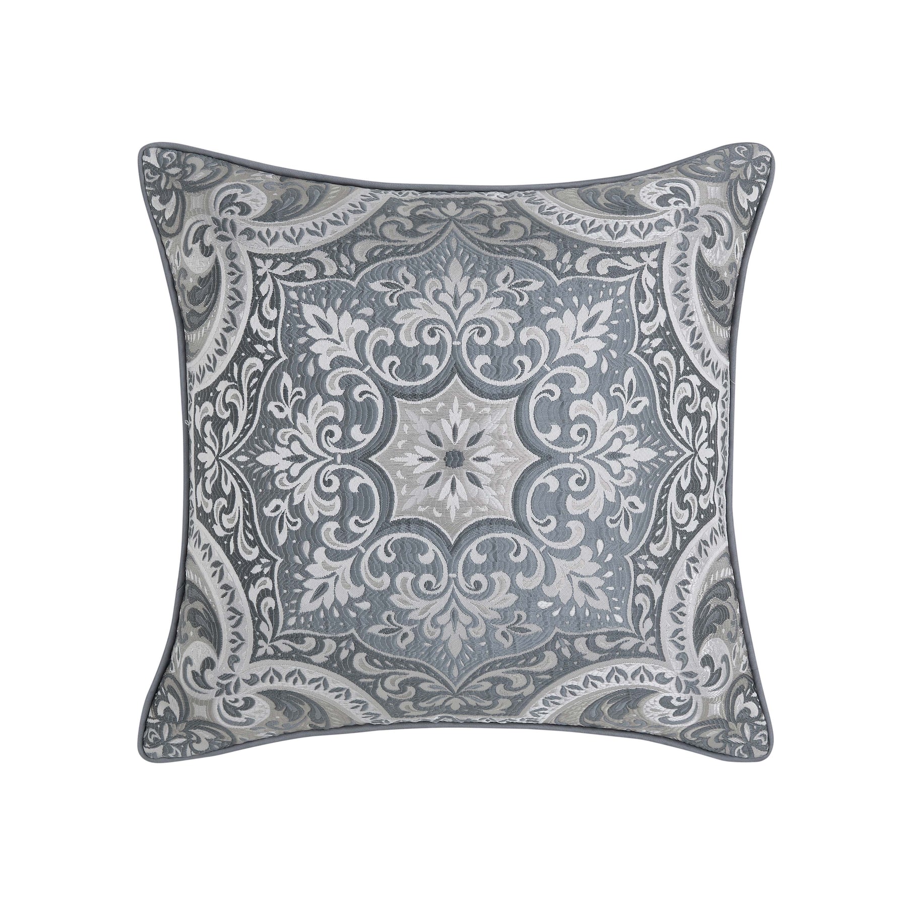 The lisbon 18 inch throw pillow is intricately designed with a woven damask pattern in shades of slate, grey, and ivory. The pillow reverses to a coordinating slate fabric and is finished with self-fabric piping. Add the lisbon comforter set and window collection to complete the look.