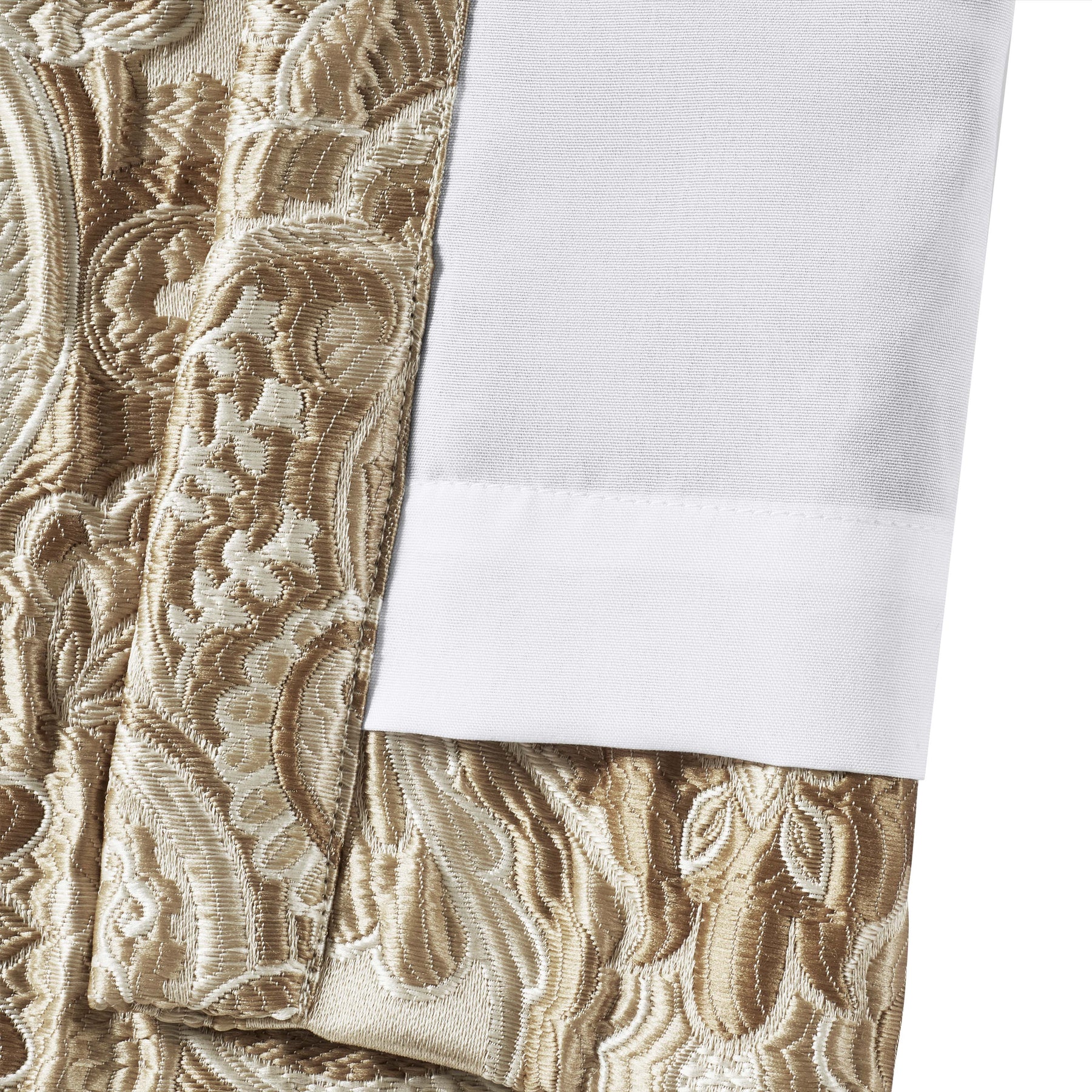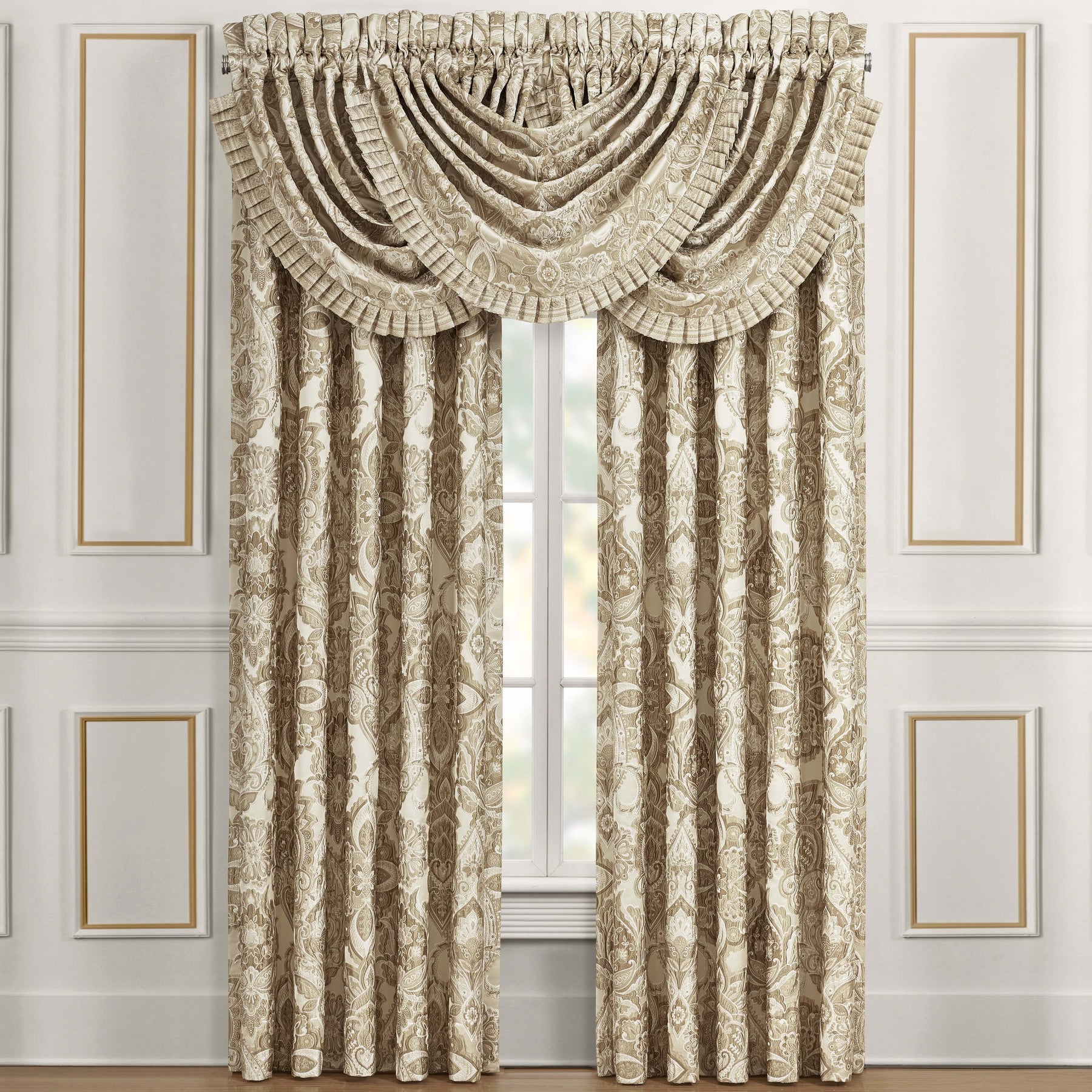 The sandstone window panel pair is exquisite with a sand colored traditional jacquard damask pattern. These lined panels include tiebacks and are the perfect finishing touch to complete a traditional look, while filtering light and keeping you comfortable throughout the day. The 3" header and 3" rod pocket make these panels easy to hang. Pair these window panels with the sandstone window valance and bedding set by j. Queen new york for a complete look.