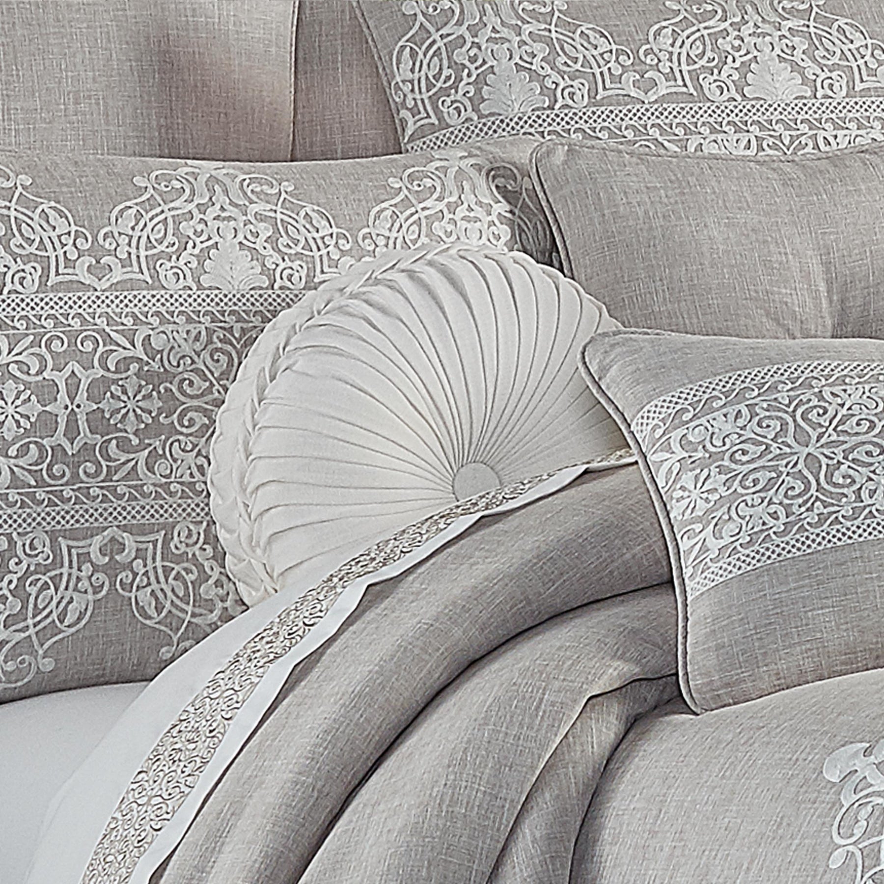 The aimee tufted round pillow uses white colored faux linen to create a one of a kind accent to this bedding ensemble. These unique luxury pillows are sewn by hand and are finished with a fabric-covered button on both sides.