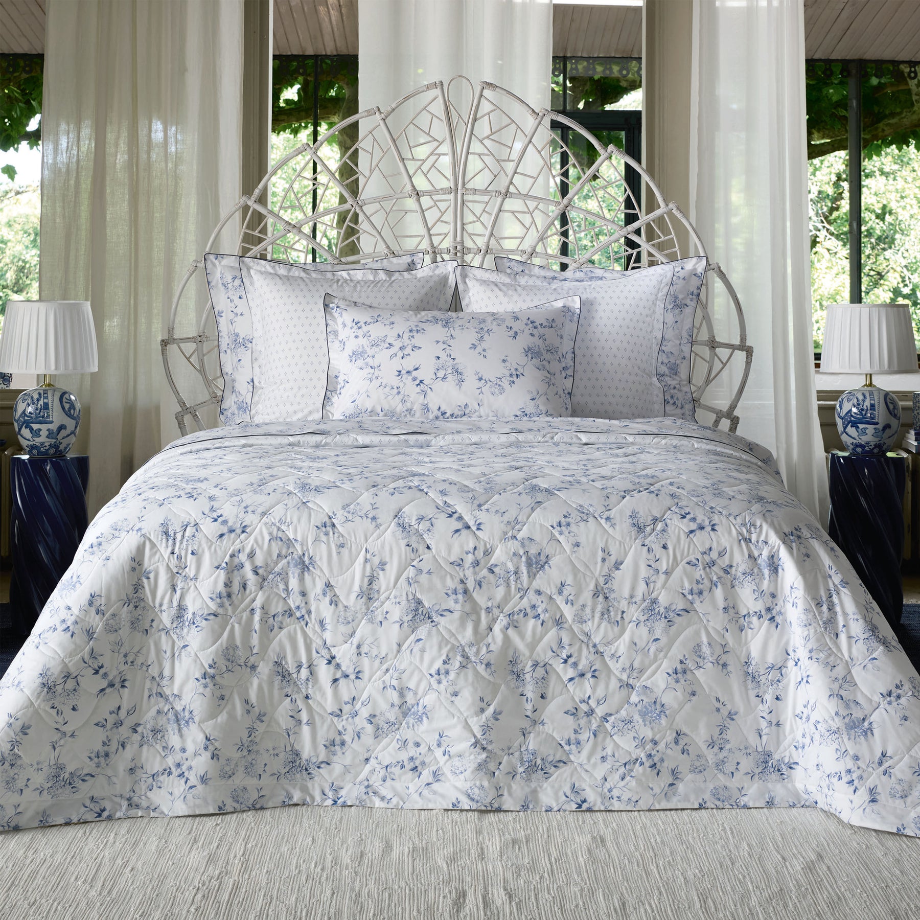The sea routes discovered in the 15th century by the navigator Vasco da Gama, linking Europe to the East Indies, influenced European culture with exotic textiles and ceramics. The inspiration from porcelain, with delicate floral details, because an unavoidable must-have. The Indian Ocean, the China Sea, the Strait of Malacca, the Bay of Bengal - all exotic names that inspire dreams. Malacca coverlet have a blue-on-white design of Eglantine and Dahlia flowers, done in a painterly way, on one side and a stylized earthy ware design on the other side. It is framed with the earthy ware tiles print and the coverlets have a spherical quilted stitch embellishment.