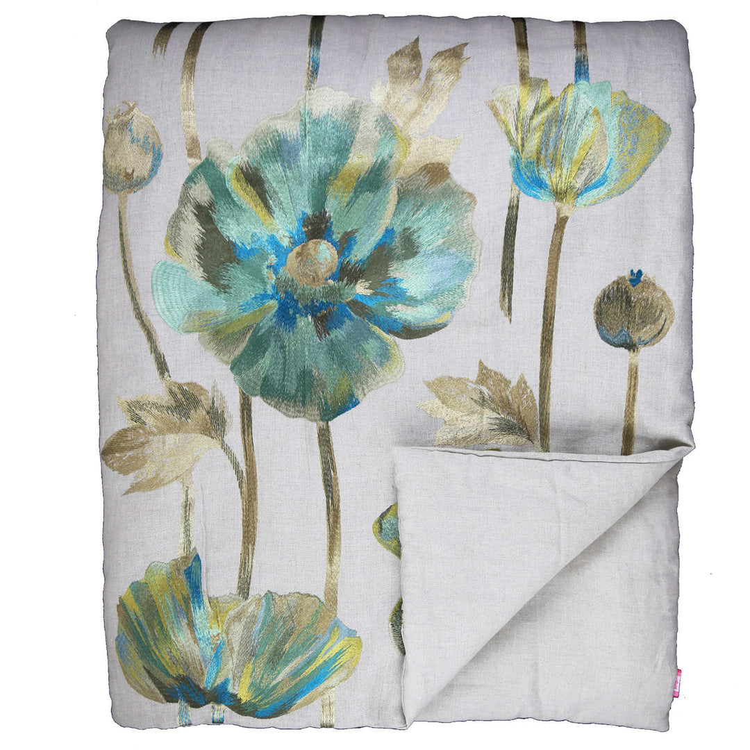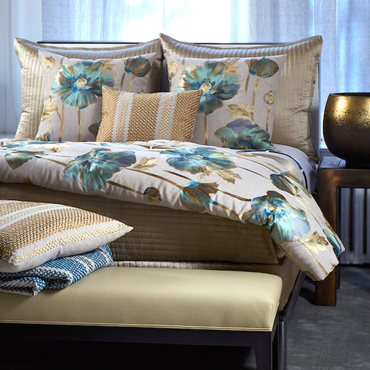 Our designs rely on elegance that is easy and pleasurable to live with, achieved through a marriage of form and function. It is luxury created for and enjoyed by the senses. As beautiful as it is addictive, heavily embroidered opium flowers in azure and gold tones on a natural linen ground make a mesmerizing fabric.