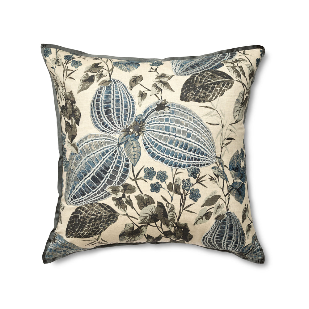 Euro features inset flange in steel charmeuse. Zip closure. Reverses to smooth linen.