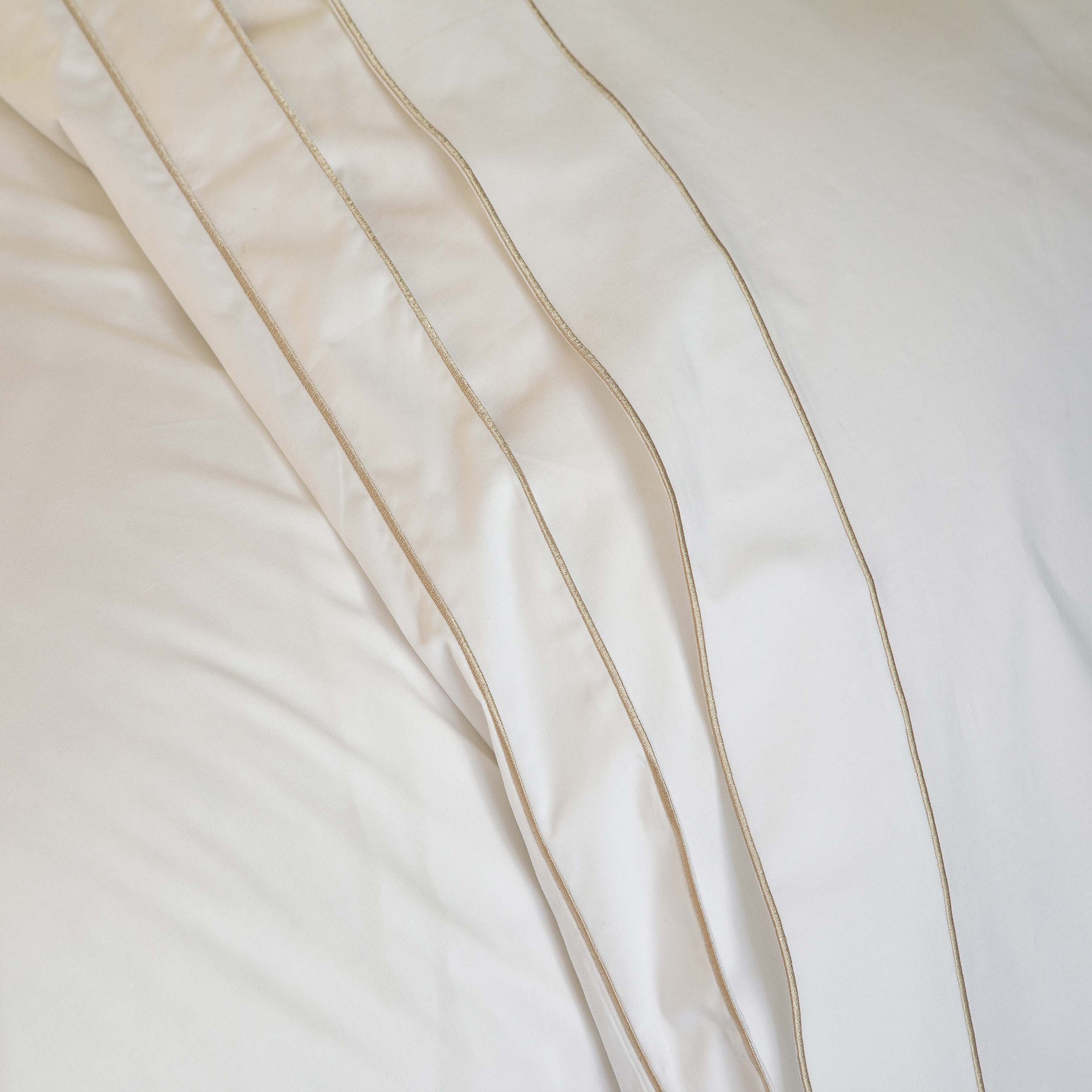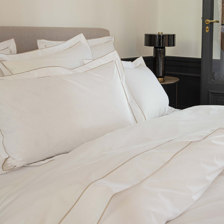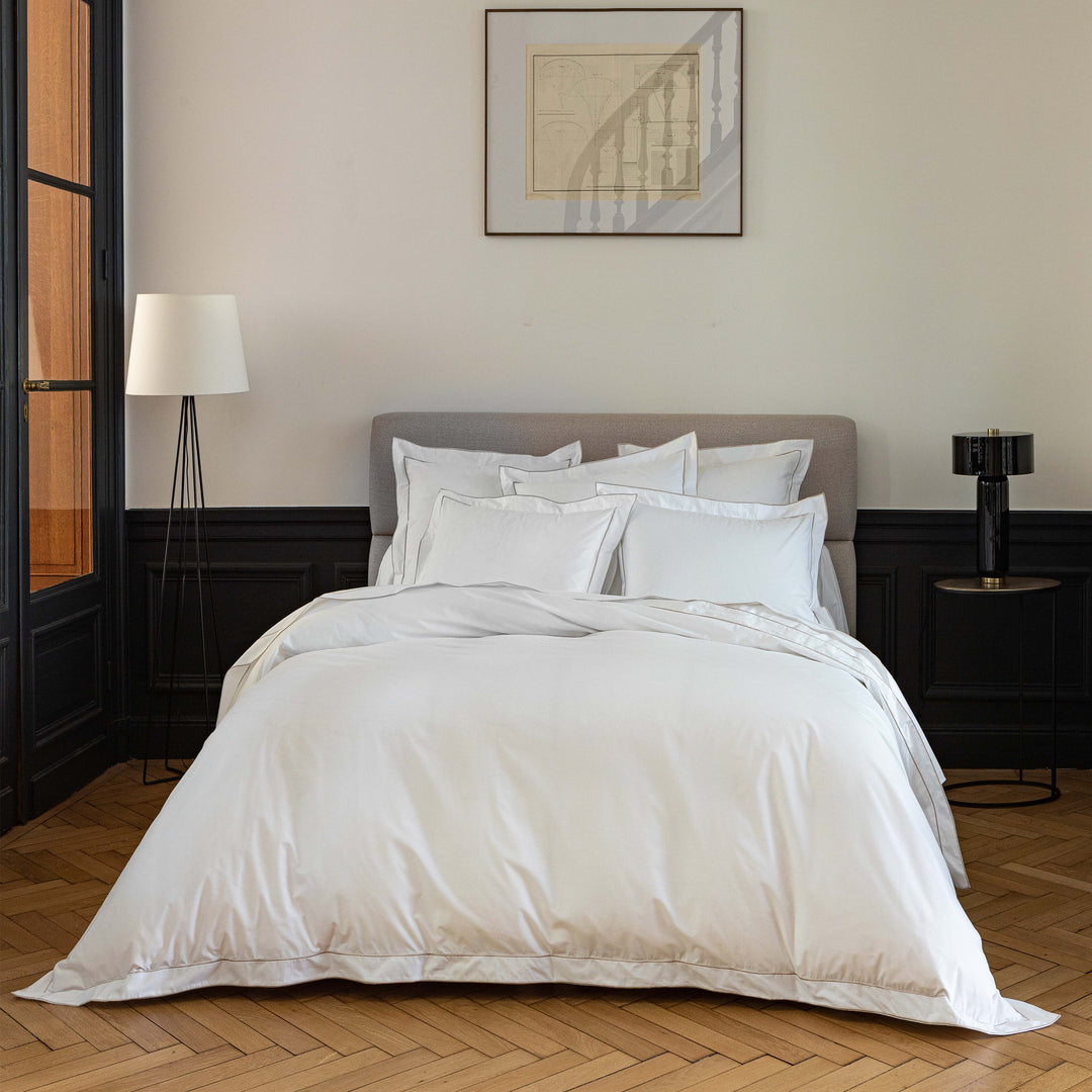 Crisp white coloured percale with a very special Bourdon embroidered line detailing in sable. Louvre is a very sophisticated updated on the crisp, modern white-on-white look. !00% long-staple combed cotton. Percale construction. Made in Tunisia.