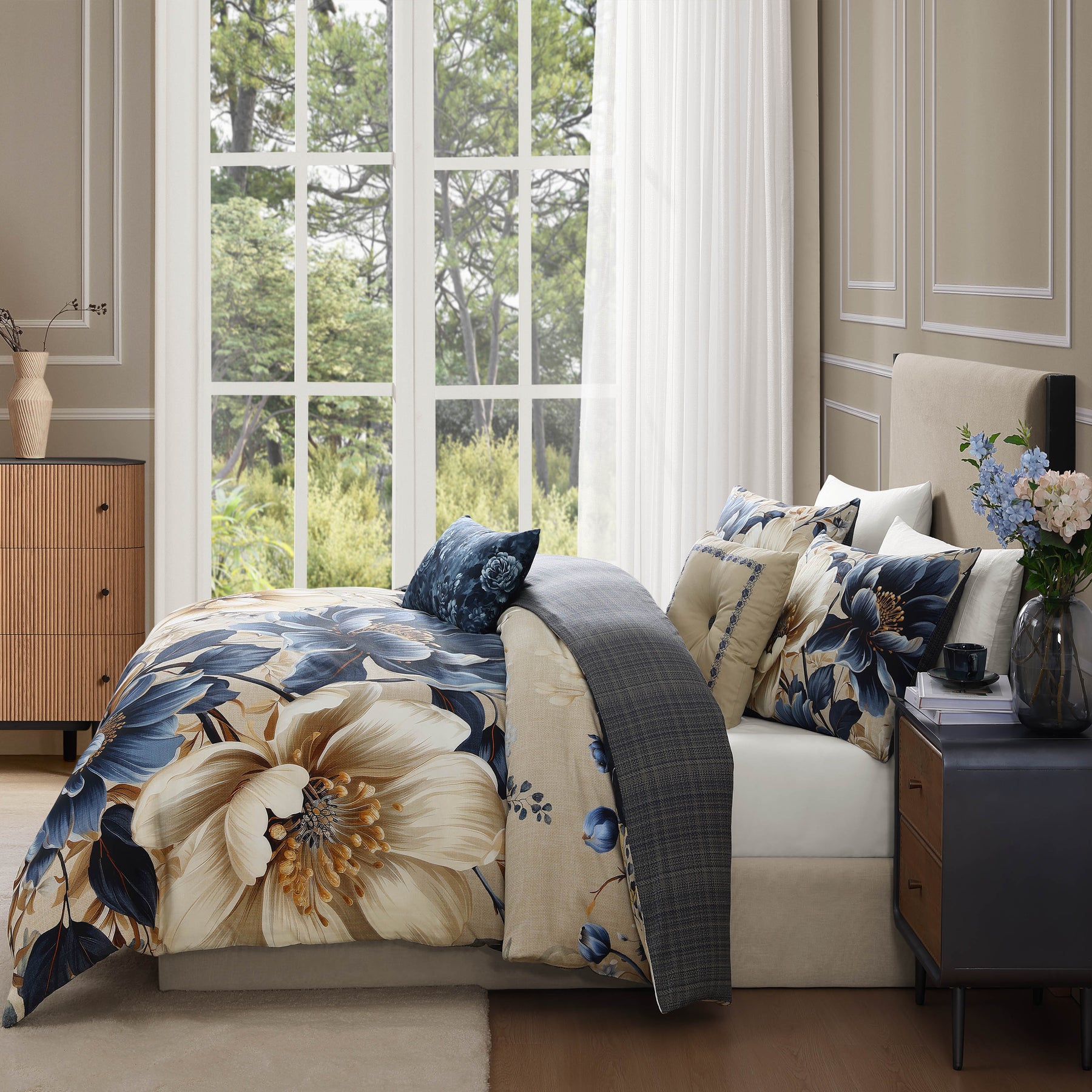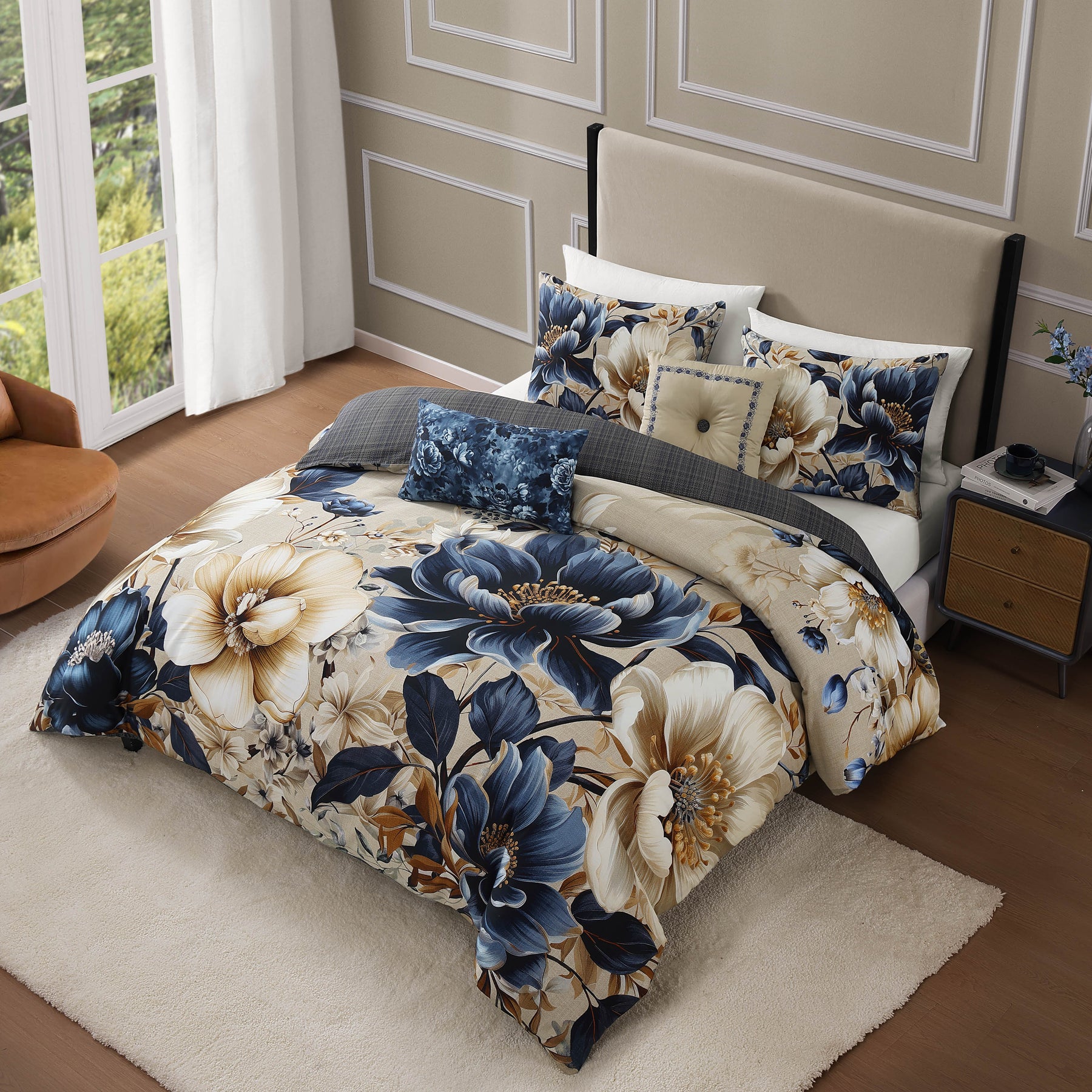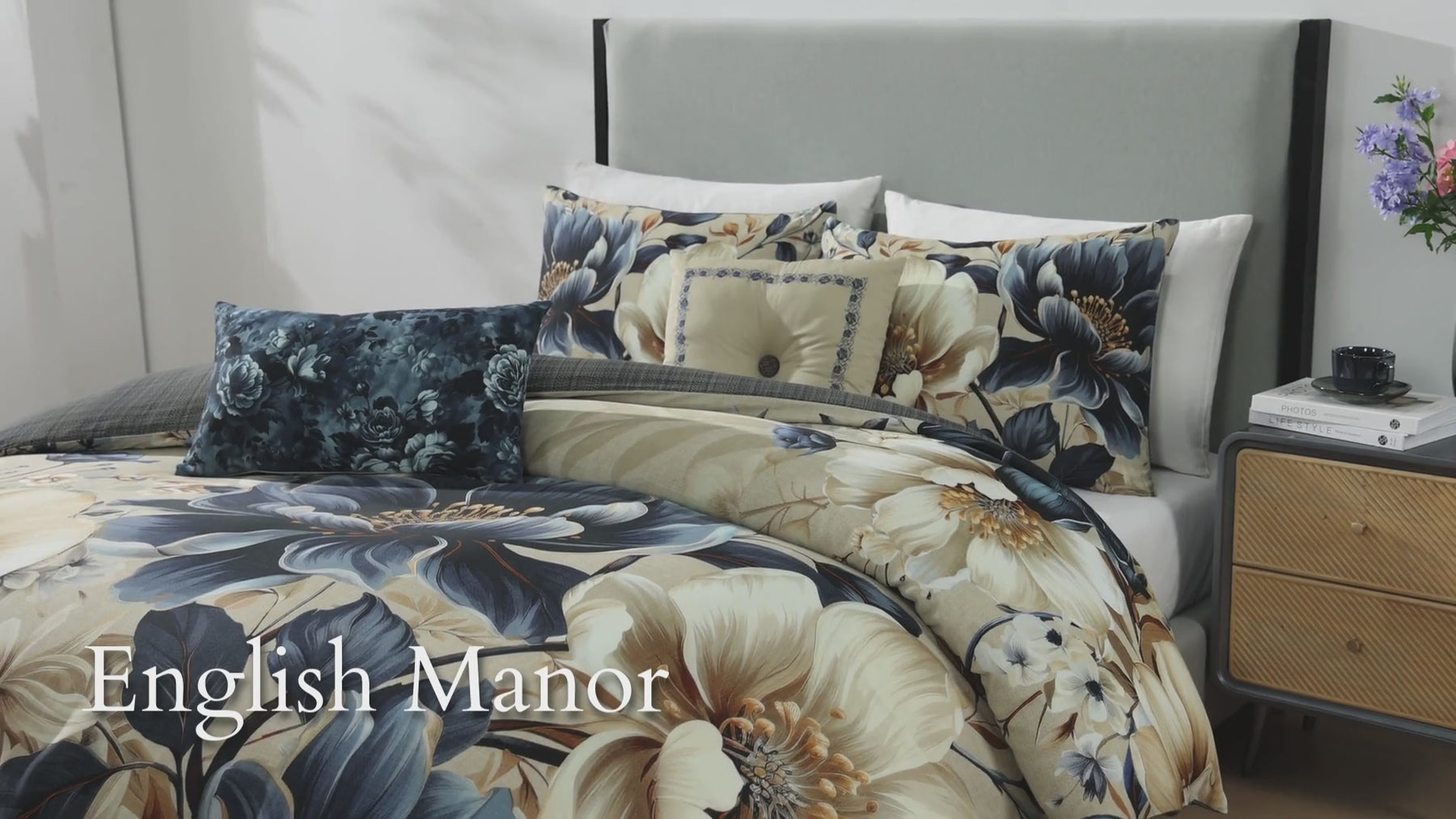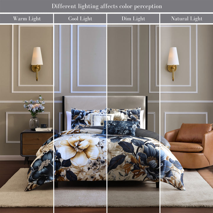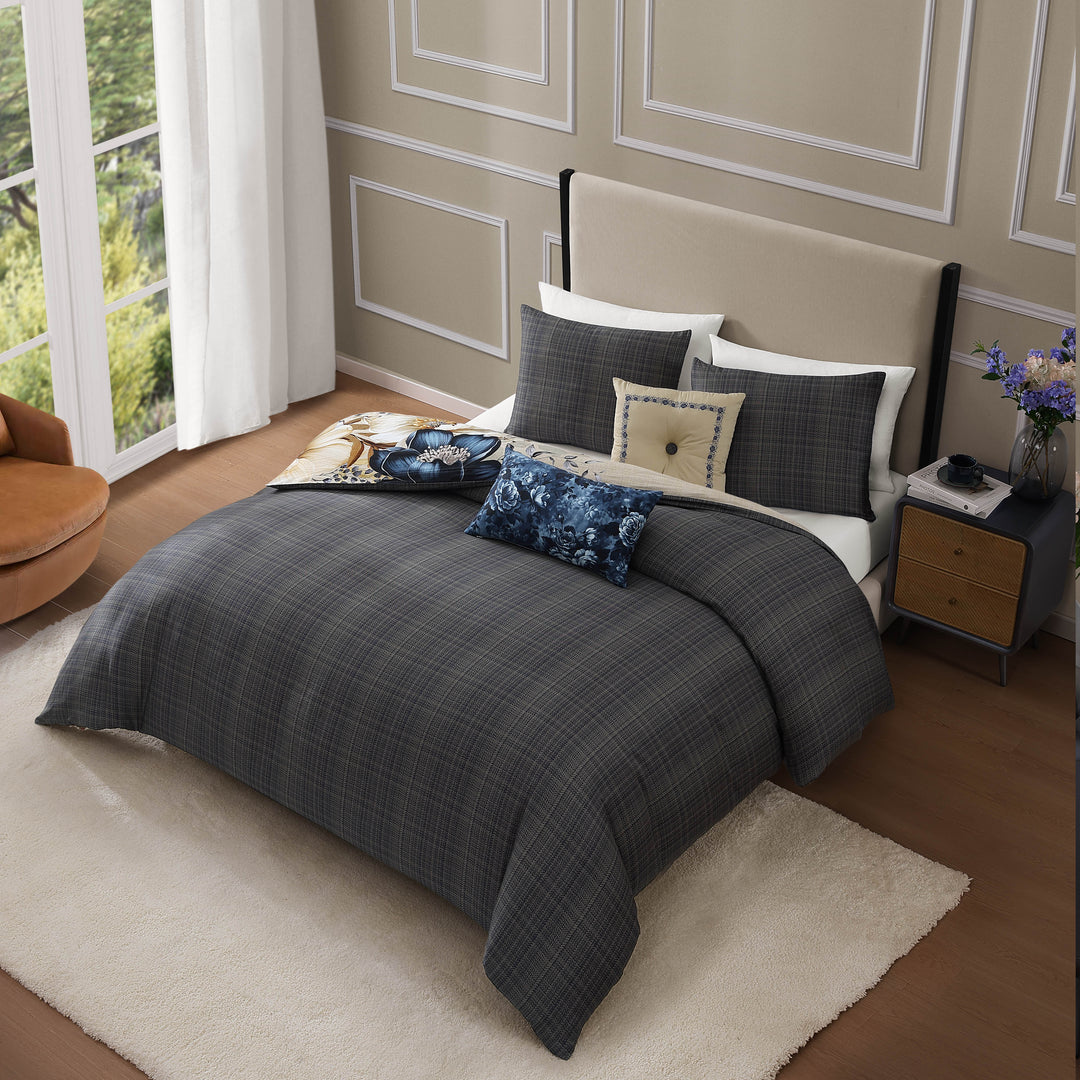 This contemporary version of a traditional look pairs a large, glorious floral on the front with a handsome plaid on the reverse, all in comforting tones of steel blue, soft beige and creamy ivory colors. The Bebejan English Manor 5 Piece Reversible Comforter Set is enhanced with a steel blue floral printed oblong pillow, as well as a square pillow, tufted with a plaid covered button, and embroidered with a floral frame. This 100% cotton sateen 5 piece set includes 2 shams, an 18" x 18" embroidered pillow, and a 22" x 12" printed pillow.