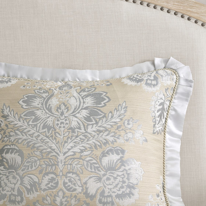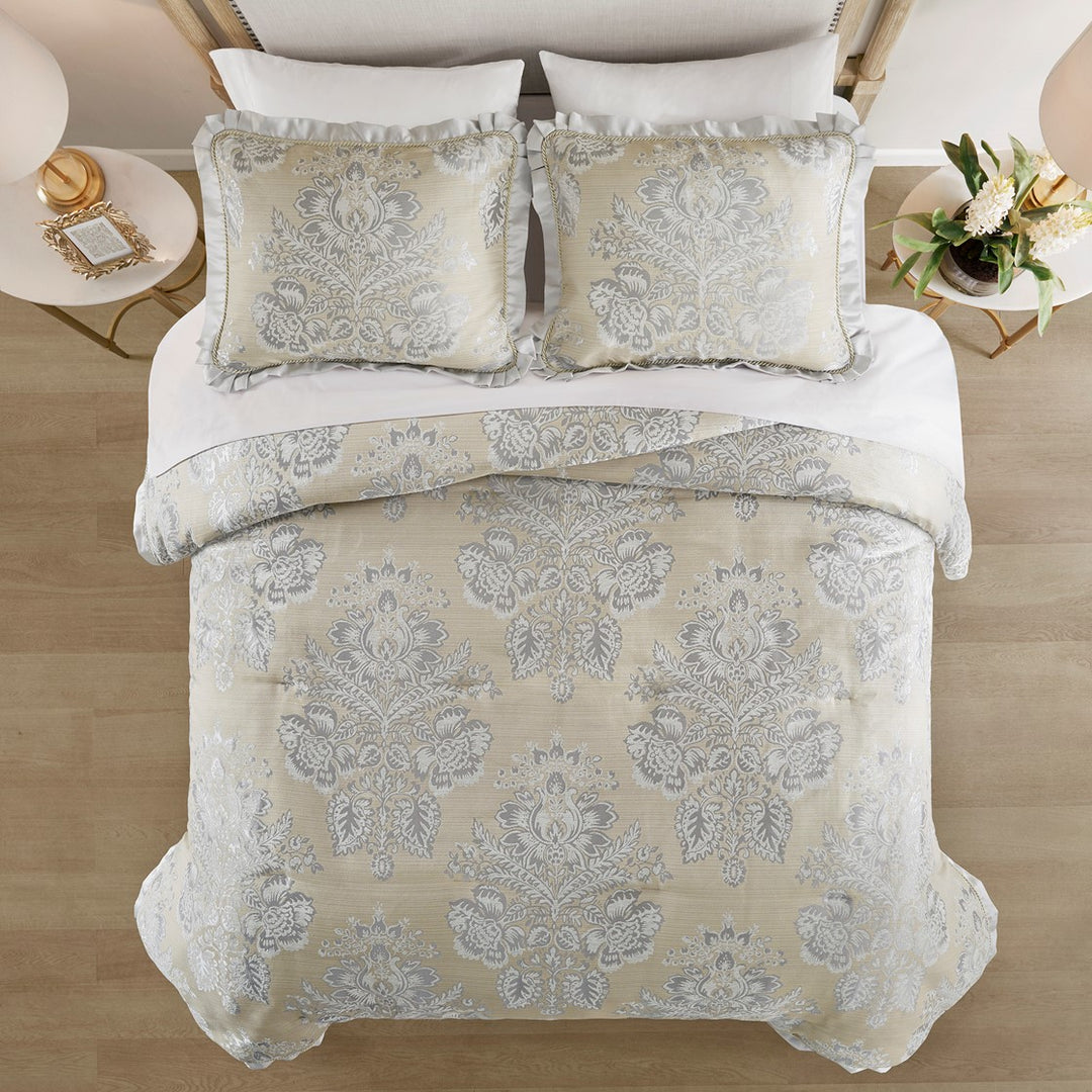 Inspired by the Neoclassical arts of the 18th century, characterizing harmony, clarity and universality.Create a luxury atmosphere for your sleepscape with the Loretta 4-piece Comforter Set by Croscill. This exclusive collection flaunts silver, white, and beige damask patterns crafted in luxurious chenille jacquard. The soft comforter and coordinating shams are trimmed with twisted cords and sateen flanges. Completing the lavish look is a sateen bed skirt with five kick box pleats. Complete your look with the entire Loretta Collection including the curtain panel pair, canopy valance, European shams, and decorative pillows.