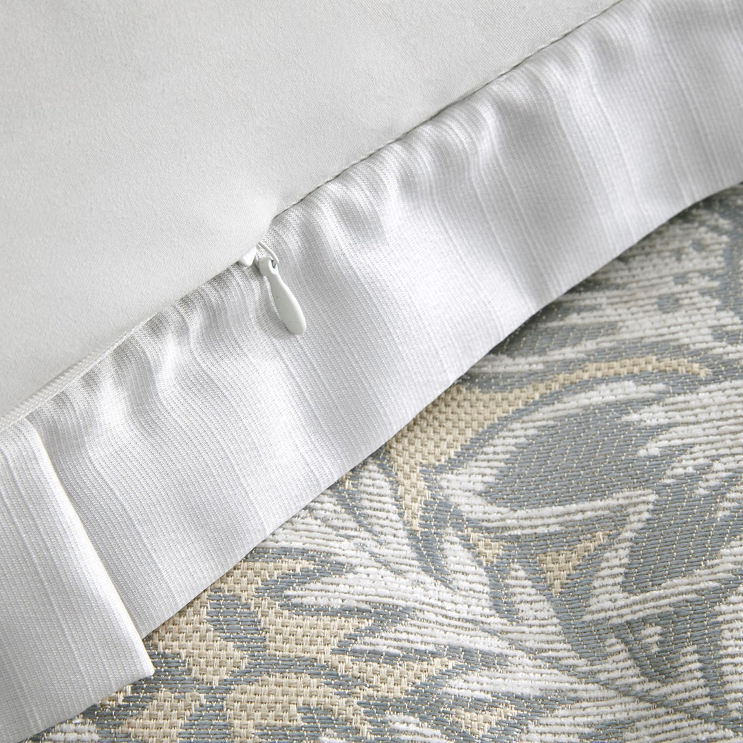 flaunts silver, white, and beige damask patterns crafted in luxurious chenille jacquard