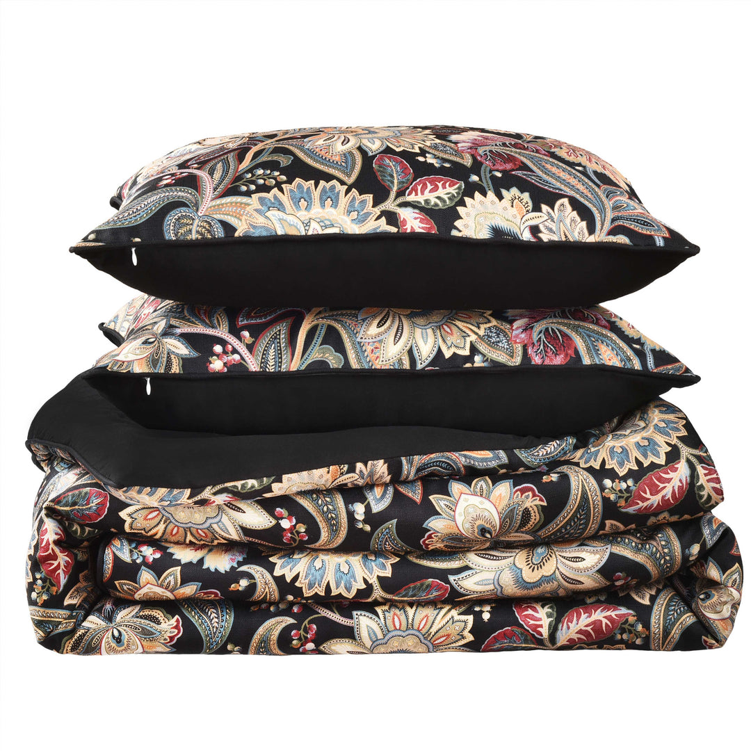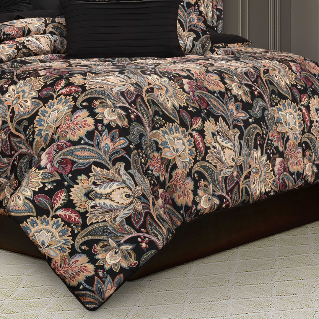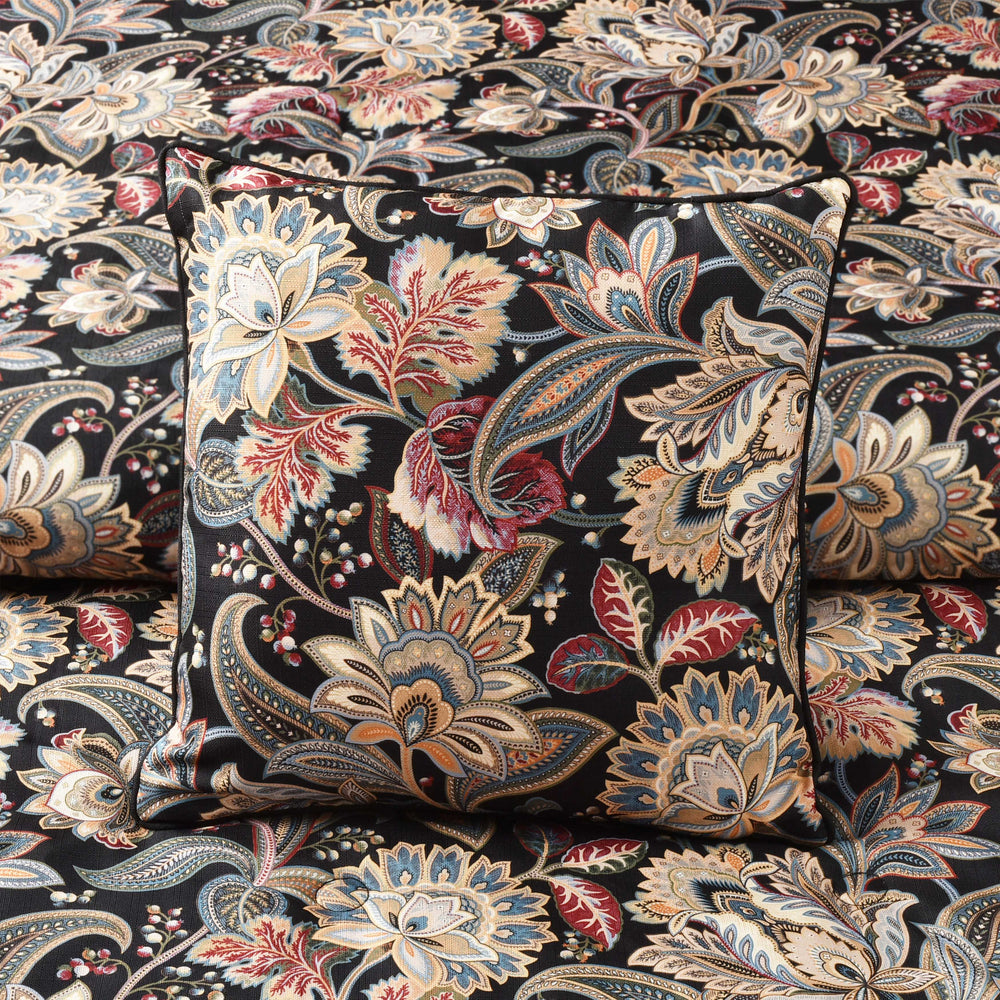 Transform your bedroom into a luxurious retreat with the calabria comforter set. This elegant set features a sophisticated jacobean floral pattern in rich, warm tones against a striking black backdrop, adding an air of timeless beauty to your space. The intricate design is both classic and modern, making it perfect for a variety of décor styles. The set includes matching pillow shams that pulls the beauty all together. Pair this bedding collection with the calabria throw pillows, euro shams, and window treatments for a complete look.