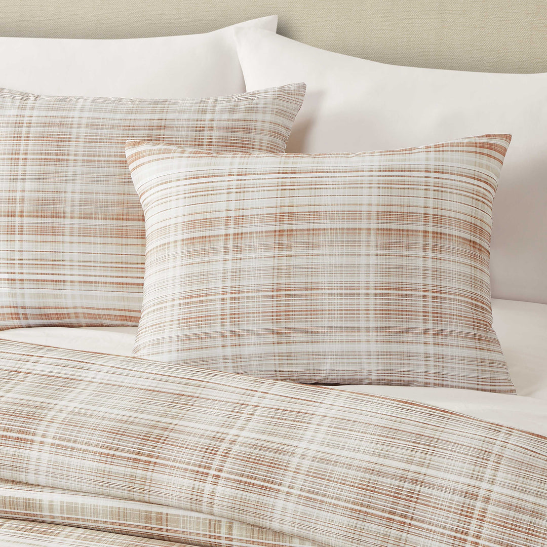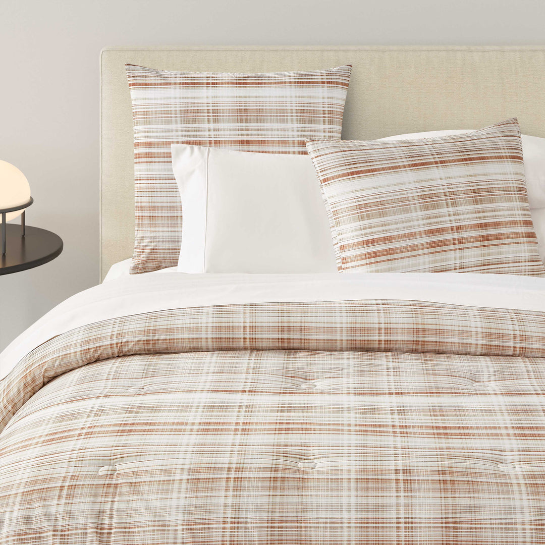 The pascal comforter set features a mini-plaid design that adds a sophisticated atmosphere to your sleep space. The comforter is printed on a soft 100% cotton fabric and the included pillow shams are fully reversible. Add the throw pillows and euro shams to complete the classic look. Available in your choice of blue or cinnamon color options.