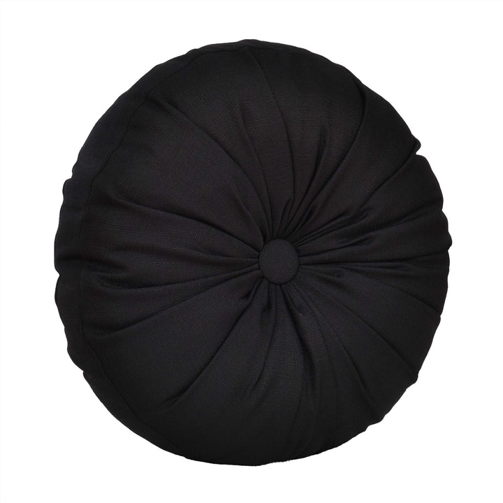 The calabria hand-crafted tufted round pillow uses an elegant black fabric to create a luxurious accent to the ensemble. Completely pleated all the way around with a large button accent which gives the pillow a truly unique artisan appeal.