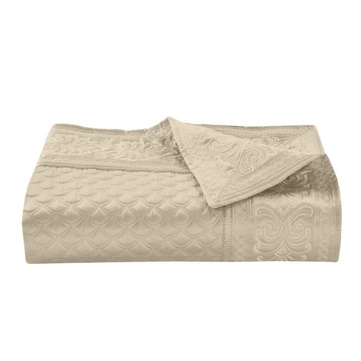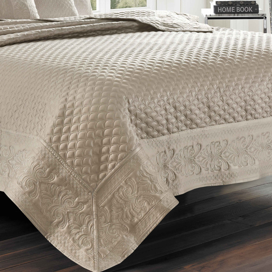 Add some luxury to your bedroom with an updated take on a timeless traditional quilt/coverlet. The plush fabric is finished with a matte satin to add a slight sheen and dimension to your bedroom decor. Available in multiple fashionable color ways, this machine quilted design is bordered with an elegant foulard and damask embroidery, mitered at the corners and edged with self-piping. Add the coordinate shams and throw pillows to complete the elegant look.