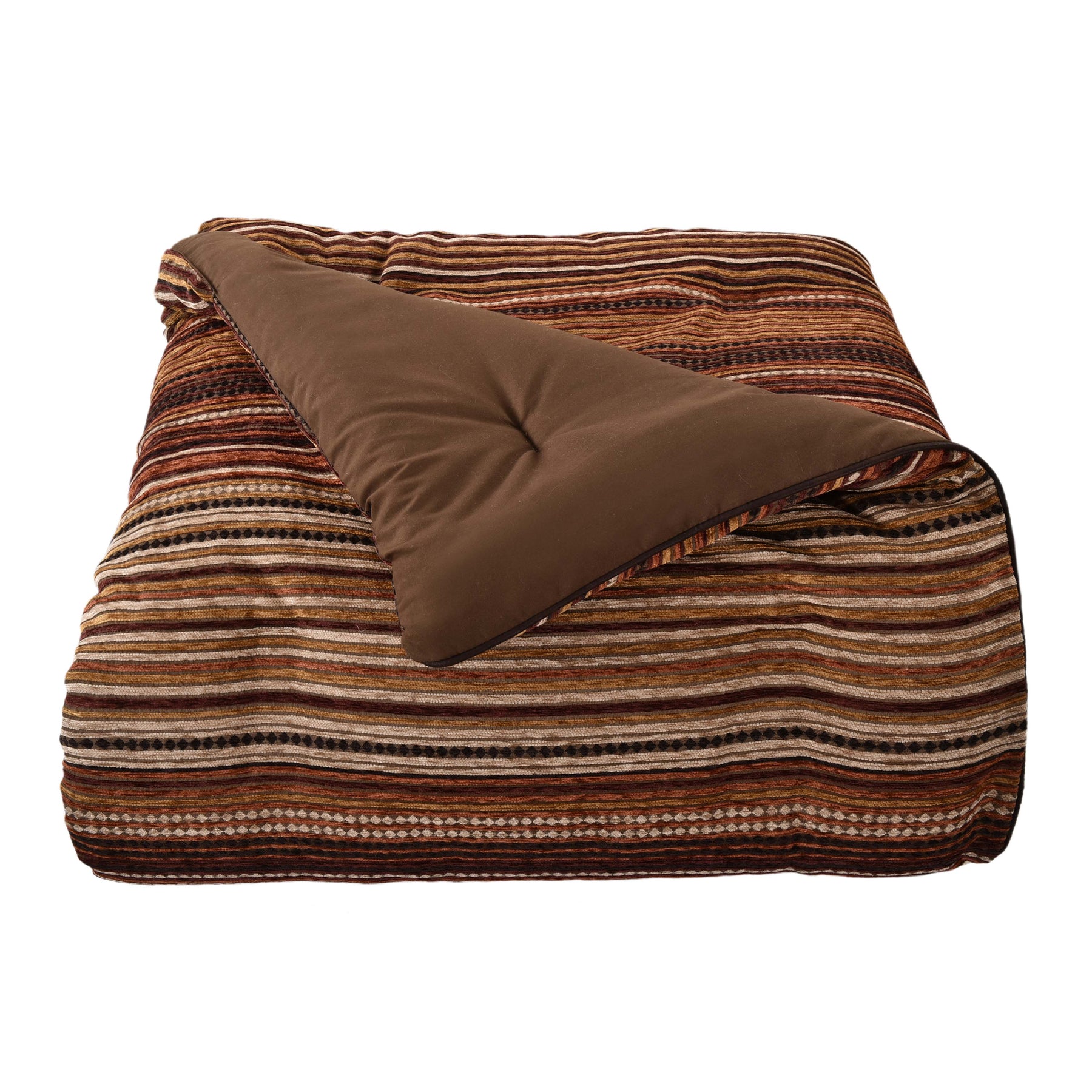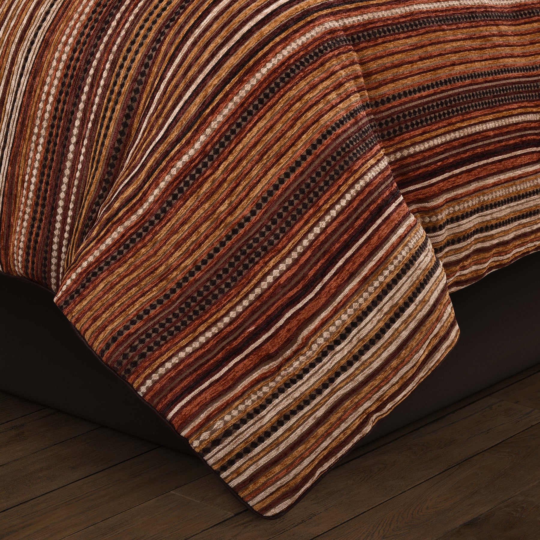Update your bedroom decor with the sundance 4 piece comforter set, that is intricately constructed with a stunning southwest woven chenille fabric. Featuring a horizontal chenille stripe accented with diamond motifs in a stunning harvest color palette of rust, brown, orange and wheat hues. The comforter is piped all around and it is paired with matching shams and a tailored vegan leather bed skirt that pulls the beauty all together. Style this modern southwest bedding collection with the sundance throw pillows, shams, and window treatments for a complete look.
