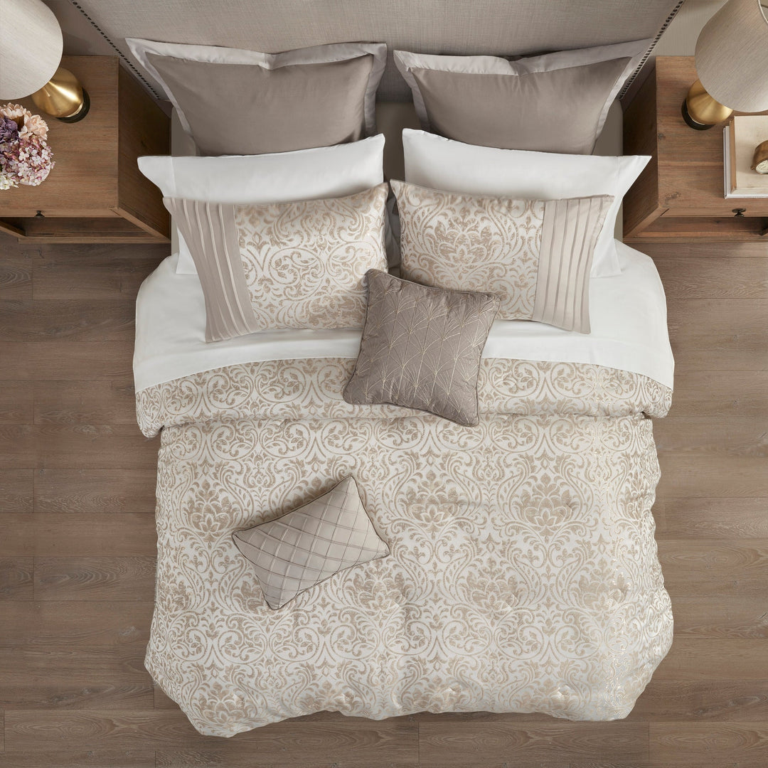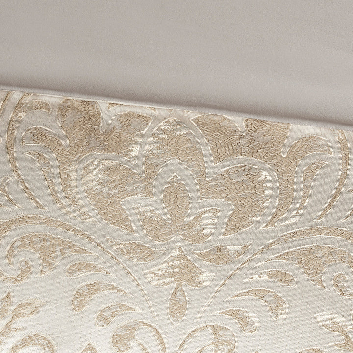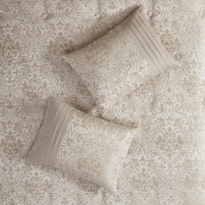 Transform your bedroom with the traditional style of the Layla Down 12 Piece Jacquard Comforter Set. The jacquard comforter and shams feature gold metallic thread woven into the all-over damask pattern, for a sophisticated look. Pleating details on the shams add dimension to the comforter set. Two coordinating Euro shams and a solid khaki bed skirt complement the jacquard comforter, while two decorative pillows add the finishing touches. Also included is a complete egg-shell white microfiber sheet set that adds a soft touch to the comforter set.