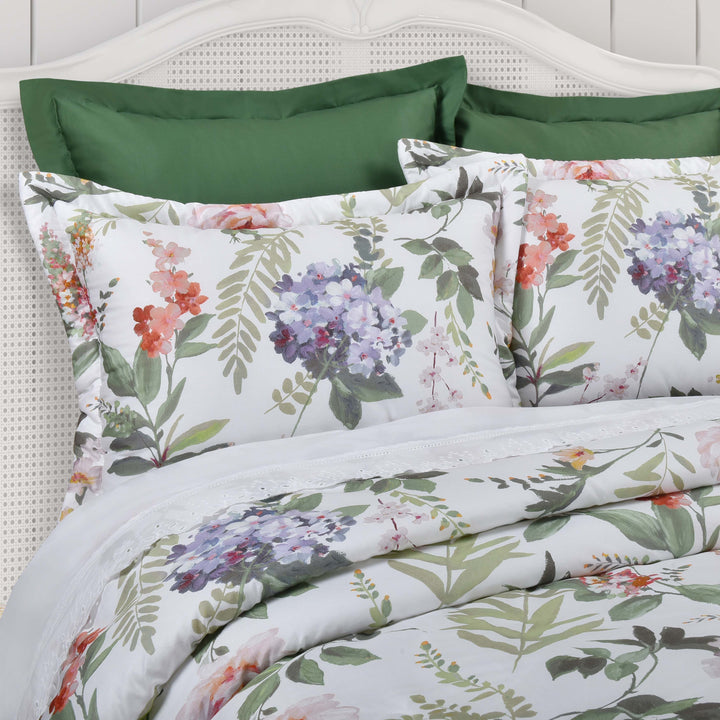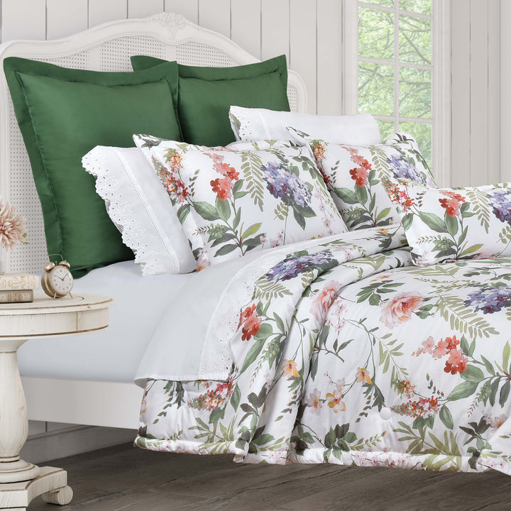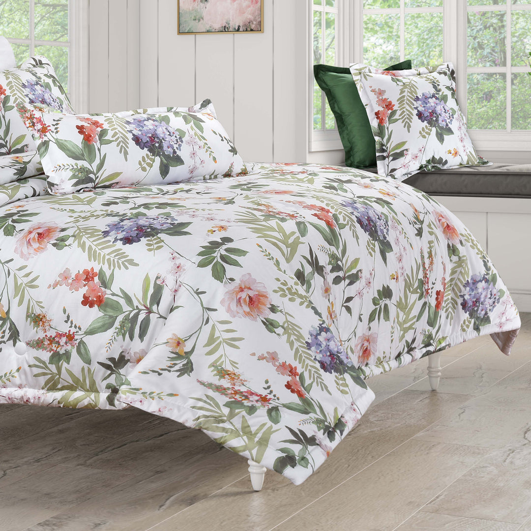 Our clara comforter set is the epitome of farmhouse chic. Its tossed floral watercolor pattern on a pristine white ground exudes a sense of tranquility and charm. The delicate florals, hand-painted in tones of sage green, lavender, and persimmon, create a soothing and inviting atmosphere that beckons you to unwind. The soft and breathable 100% cotton fabric ensures a comfortable night's sleep, year-round. It's a complete bedding ensemble that includes matching shams, padded for extra comfort, providing a cohesive look for your bedroom. The sham's hidden zipper closure and padded flange adds an extra touch of elegance to your bedding. Bring the outdoors inside with the gentle, watercolor florals, and create a welcoming oasis you'll love coming home to. Complete the look by adding the clara throw pillows and shams to the ensemble (each sold separately).
