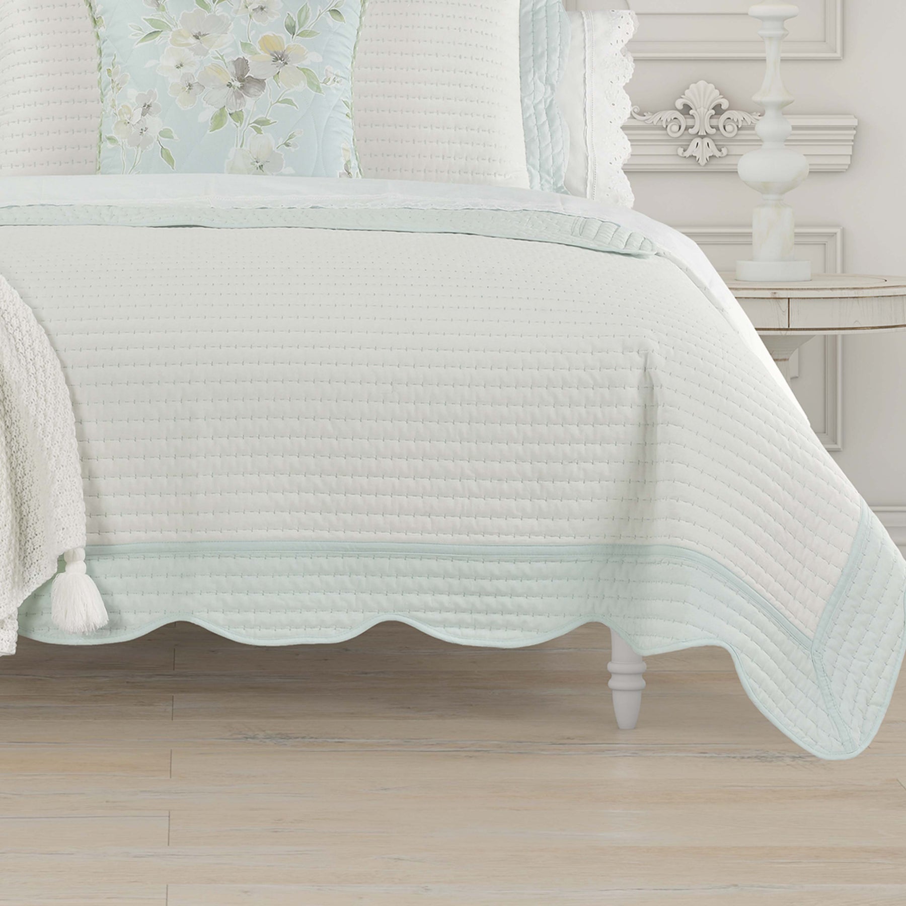Frame your bed with the relaxed scalloped border of the amherst quilt. Featuring a timeless farmhouse style white cotton center, with a 5‚¬� scallop trim on all four sides, with rounded corners for a beautiful drape look. Soft pre-washed cotton on both sides gives this lightweight layer an irresistibly smooth hand feel. Available in multiple color options to match your decor, a colored thread is used for the intricate channel quilt stitching, and the reverse fabric matches the border for a touch of color. Pair this quilt with the amherst quilt pillow shams, and it is easy to mix-and-match with euro shams and throw pillows from the piper & wright collections to create your own unique look.