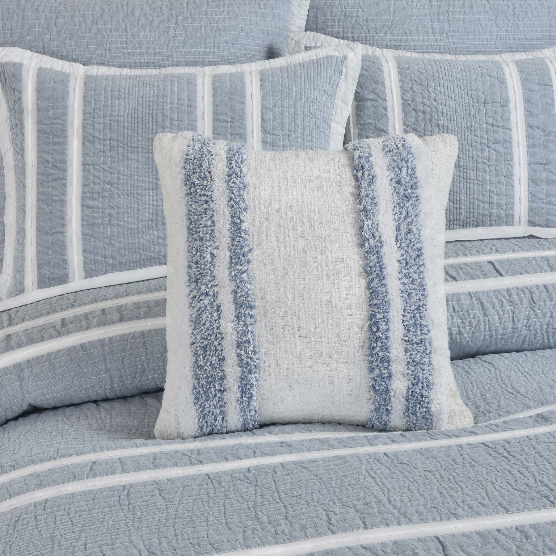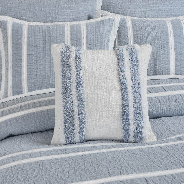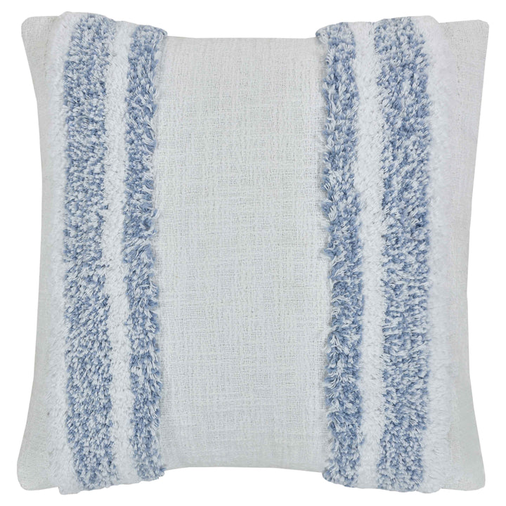 Crafted From Exceptionally Fine Cotton-Blend Yarns, The 18 Inch Decorative Throw Pillow Adds Relaxed Versatility And Effortless Layering To Your Décor. A Sky Blue Color Palette, Paired With Delicate Shine For A Touch Elegance Beautifully Adorn The Multi-Textured Handloom Stripe Construction. This Lovely Accent Adds Dimension To Your Space And Coordinates Beautifully With The Beachwood Pillow Collection.