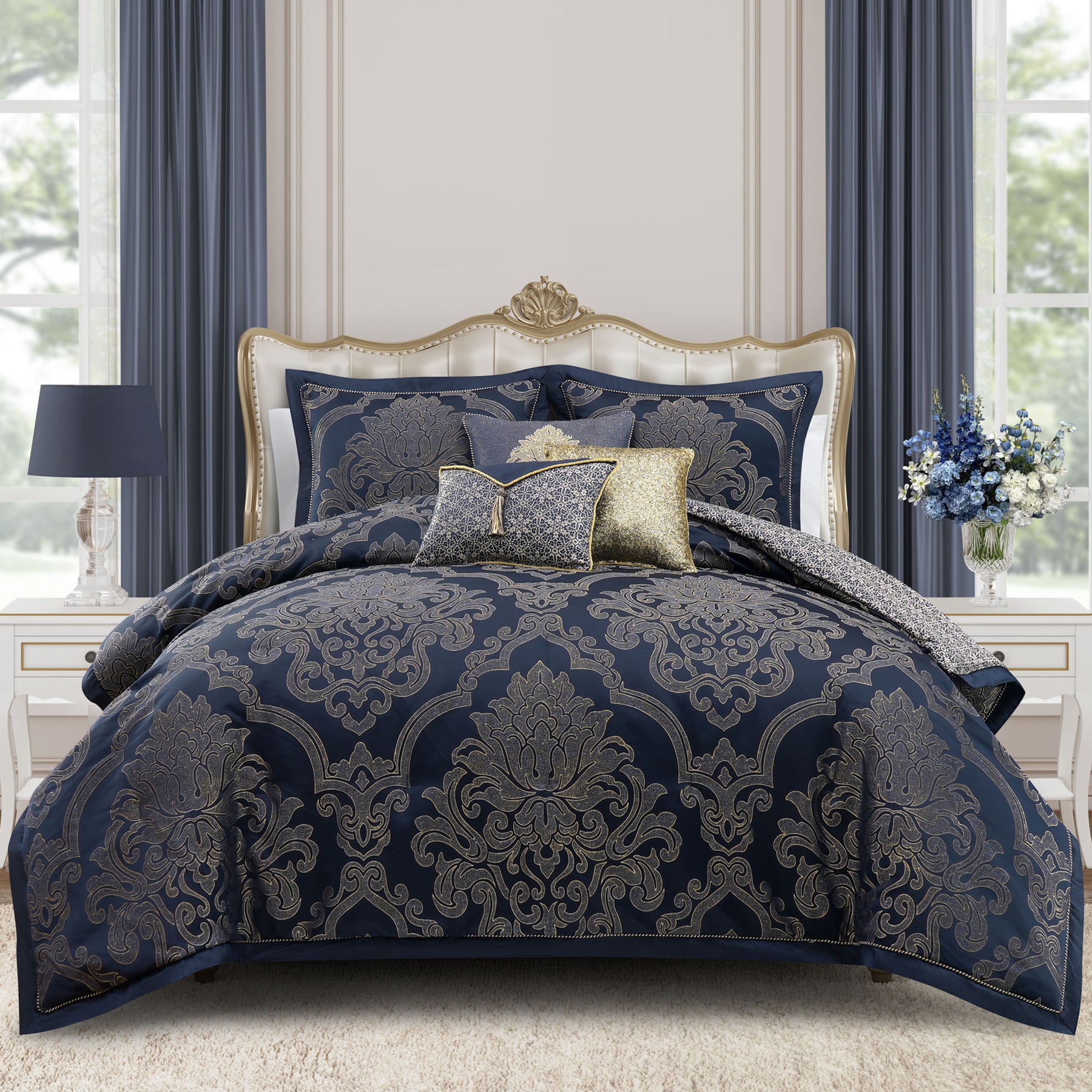 Dramatic and decadent, the Vaughn 3 Piece comforter set transforms any space with its rich navy backdrop and ornate gold detailing. Inspired by classic baroque elegance, the intricate patterns shimmer with every angle, creating a luxurious interplay of light and texture. This design evokes a sense of timeless romance: bold yet refined, regal yet inviting. Perfect for those who crave a bedroom that feels like a grand escape, Vaughn captures the essence of old-world charm with a modern, sophisticated twist. Versatile 3 Piece Design: Complete with a comforter and matching shams—ideal for creating a polished layered look while offering year-round comfort and effortless style Modern & Harmonized: Contemporary design meets timeless elegance with coordinated patterns and textures that elevate your bedroom with effortless style Hassle-Free Comfort: Enjoy a beautifully styled bed every day with a set designed for effortless care and lasting freshness.