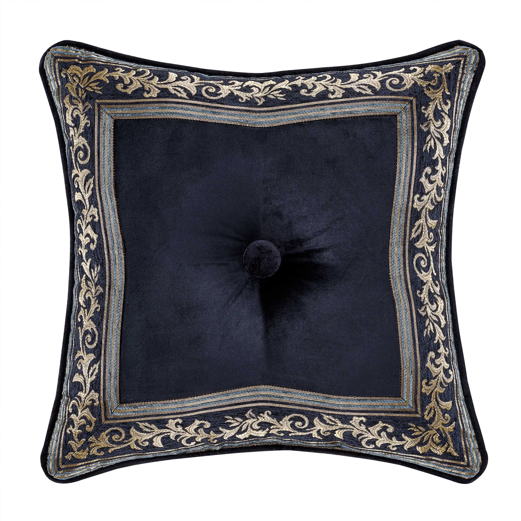 The middlebury 18" square decorative throw pillow is luxuriously designed with a lush indigo blue rayon cotton velvet fabric with a scroll stripe border that is mitered on all four sides, framing the outer edge of the pillow. A deeply tufted indigo velvet button adds a luxe detail and it reverses to a solid indigo¢ velvet for versatility. Pair this pillow with the middlebury bedding set for a complete elegant look.