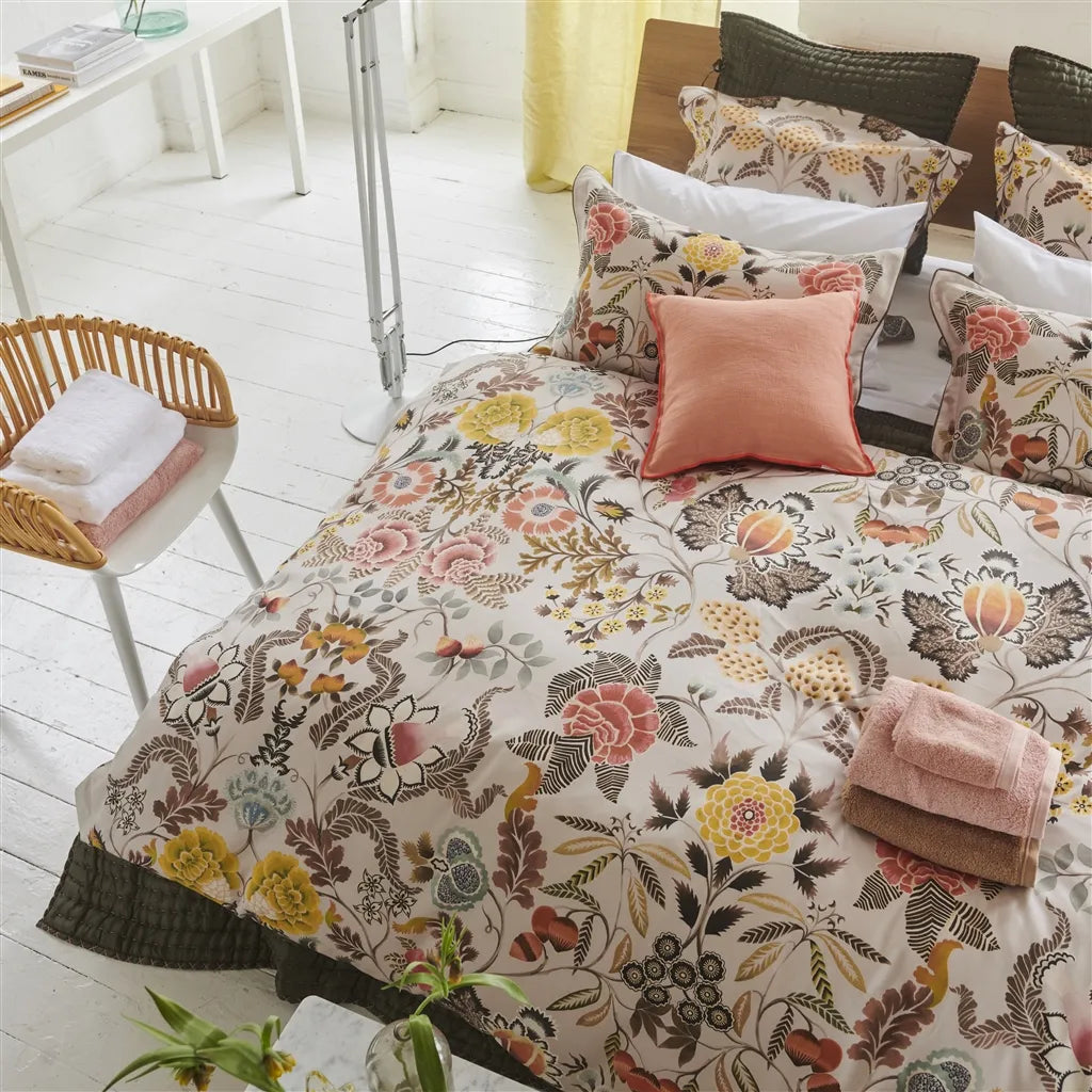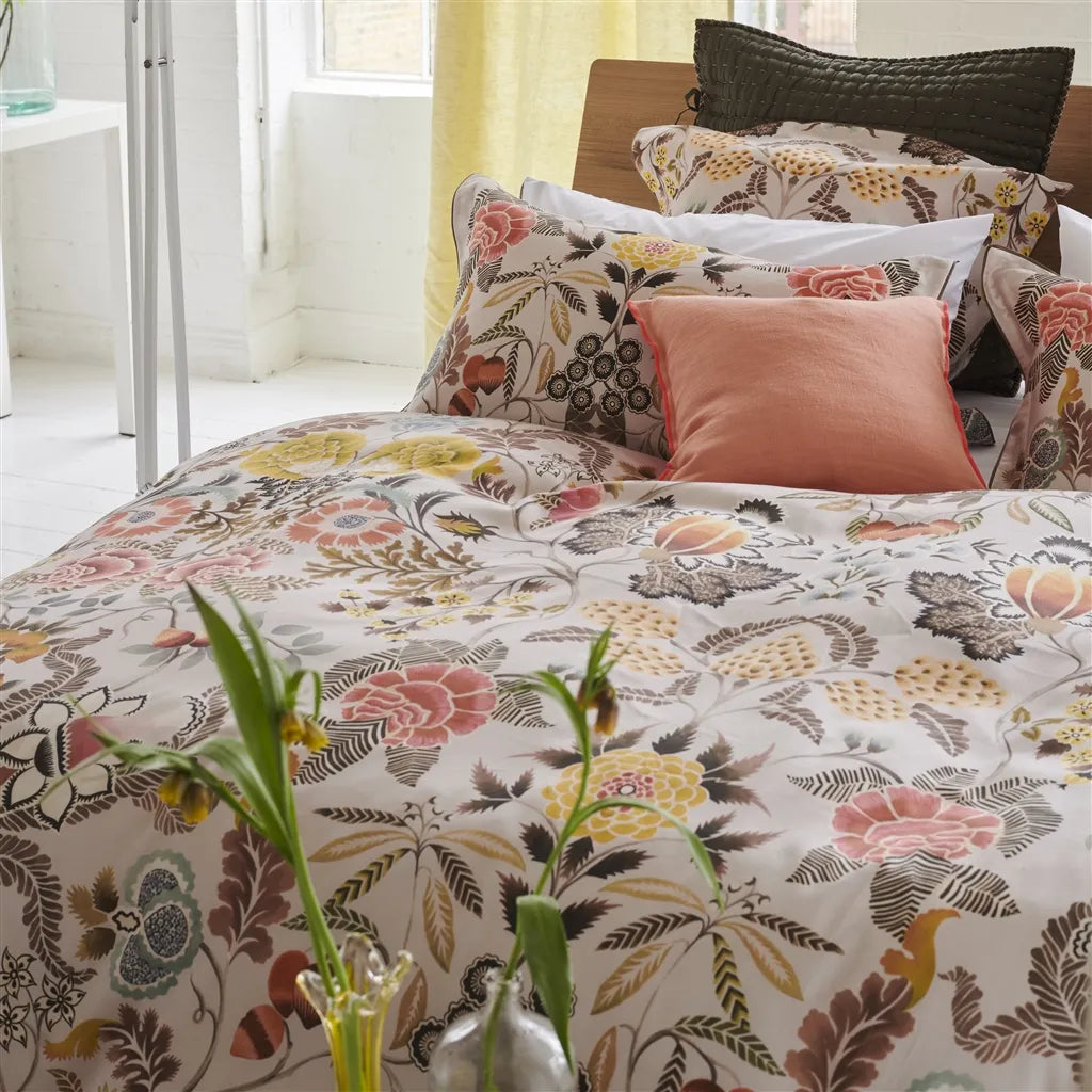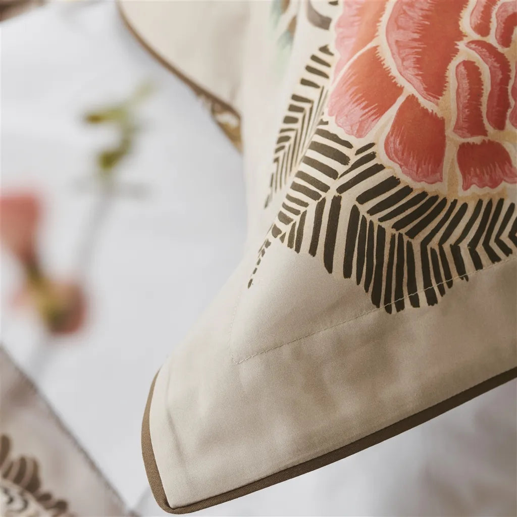 This luxurious Brocart floral duvet cover features vibrant graphic flowers and leaves, artfully arranged in a dramatic brocade inspired form on a warm neutral ground. This statement decorative printed bedding design is fully reversible to an all-over leaf pattern in soft sepia and nutmeg shades. Digitally printed onto luxurious 300 thread count cotton sateen. OEKO-TEX Standard 100 approved for added confidence.
