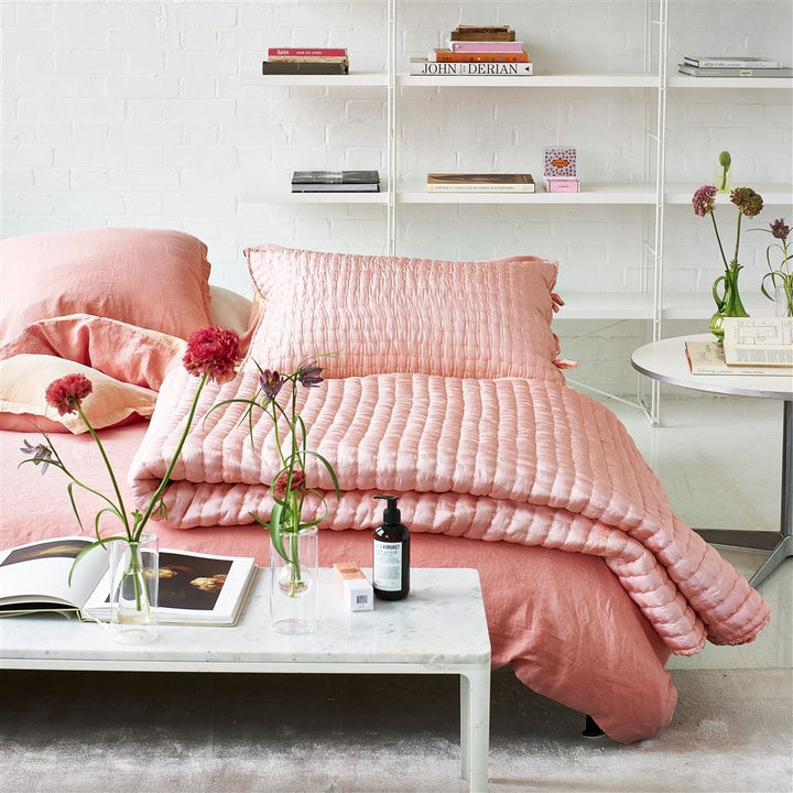 Luxuriously soft and lightweight, 100% silk quilt in blossom and peach. Hand-quilted and finished with a contrast cross stitch detail - a sophisticated complement to any bedroom scheme.