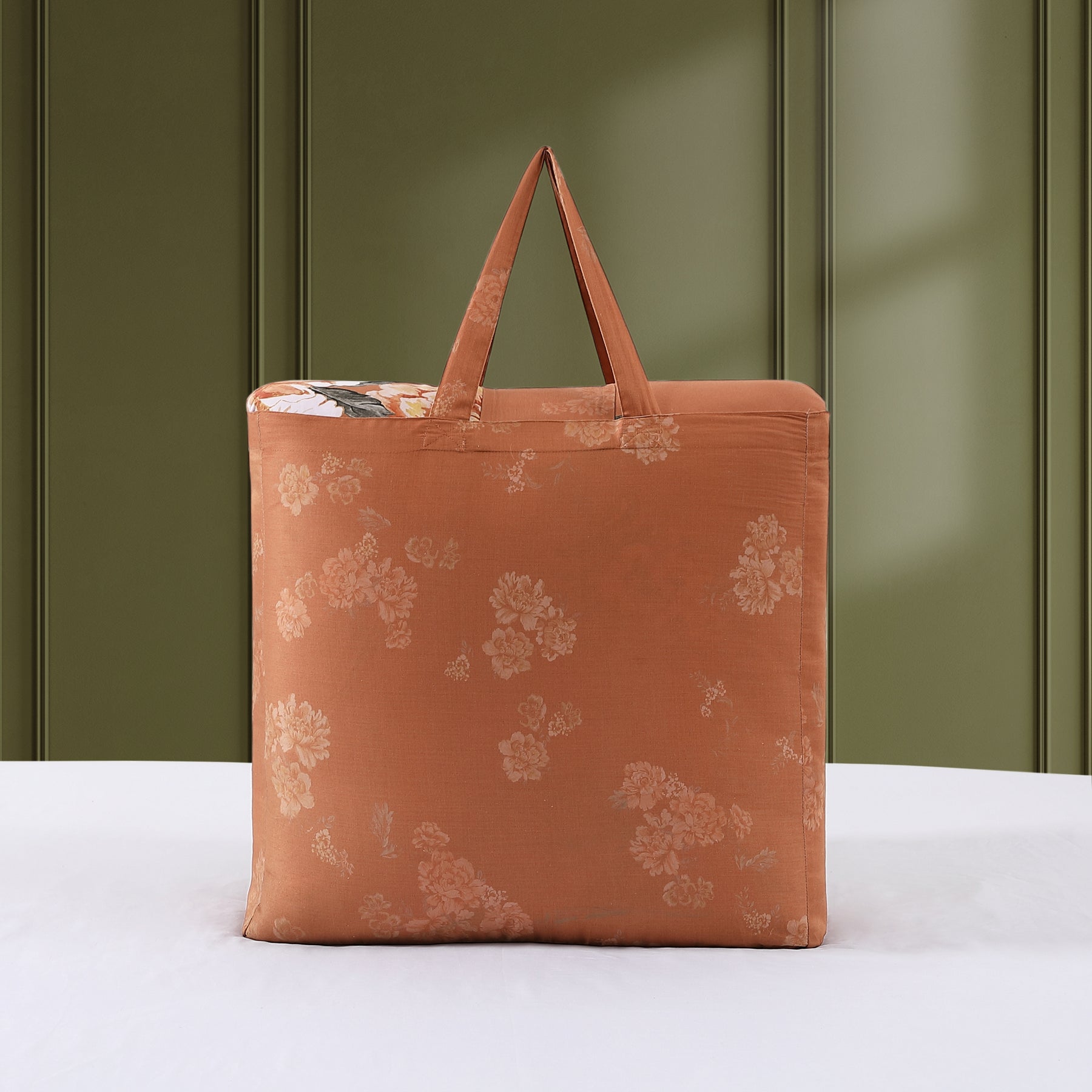 The terracotta, apricot and warm green tones of the Rossana 5 Piece Comforter Set bring a peace and serenity to this Asian inspired floral pattern. A unique and ornate border frames this print, emphasizing its beauty. The reverse side features soft, tonal flowers tossed randomly. To enhance the printed shams and comforter, there is one pillow with a stunning, fully embroidered group of flowers and a second printed pillow showing off the border design. The comfy 100% cotton sateen comforter set includes 2 shams, 1- 18" x 18" pillow and 1- 22" x 12" pillow. As a bonus, the set is packaged in a reusable self-fabric tote.