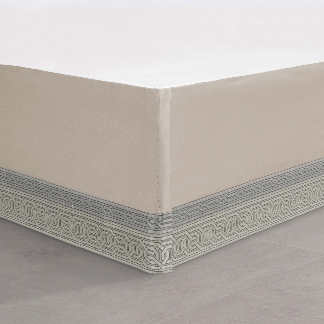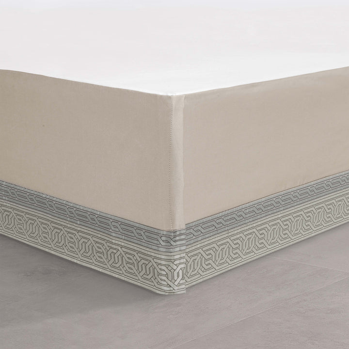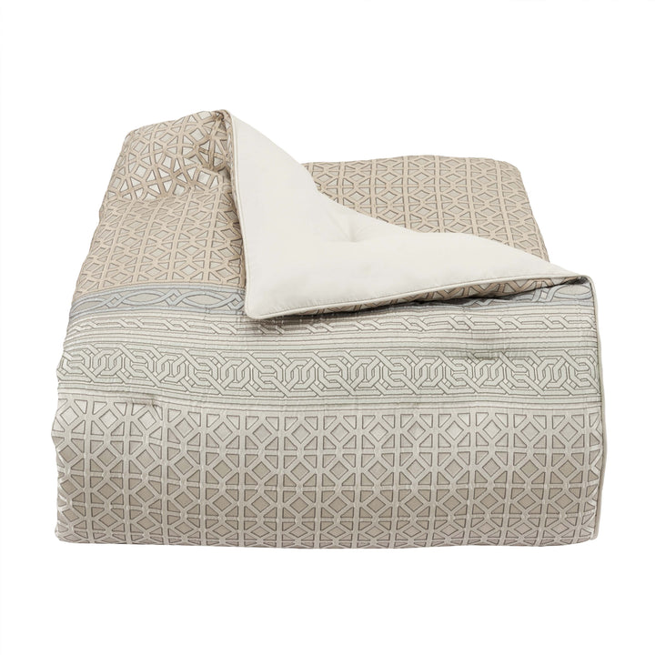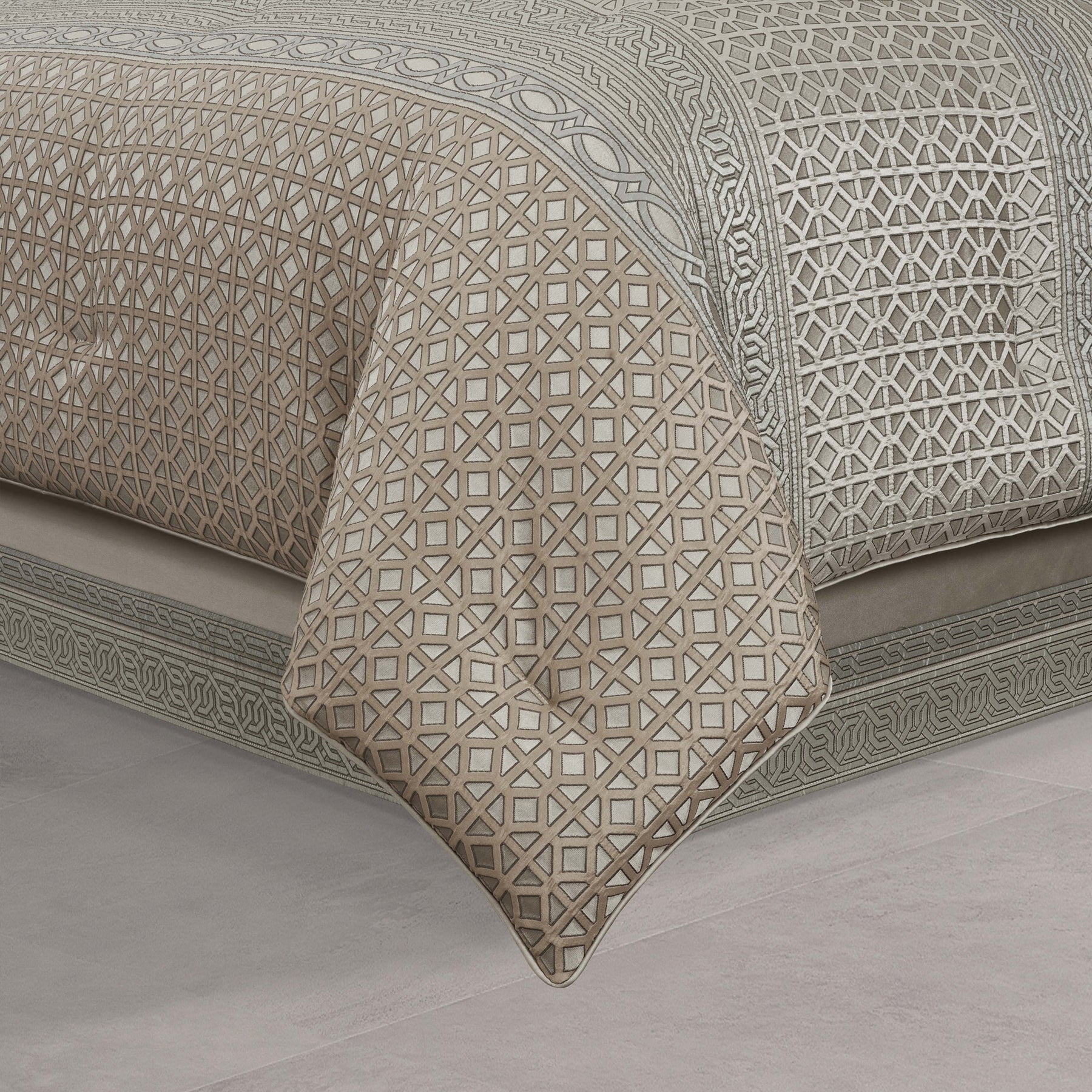 Modern quilted engineering gives the alaro comforter set a luxurious multi-textural appearance. The shimmering spa, silver, and gold fabric is embossed with inlaid techniques, combined with a bordered bed runner with harmonious geometric patterns to create a unique layered illusion. The tailored bed skirt features a split-corner construction and the pillow shams are meticulously cut and sewn, positioning the pattern perfectly in the center. Pair this bedding collection with the alaro throw pillows, euros, and window treatments for a complete look.