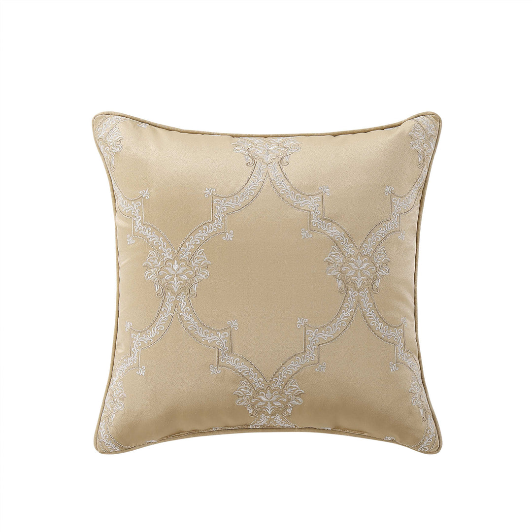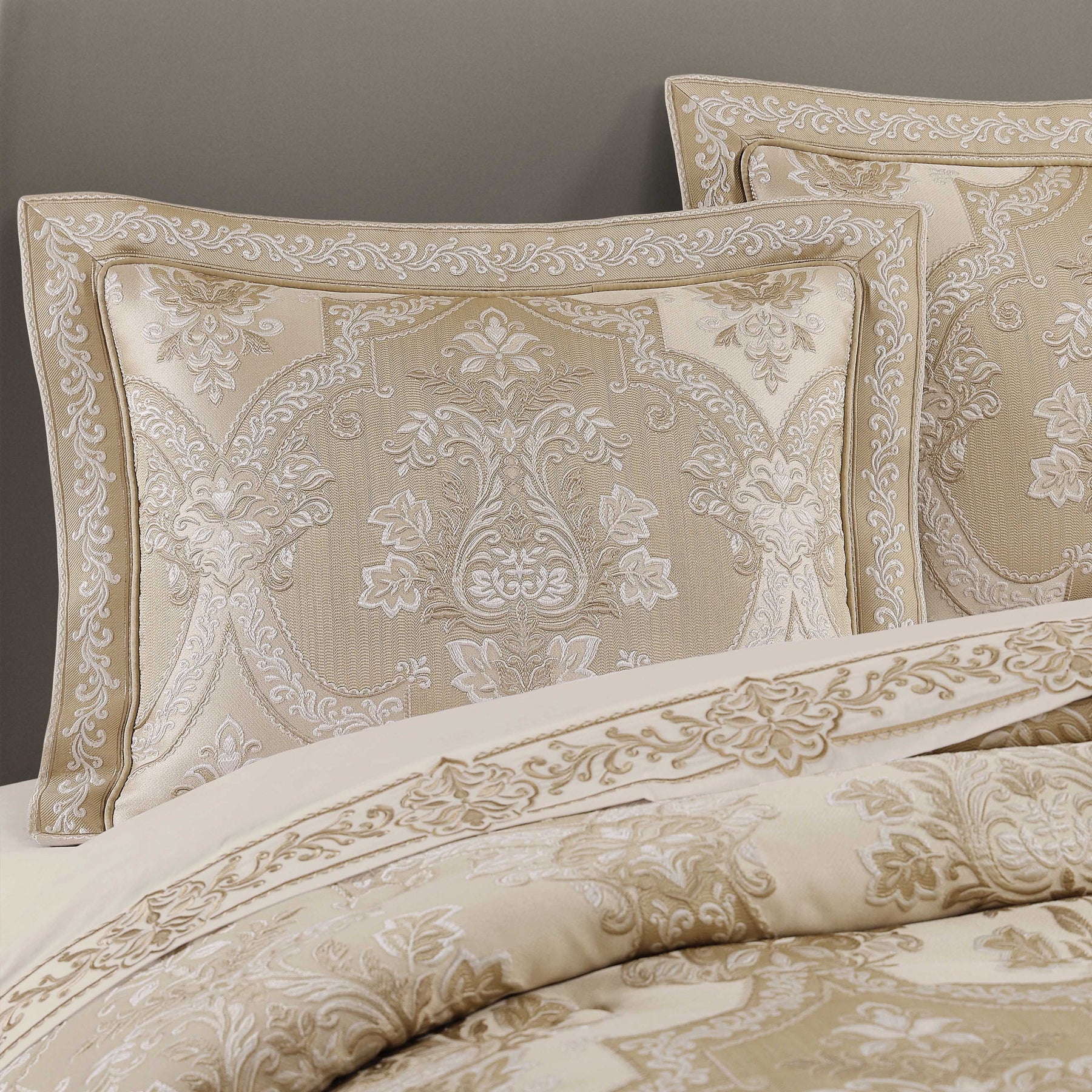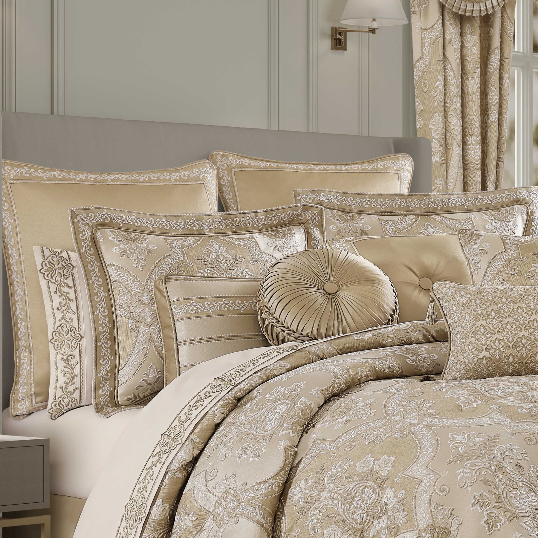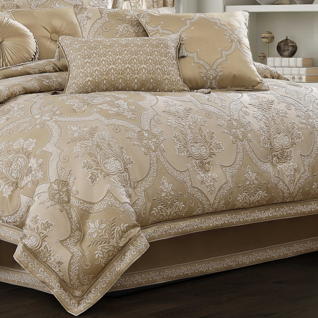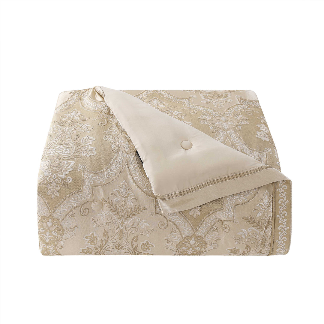 The sondra comforter set features a stunning traditional woven damask paired with an intricately designed herringbone weave. The soft gold colors in this bedding ensemble are a great accent to any bedroom. The comforter is generously oversized and overfilled and finished with solid piping. Also included are 2 coordinate pillow shams, with a tailored bedskirt which adds the finishing touch. Add the sondra accessories and window treatments to complete the look.