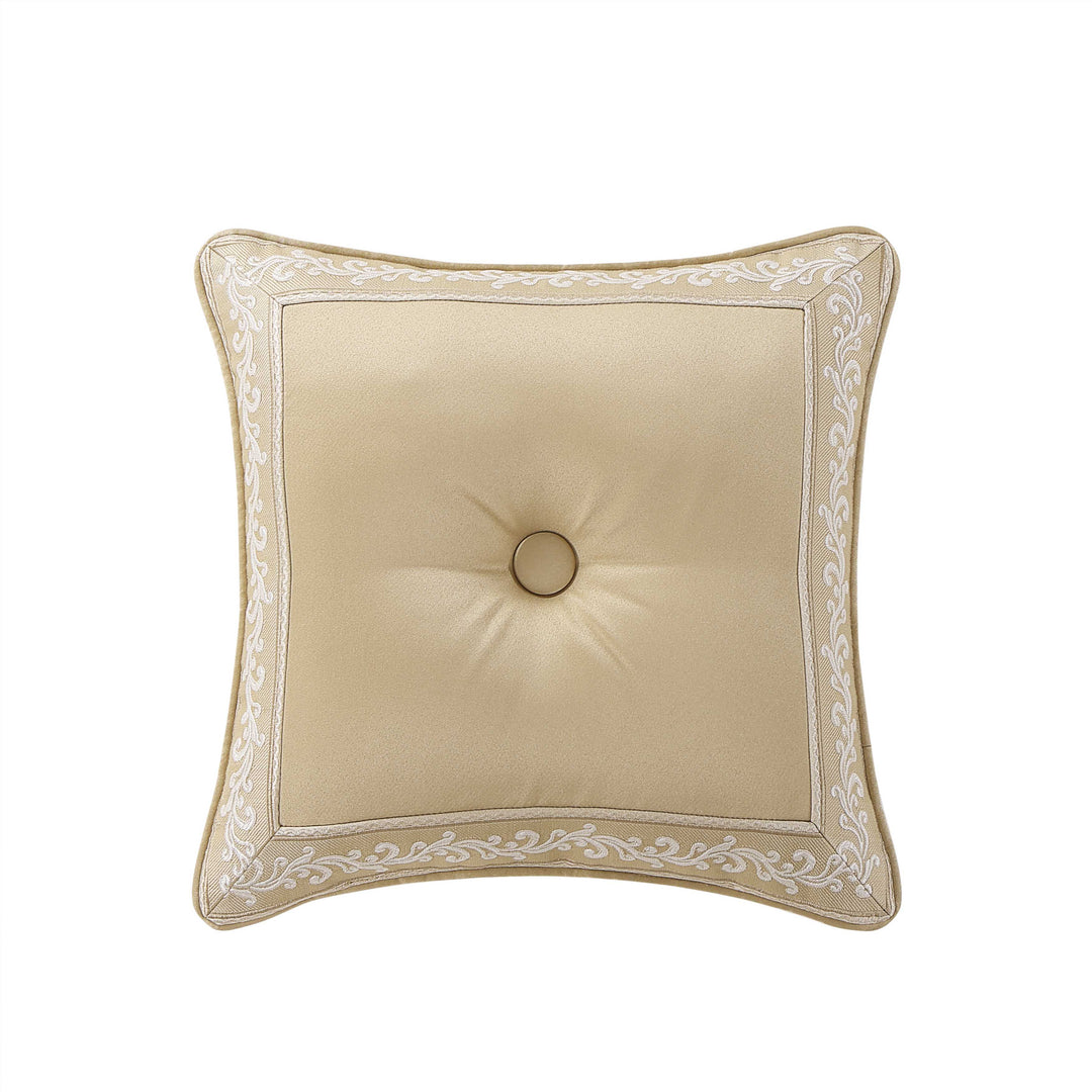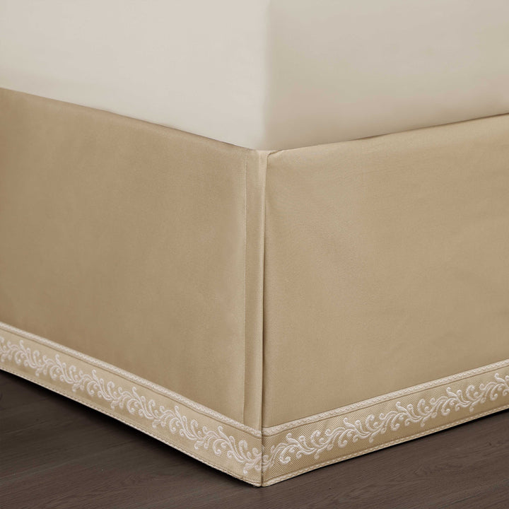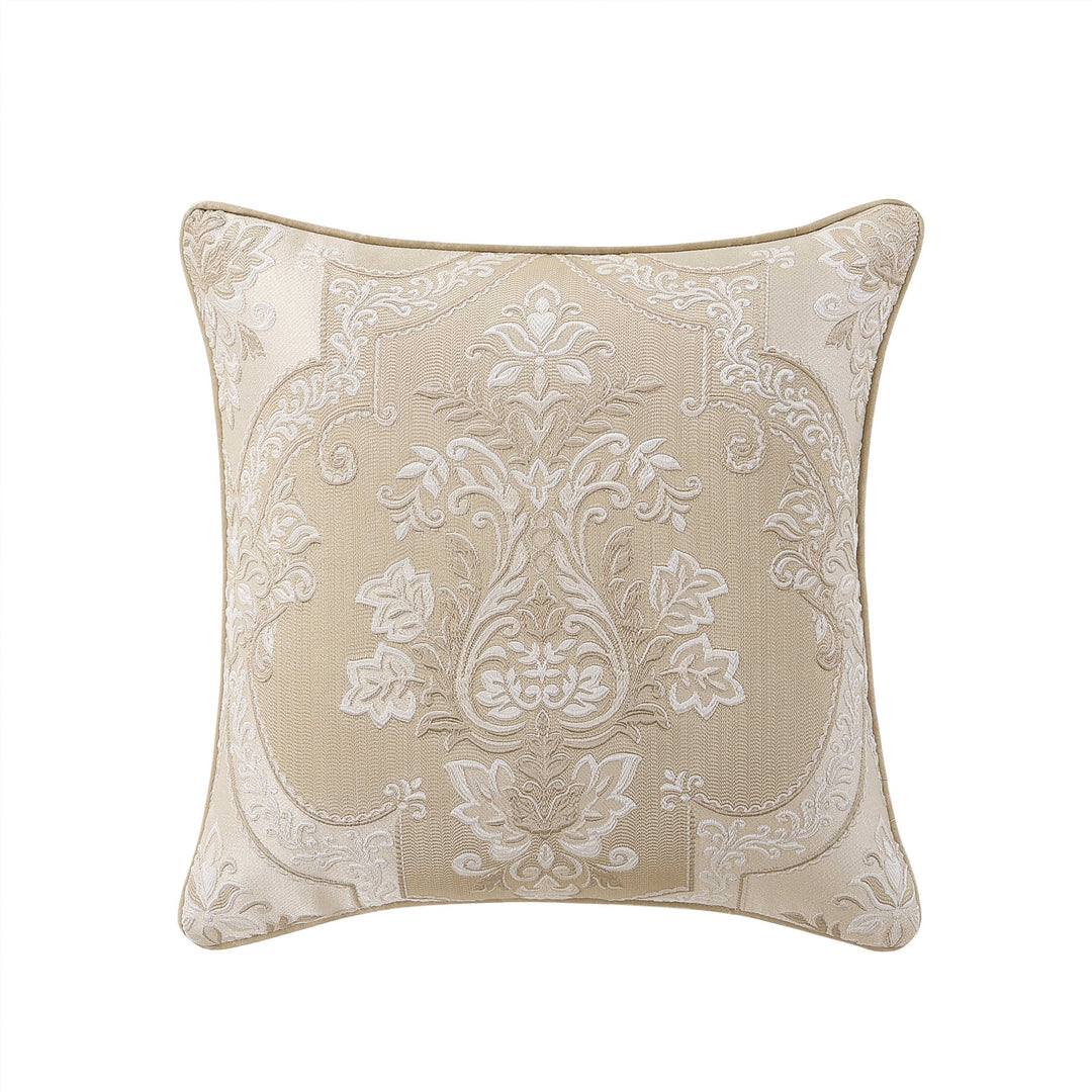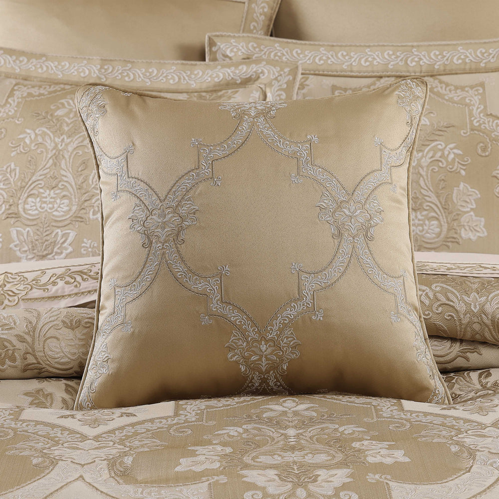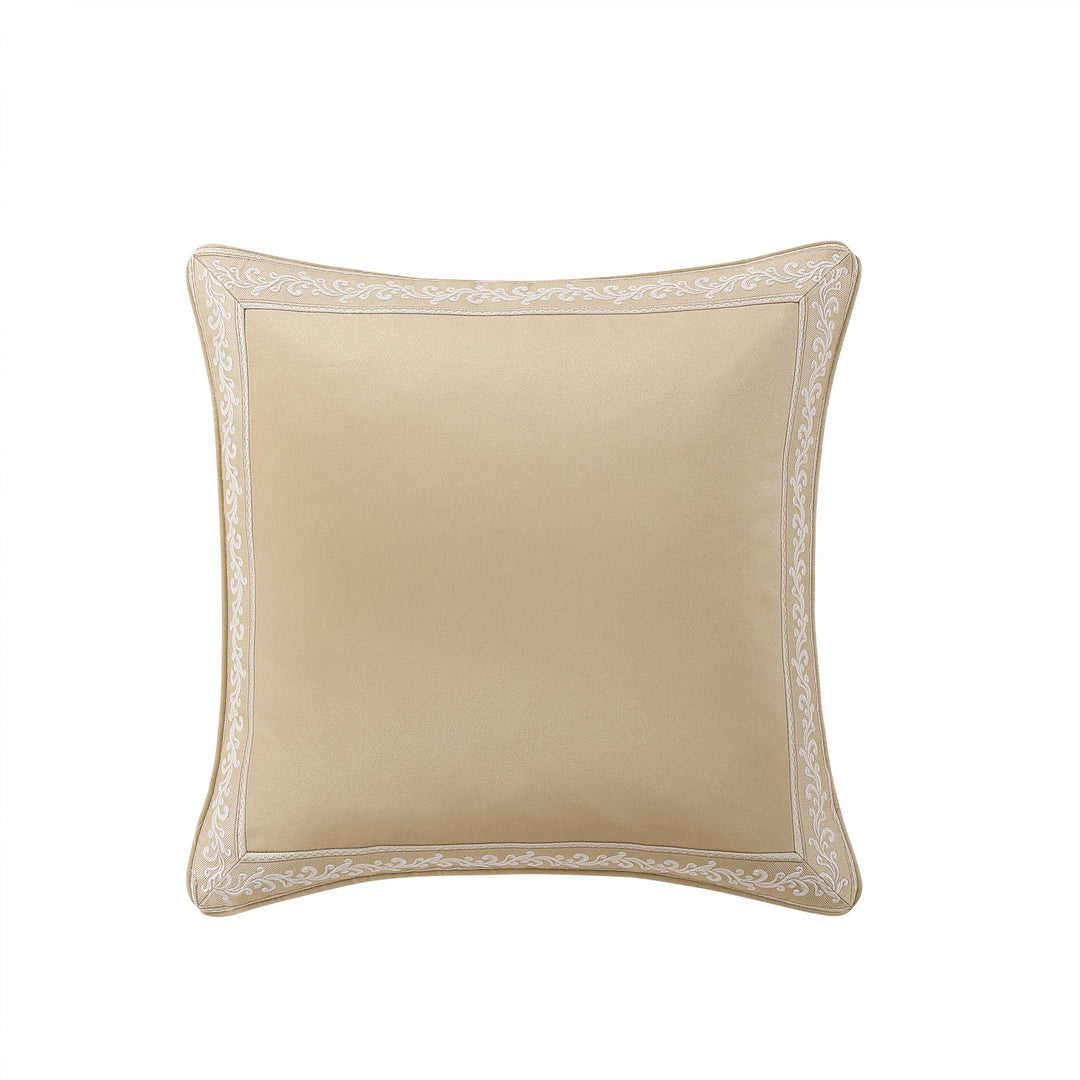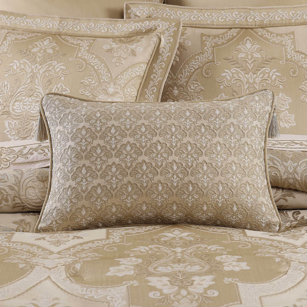The sondra comforter set features a stunning traditional woven damask paired with an intricately designed herringbone weave. The soft gold colors in this bedding ensemble are a great accent to any bedroom. The comforter is generously oversized and overfilled and finished with solid piping. Also included are 2 coordinate pillow shams, with a tailored bedskirt which adds the finishing touch. Add the sondra accessories and window treatments to complete the look.
