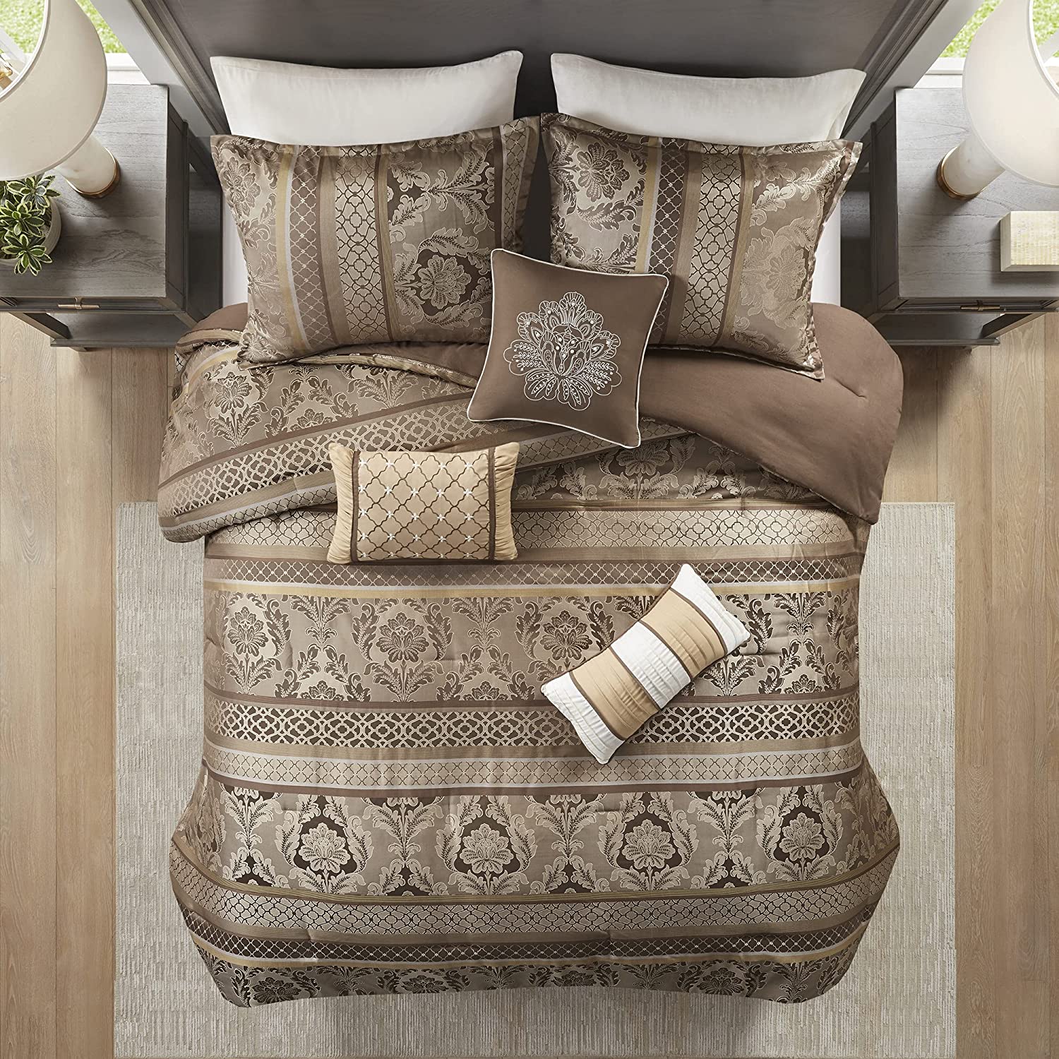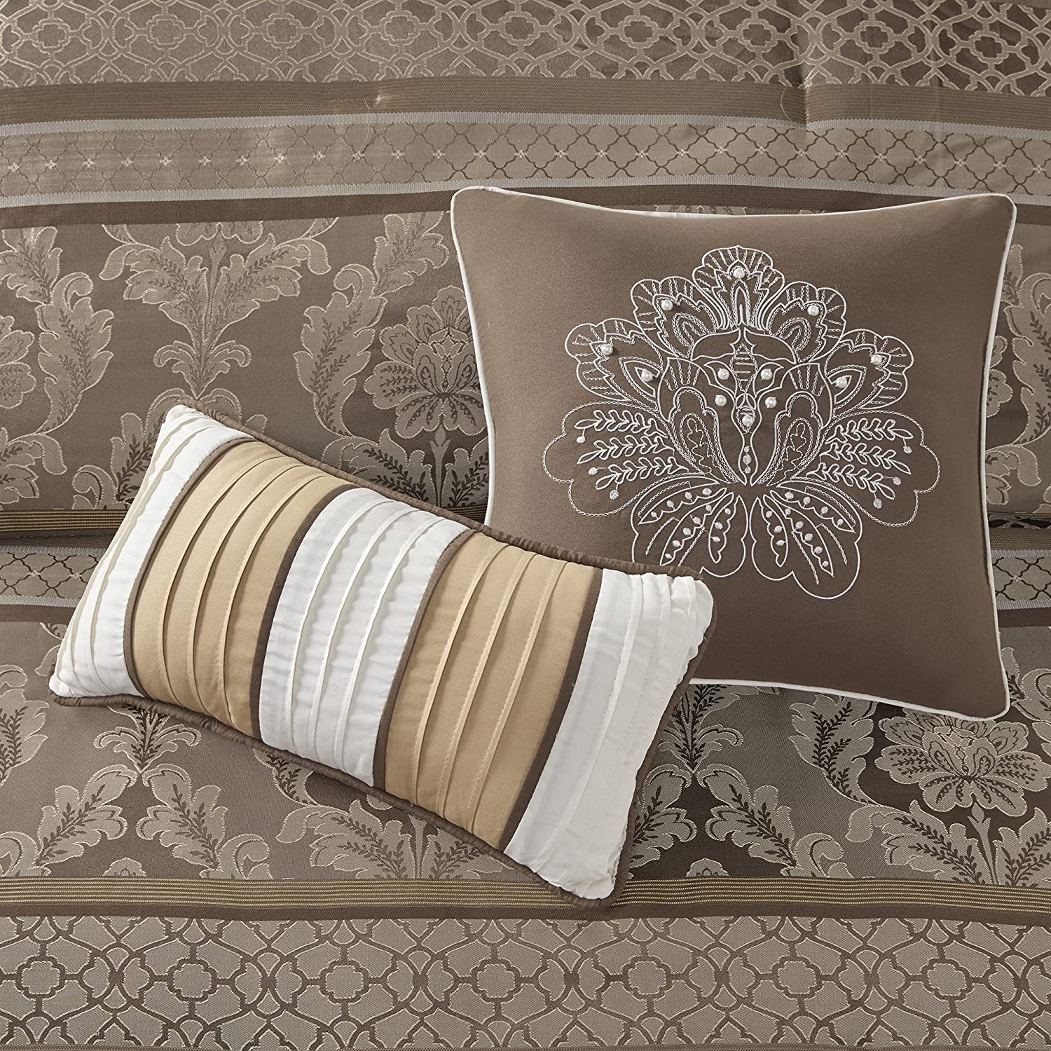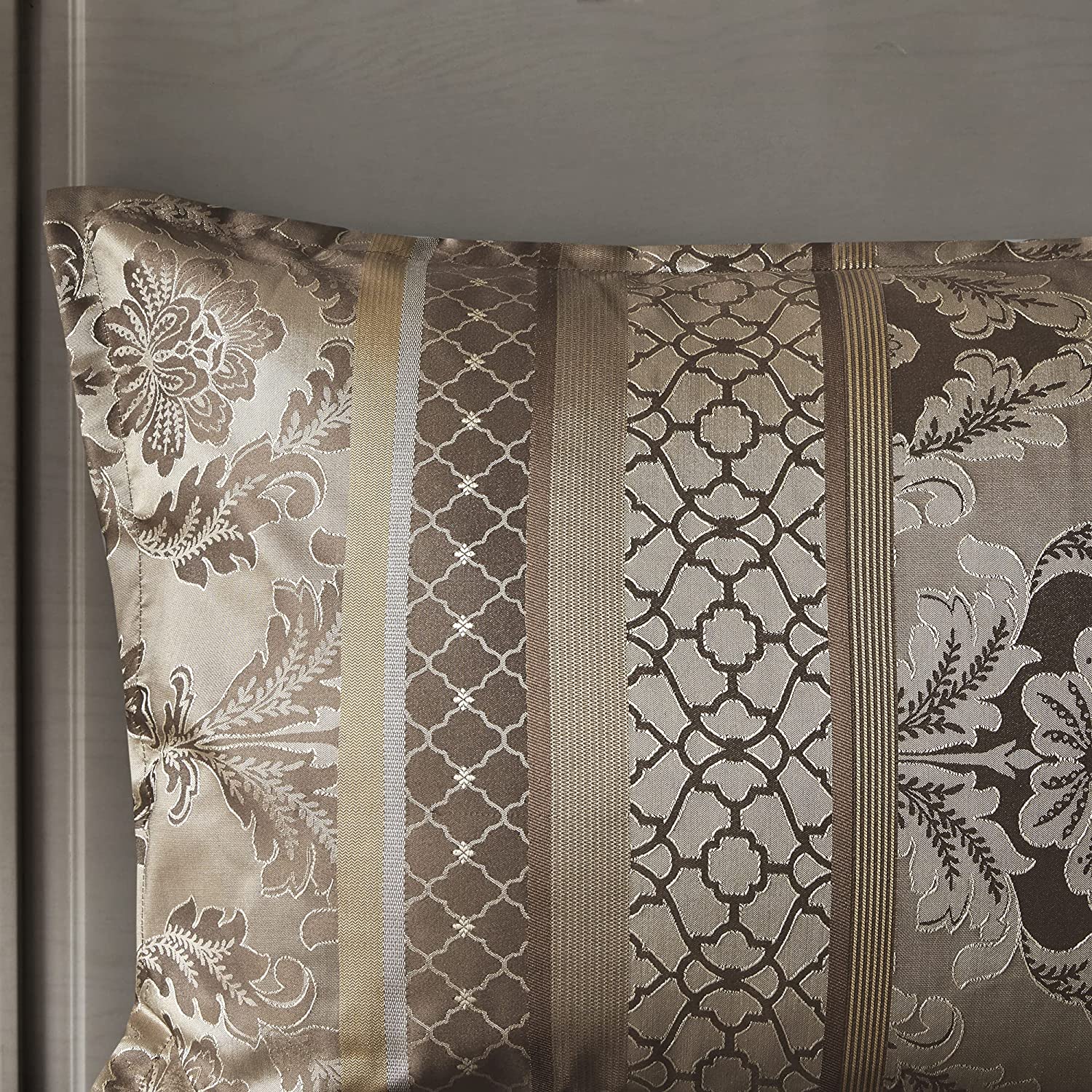 To add a touch of richness to your current décor, the Classic Chain 7 Piece Comforter Set offers a luxurious update to your room. Made from polyester jacquard, the comforter and shams share leaf, striping and iroork motifs that are accentuated by elegant stitching. Pops of gold are also used throughout this collection adding a lavish feeling to your decor. Three decorative pillows feature pleating and embroidery details that correspond back to the comforter, while a rich bedskirt helps bring the entire look together.