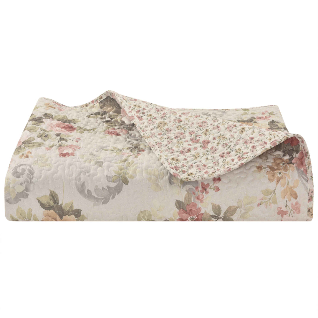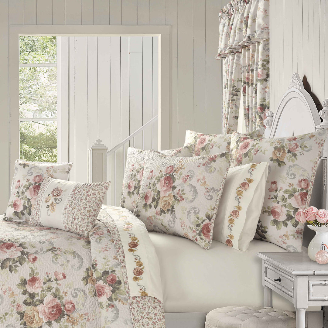 The chablis quilt set features a classic floral motif pattern, and a layer of added dimension with a small ditsy floral coordinate on the reverse. The shades of rose and hints of gold are enhanced by earthy taupes and green leaves. Matching pillow shams are also reversible and have a hidden zipper closure for a fine finish. The chablis quilt ensemble surely adds an inviting farmhouse serenity to your home decor. Add the throw pillows, euro shams, and the window treatments to complete the look.
