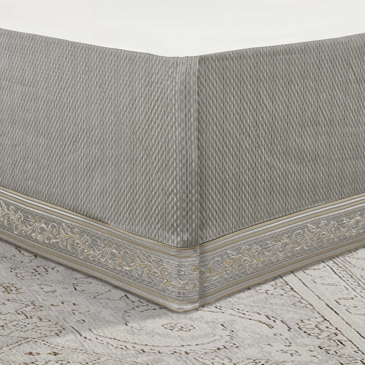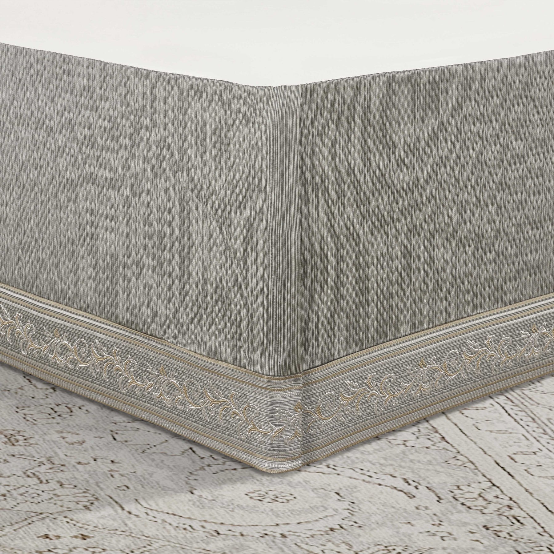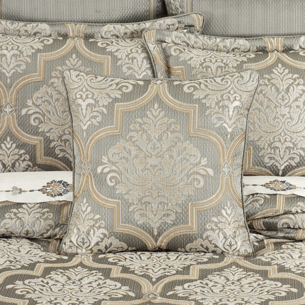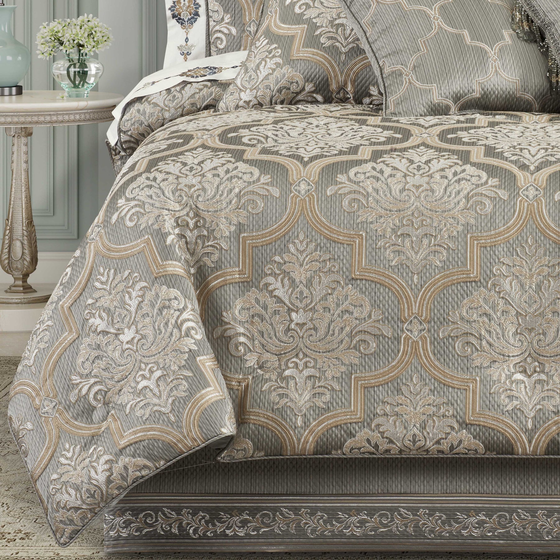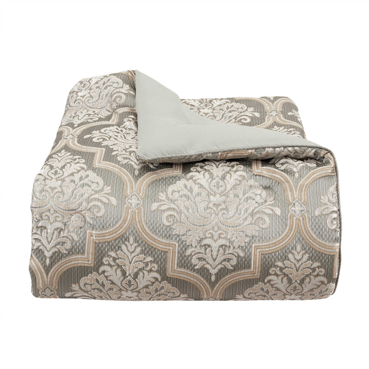 Timeless european elegance is executed within every detail of the martina 4 piece comforter set. An elegant diamond matelassé base in soft sage, is paired with a classic damask pattern, which incorporates a unique weave technique, giving the appearance of multiple layers in soft sage and neutral colors. A small satin piping finishes the lofty and oversized comforter that reverses to a plush solid fabric. Two padded pillow shams featuring a coordinate damask pattern and a split-corner bedskirt, beautifully complete the set. Pair this bedding collection with the martina throw pillows, euros, and window treatments to add luxury and opulence to your bedroom.