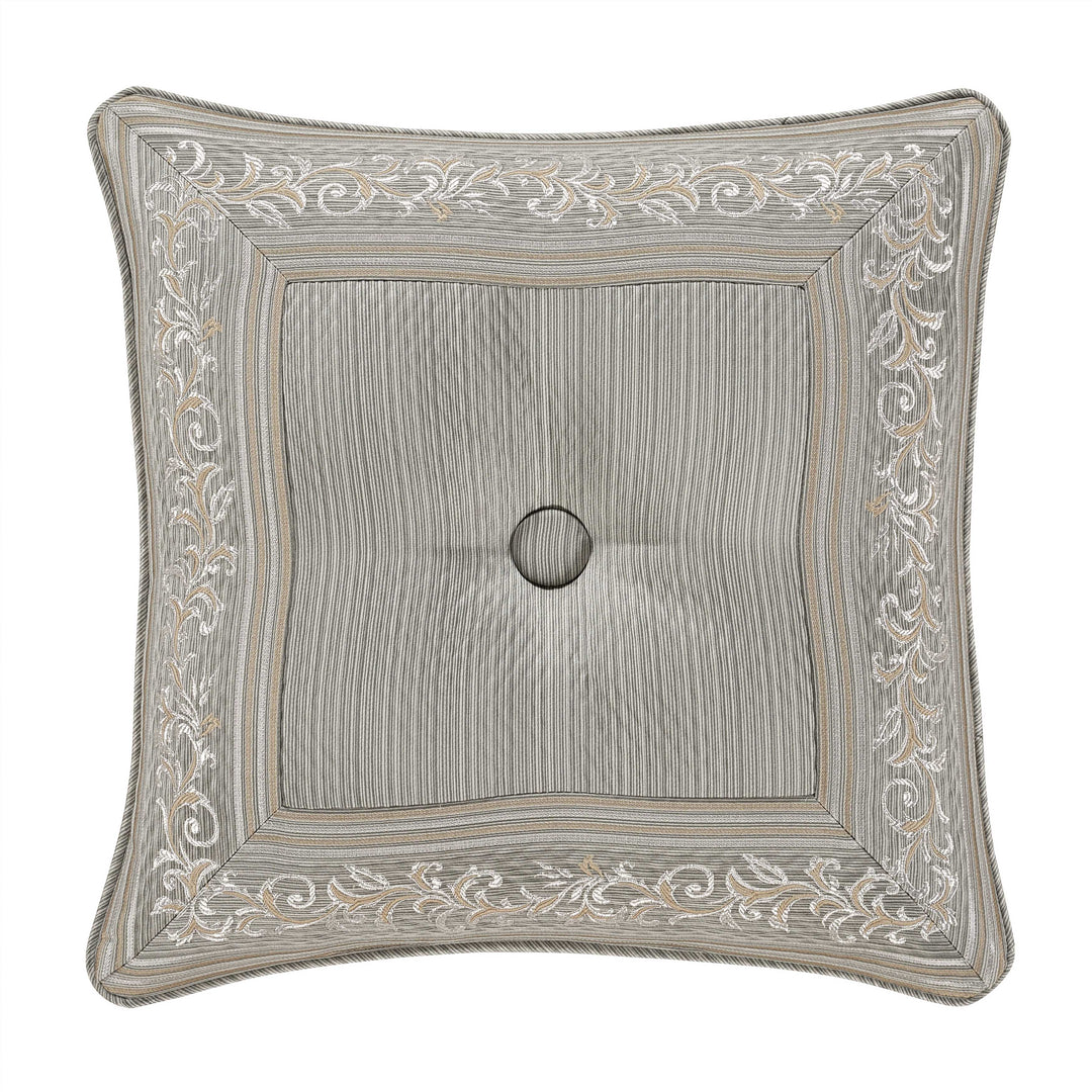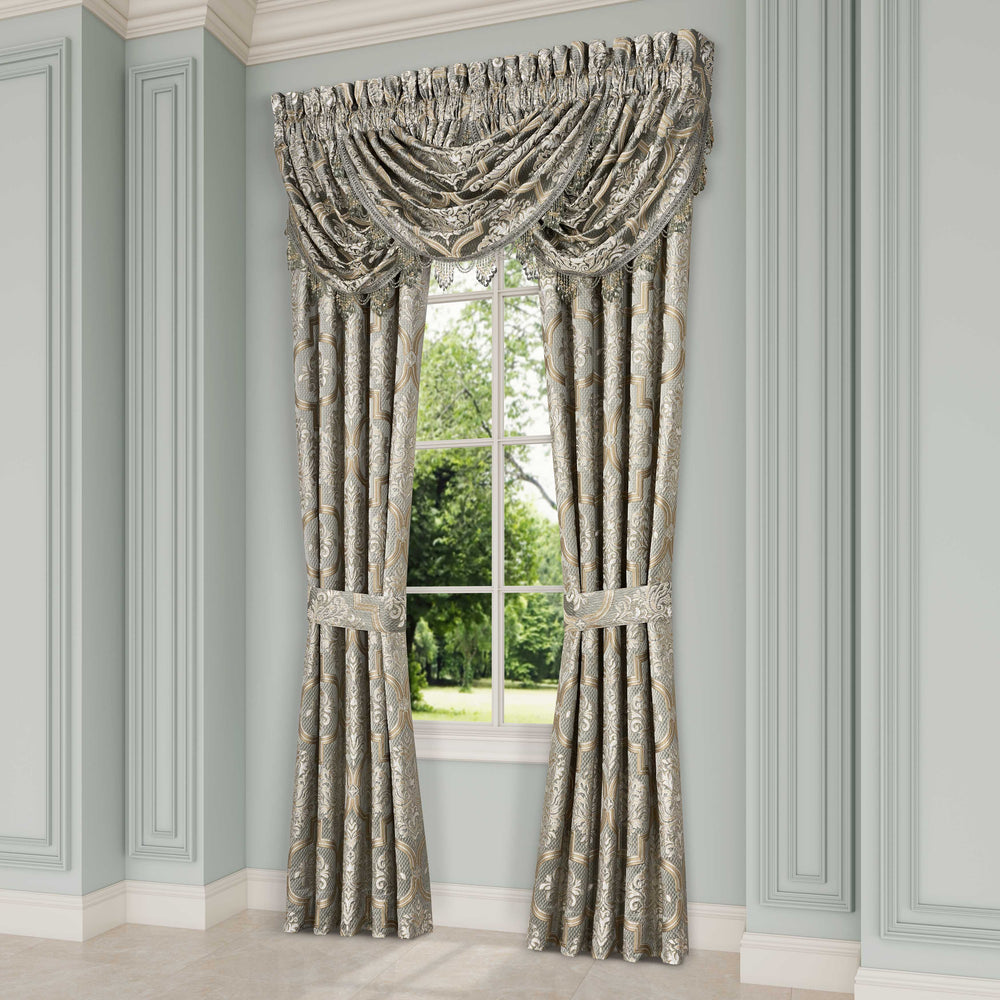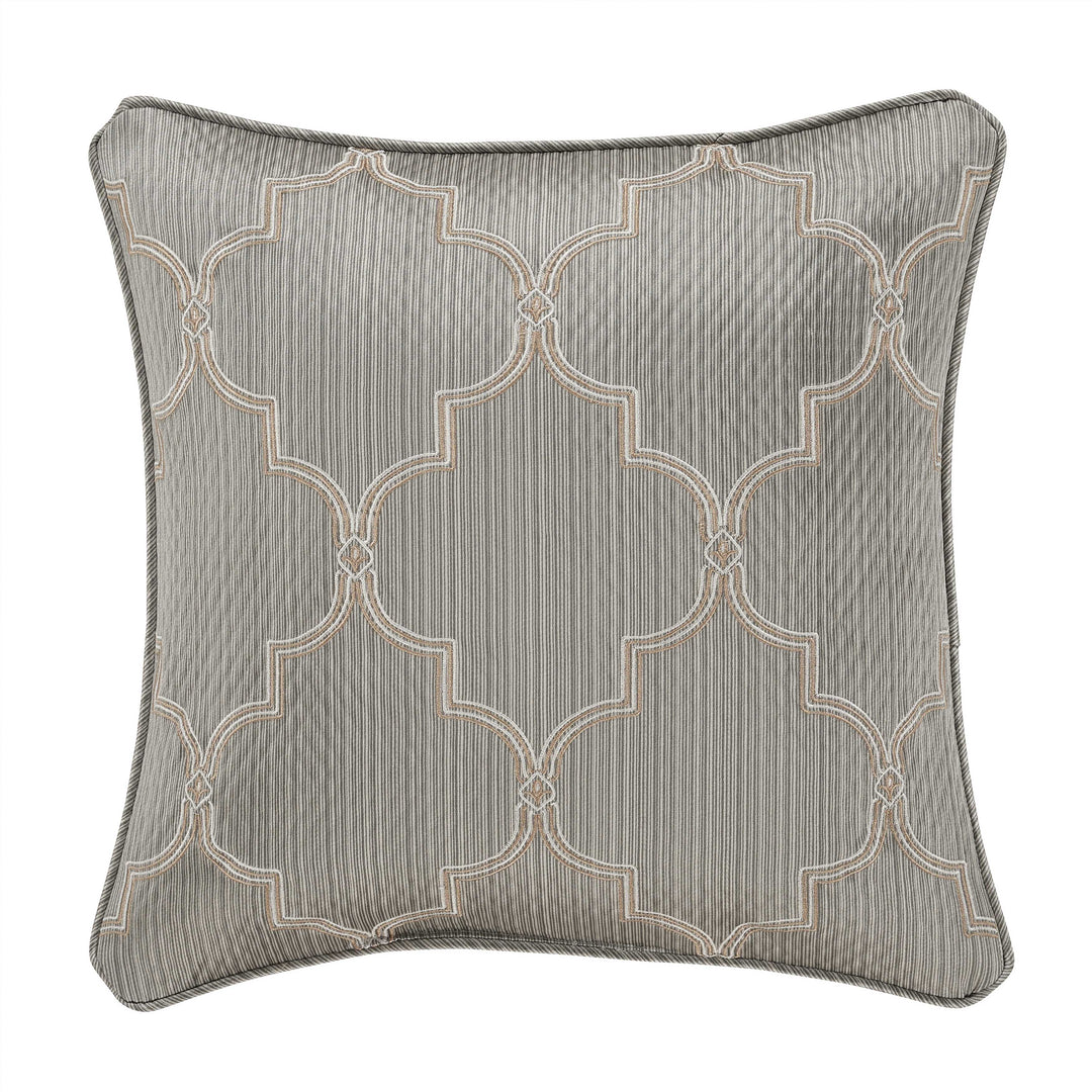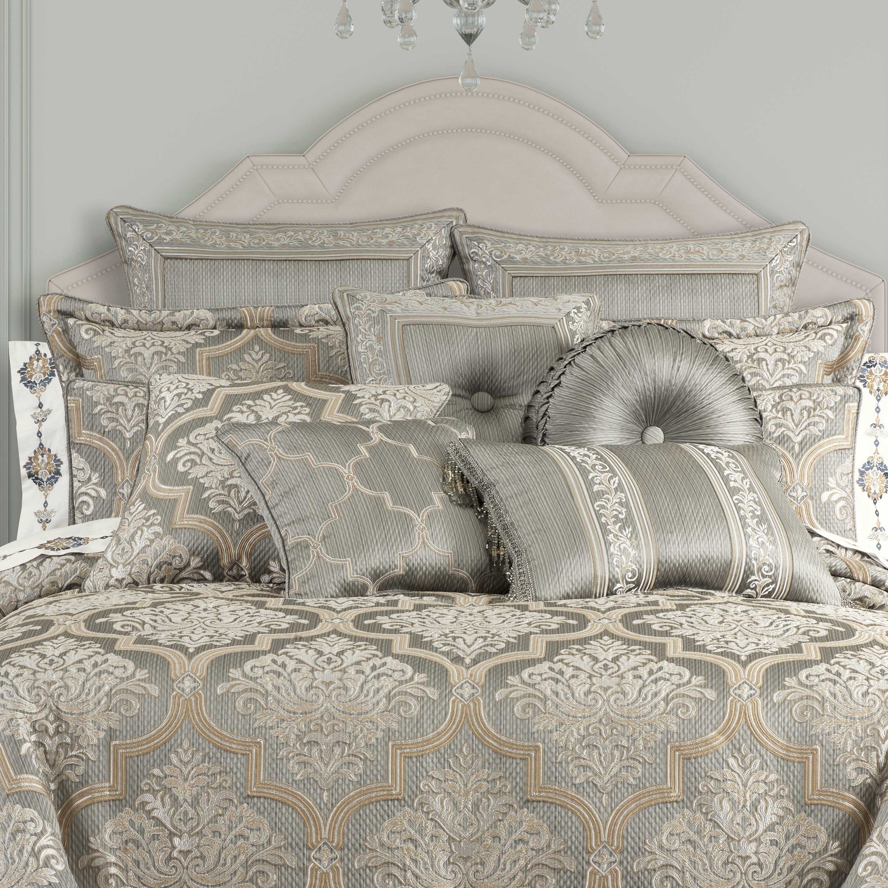 Timeless european elegance is executed within every detail of the martina 4 piece comforter set. An elegant diamond matelassé base in soft sage, is paired with a classic damask pattern, which incorporates a unique weave technique, giving the appearance of multiple layers in soft sage and neutral colors. A small satin piping finishes the lofty and oversized comforter that reverses to a plush solid fabric. Two padded pillow shams featuring a coordinate damask pattern and a split-corner bedskirt, beautifully complete the set. Pair this bedding collection with the martina throw pillows, euros, and window treatments to add luxury and opulence to your bedroom.