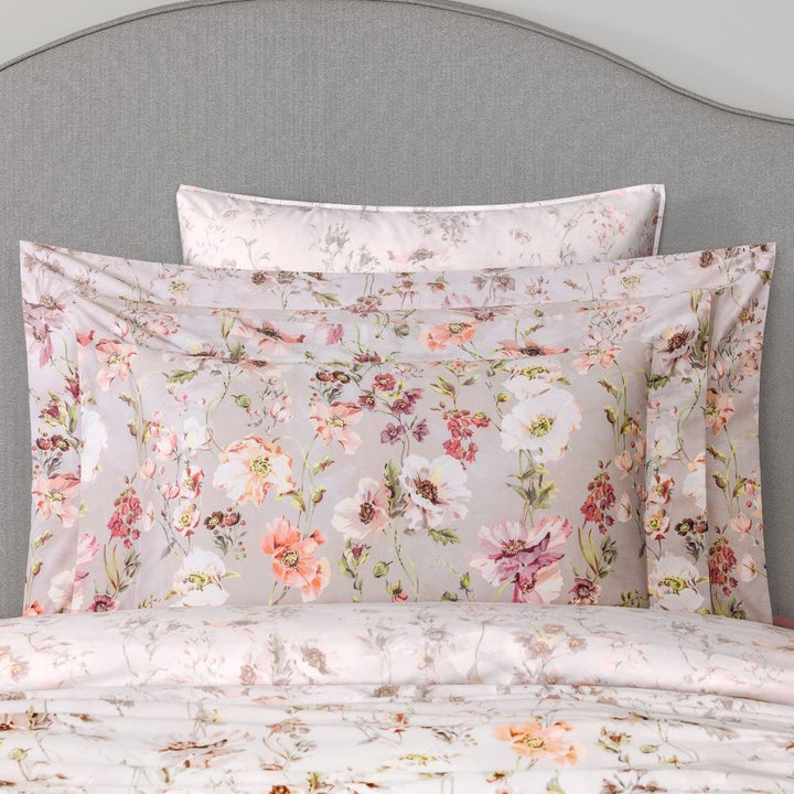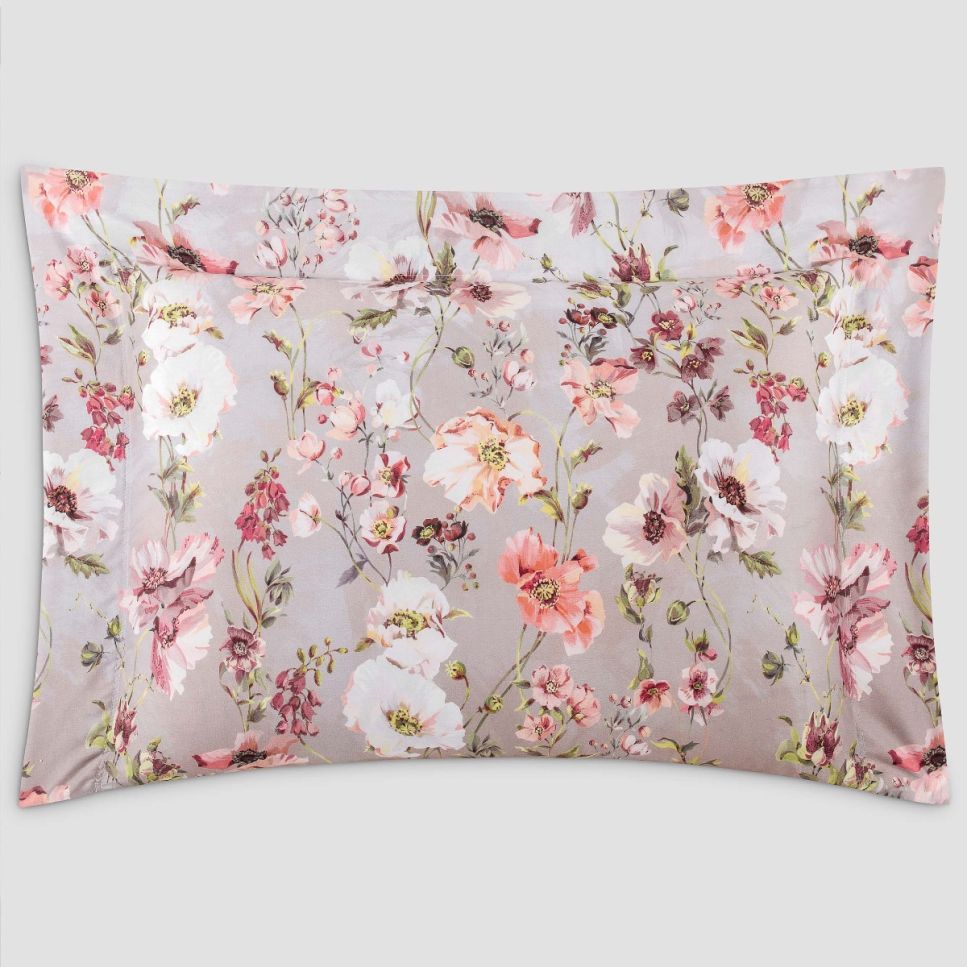 Classic cut, bright floral print. The pillowcases have a wide decorative purfle on three sides. The reverse side of the duvet cover is plain white.