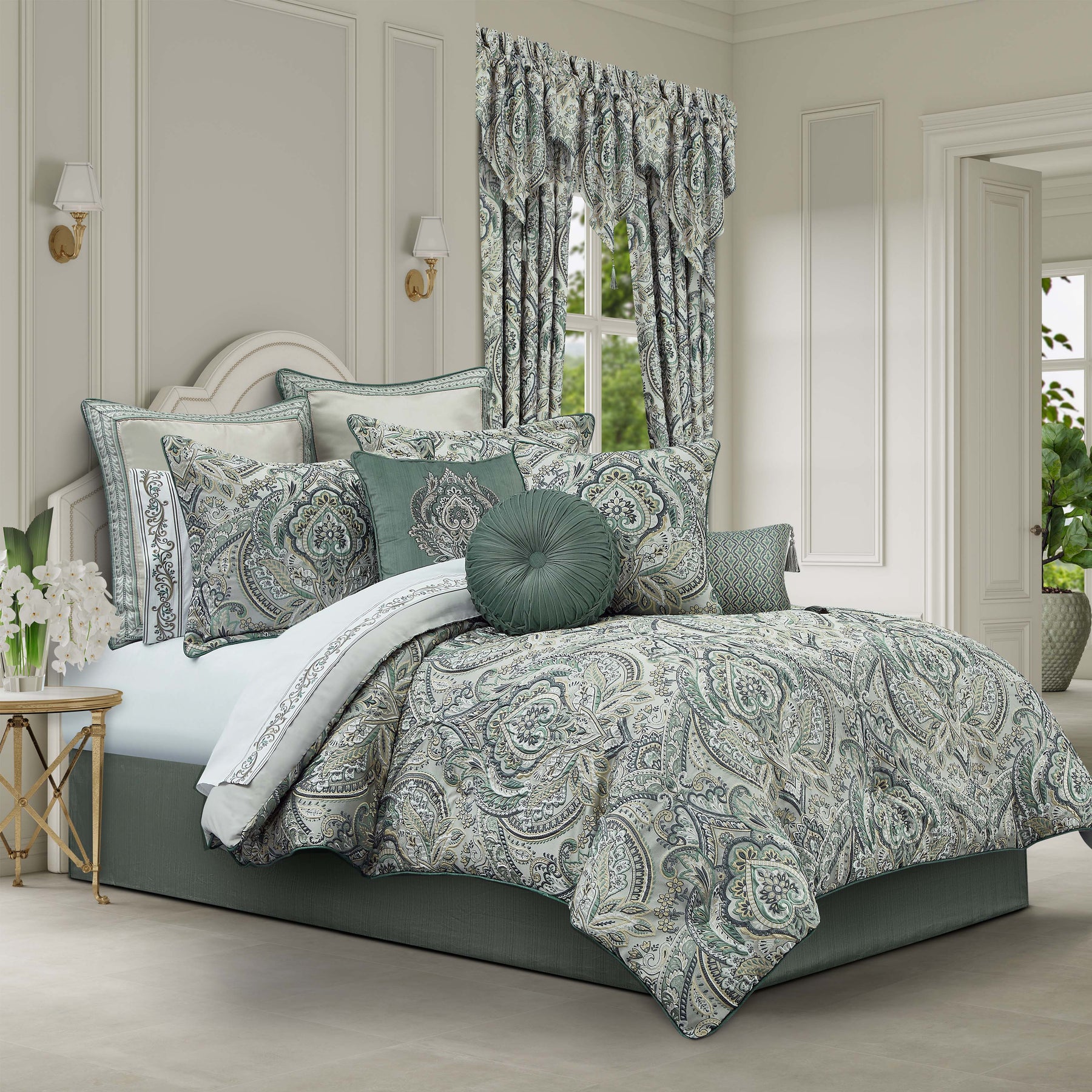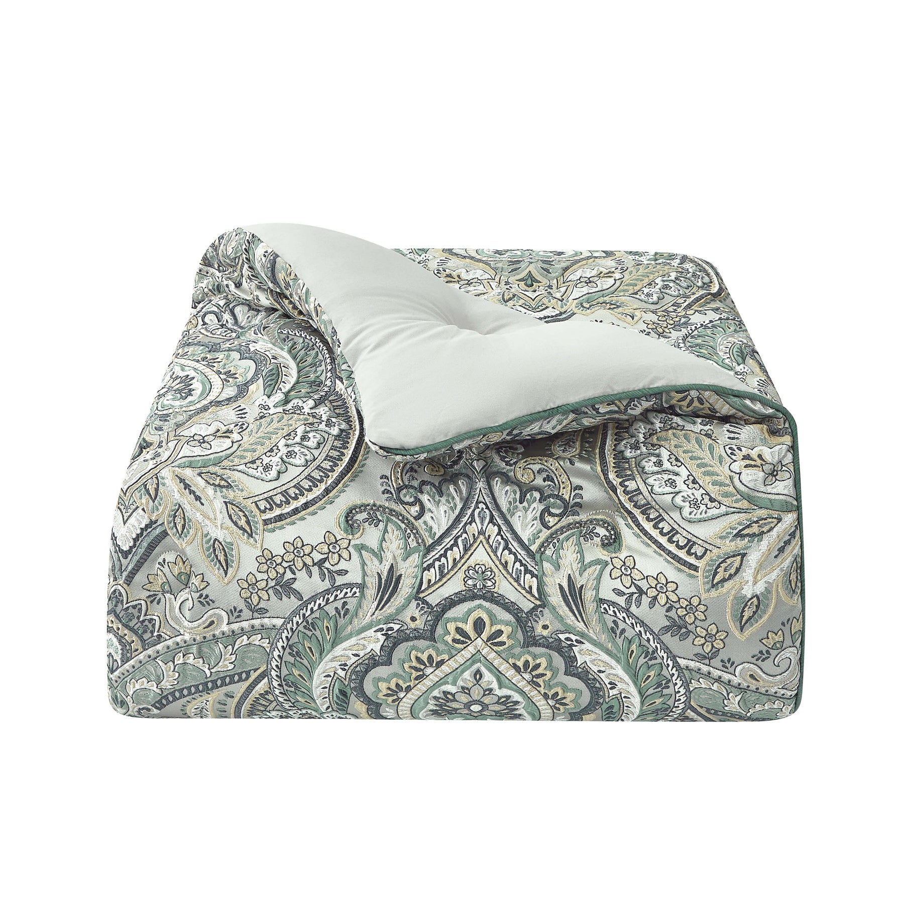 The nico comforter set features a timeless traditional woven damask design in lush spa blue, white, gold, and teal colors. The comforter is generously oversized and overfilled and finished with solid piping. Also included are 2 coordinate pillow shams, with a tailored split-corner bedskirt which adds the finishing touch. Add the nico accessories and window treatments to complete the look.