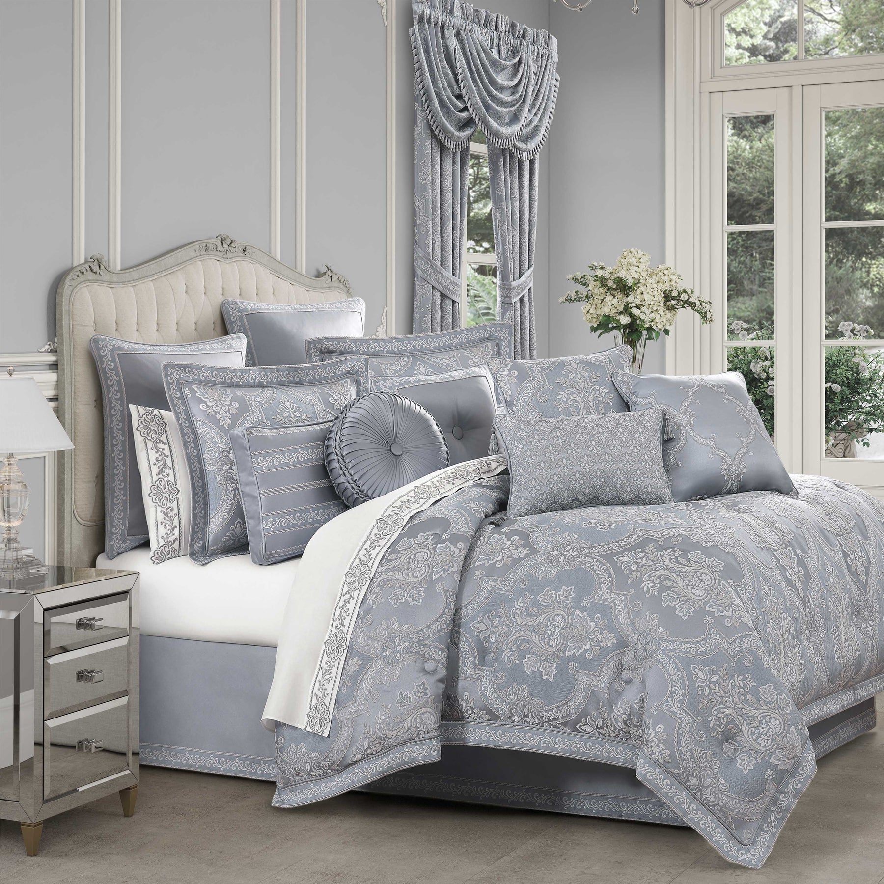 The sondra comforter set features a stunning traditional woven damask paired with an intricately designed herringbone weave. The soft powder blue tones in this bedding ensemble are a great accent to any bedroom. The comforter is generously oversized and overfilled and finished with solid piping. Also included are 2 coordinate pillow shams, with a tailored bedskirt which adds the finishing touch. Add the sondra accessories and window treatments to complete the look.
