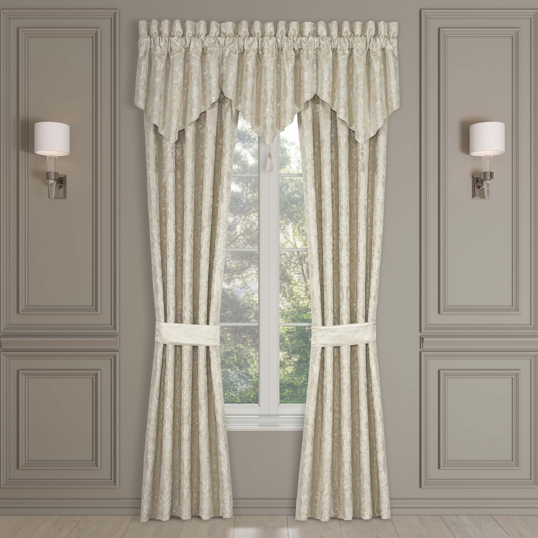 Add a luxurious touch to your window with the elegant celine ascot window valance. Constructed with a shimmering champagne woven damask, and carefully finished with a tassel fringe. In order to achieve the look in the photo, we suggest using three valances.