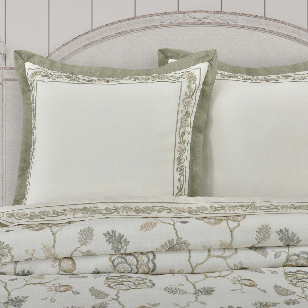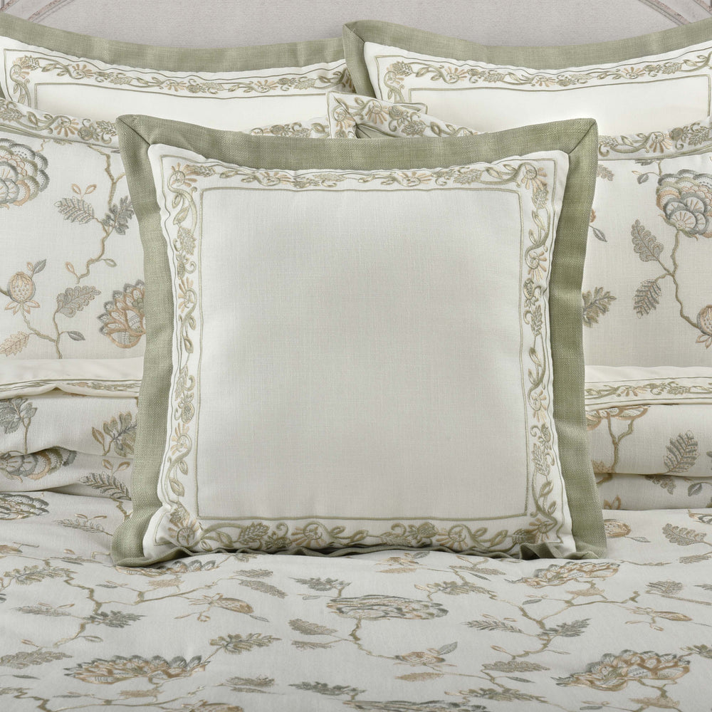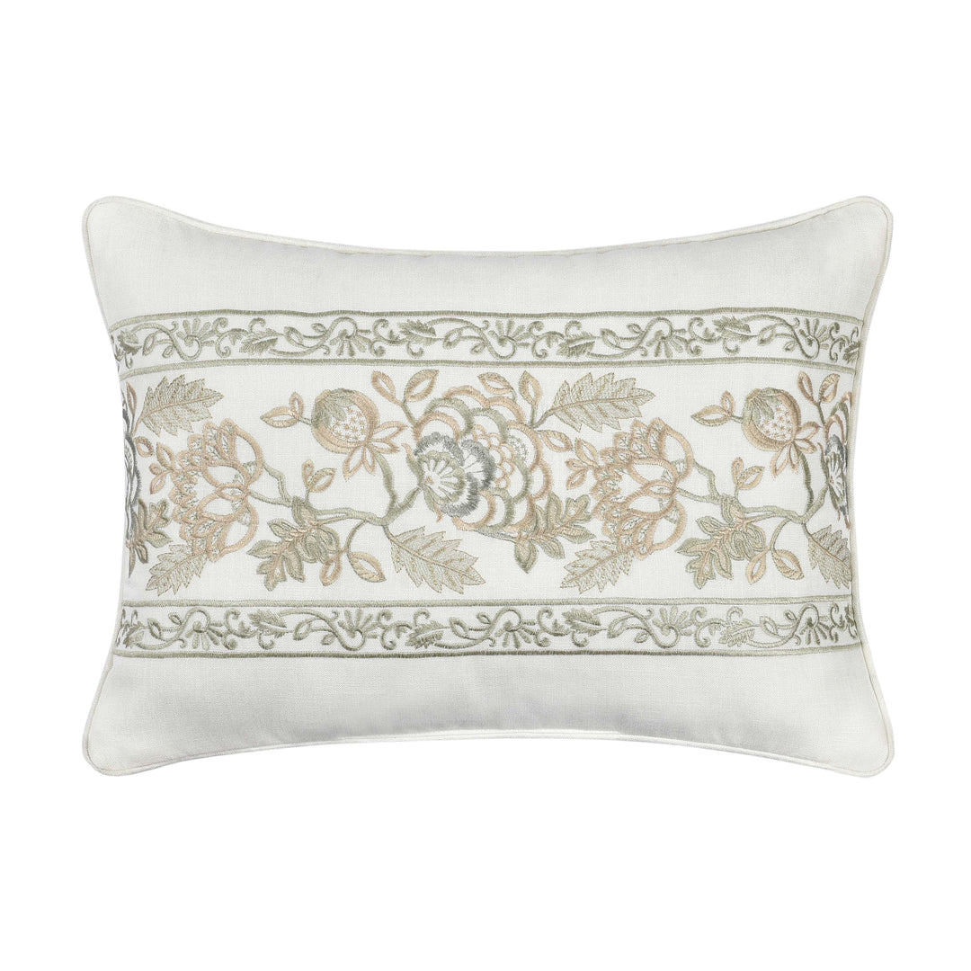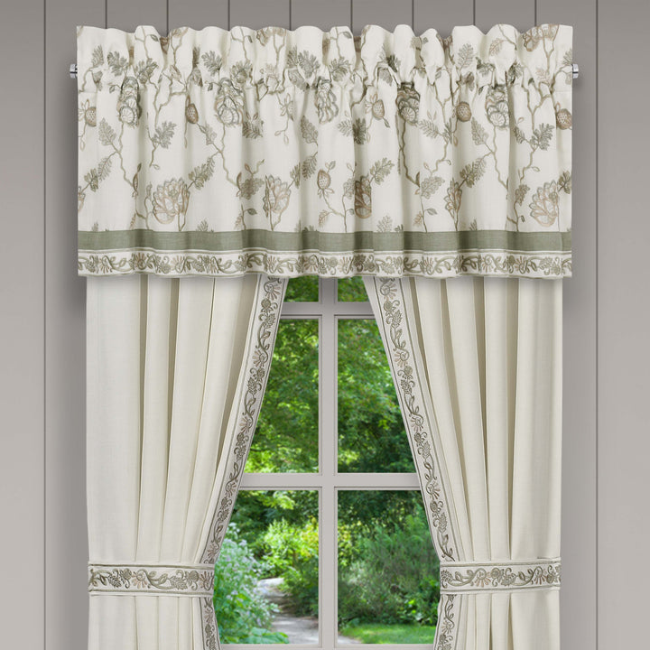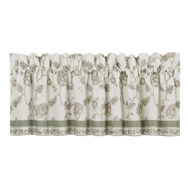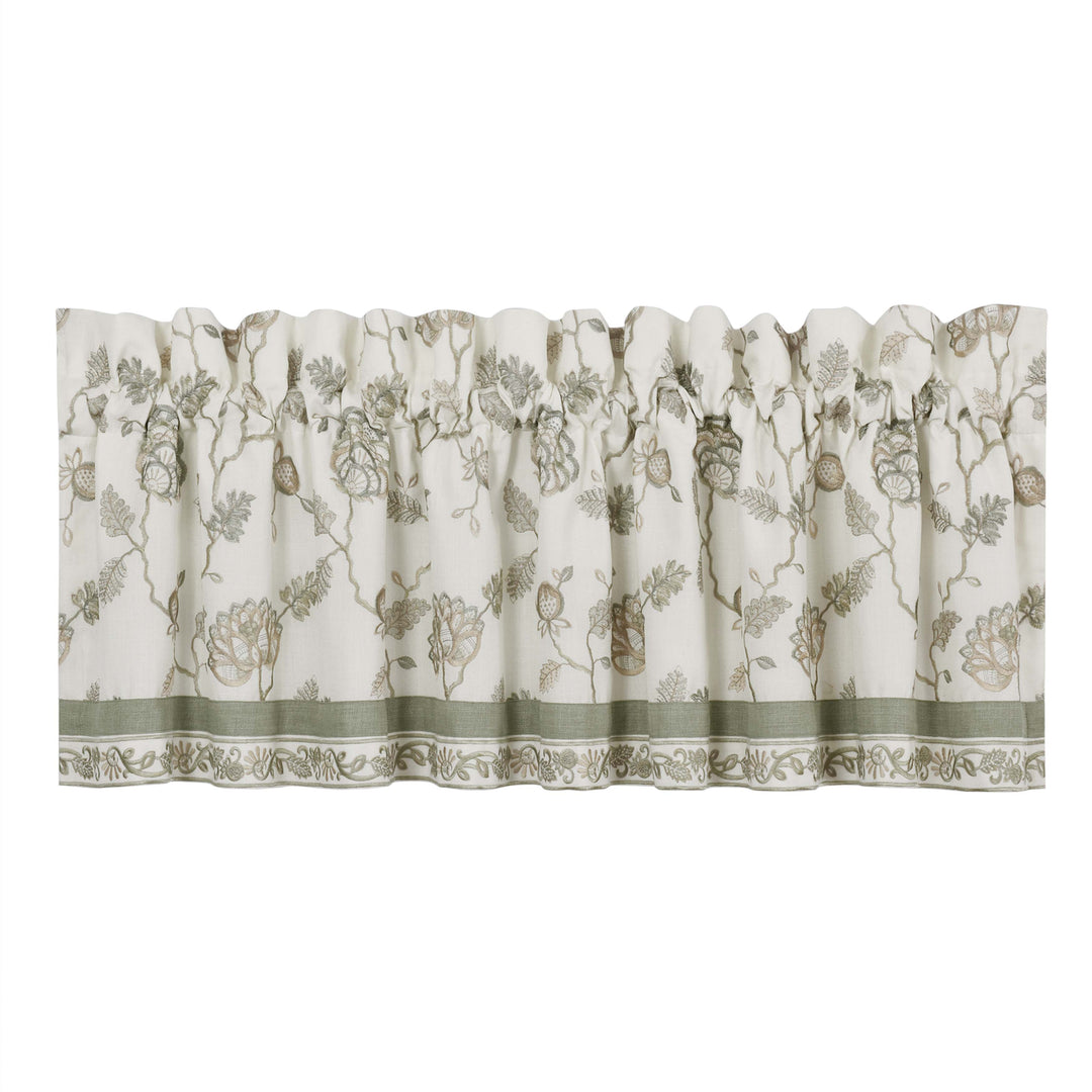 The fairview straight valance is constructed with a beautiful leaf embroidery in shades of sage green and natural tones. The embroidery sits on top of a textured base fabric matching perfectly to the fairview comforter set . The valance has a solid band and a diamond embroidery adding additional details to this stylish window valance. The perfect touch to complete your window, pair this valance with the fairview window panels and bedding collection to complete the look.