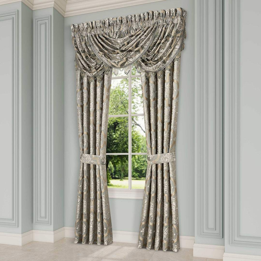 Create a custom look on your window with this elegant waterfall valance made with a stunning woven jacquard damask in soft sage and neutral hues. The lined valance is trimmed with a luxurious tear drop crystal tassel fringe, dyed to match the powder blue and yellow golds in the martina comforter set and window panels. In order to achieve the look in the photo, we suggest using three valances (each sold separately).
