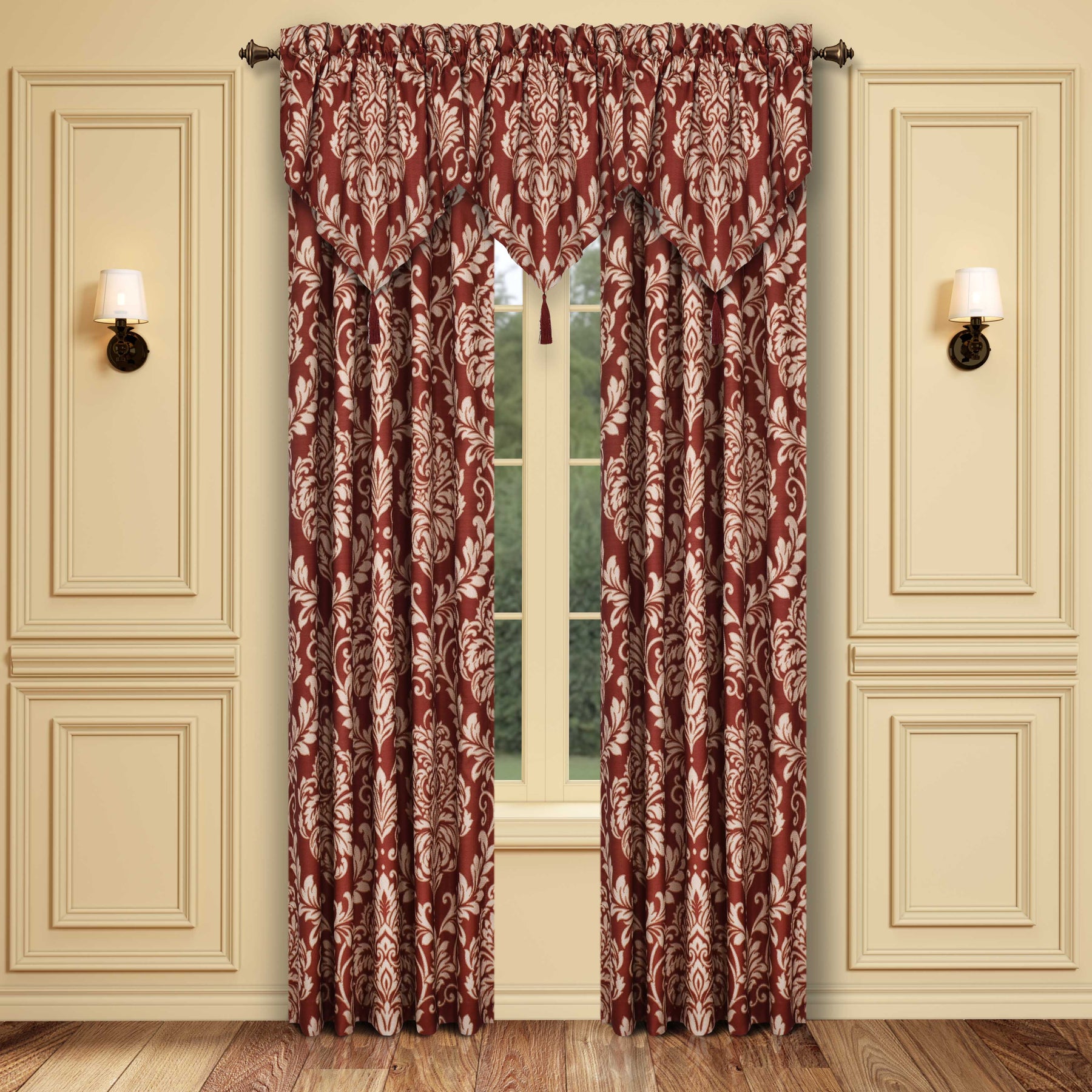 The lazia window valance feature an elegant woven damask design. The neutral tones are woven on a red texture fabric, and it is finished with a tassel trim for added detail and elegance. Pair this valance with the lazia window panels and bed set to complete the look. To achieve the look in the photo we recommend using 3 valances (each sold separately).