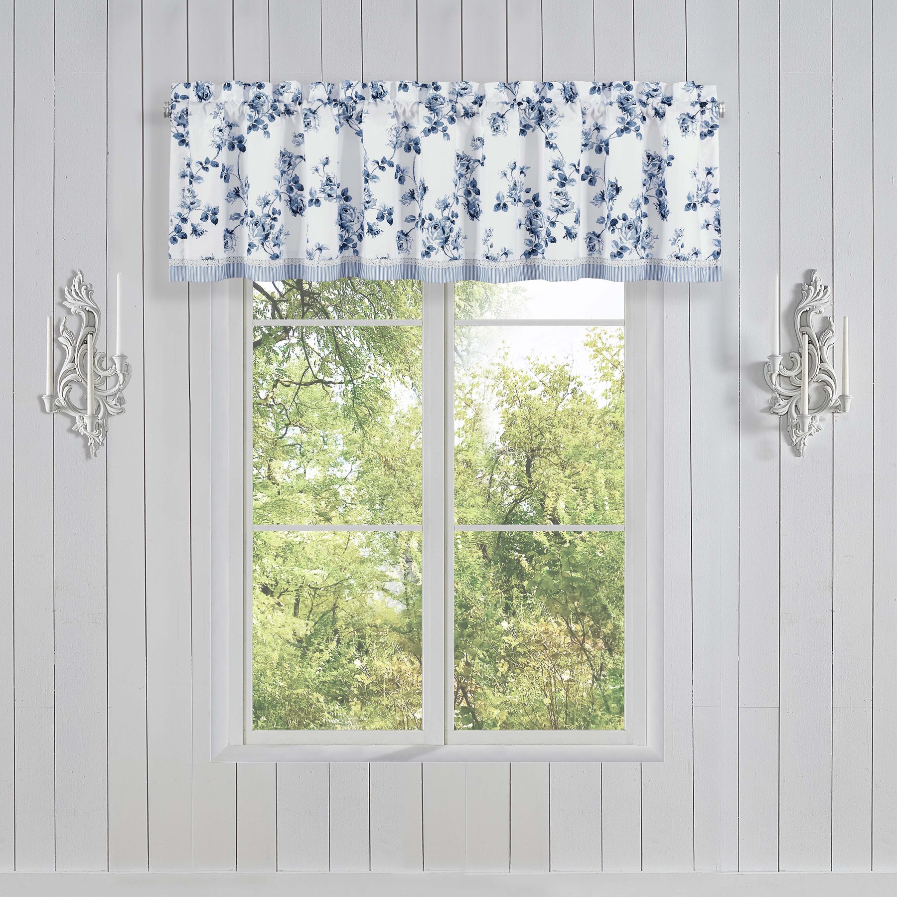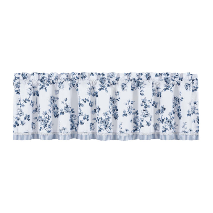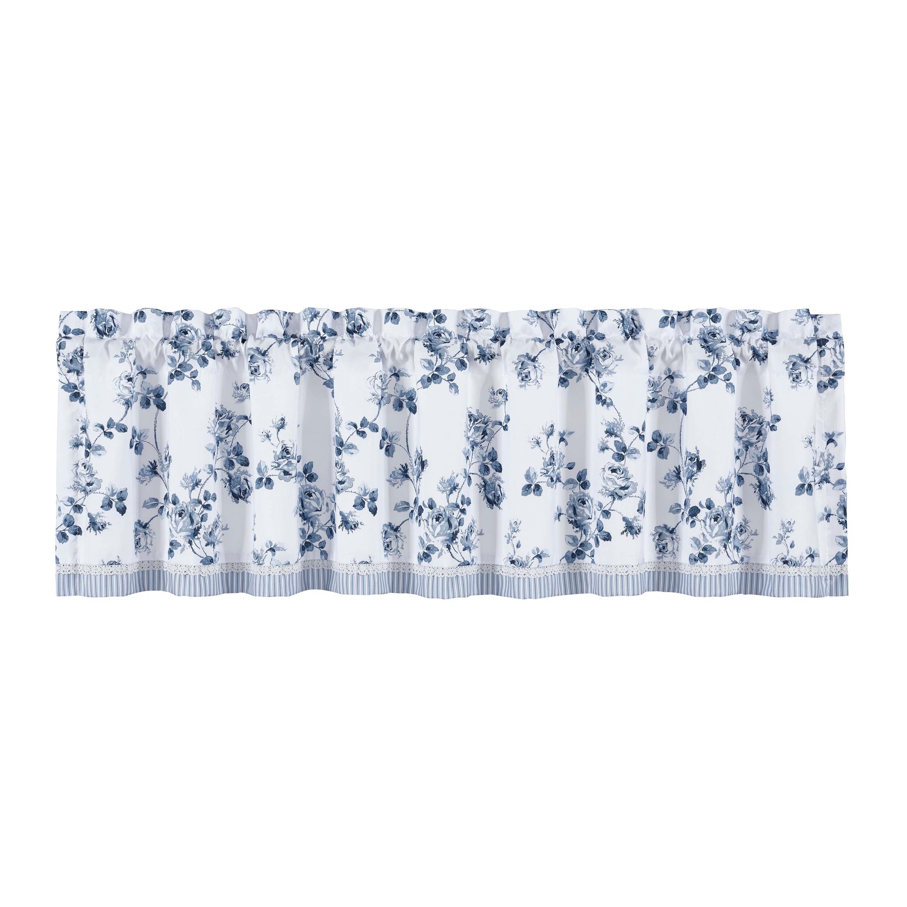 The rialto straight valance's classic floral design creates an atmosphere of sophisticated elegance. The lovely motifs are paired with a crochet trim detail and finished with a ticking stripe pattern in white and french blue, making it the perfect finishing touch to your window decor.