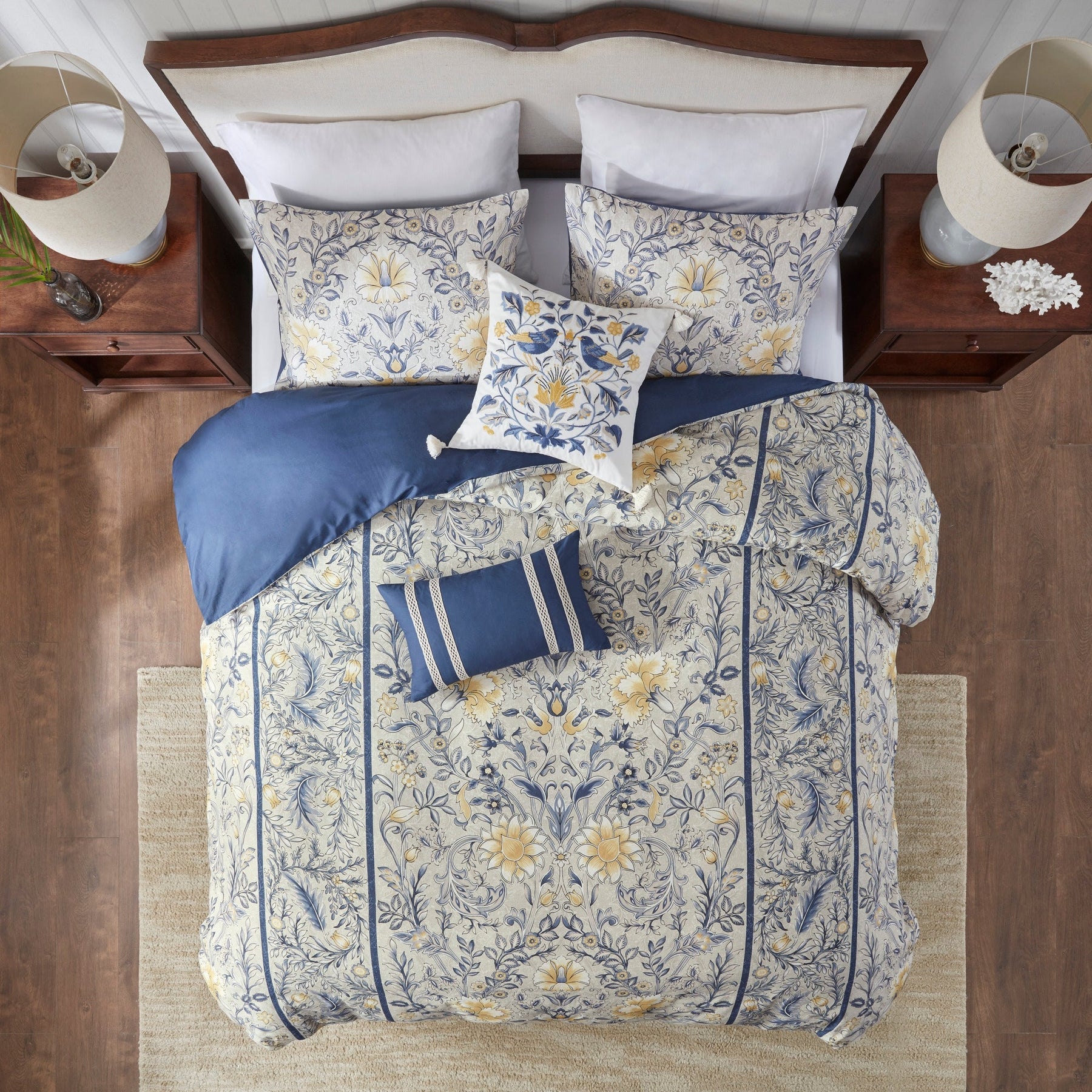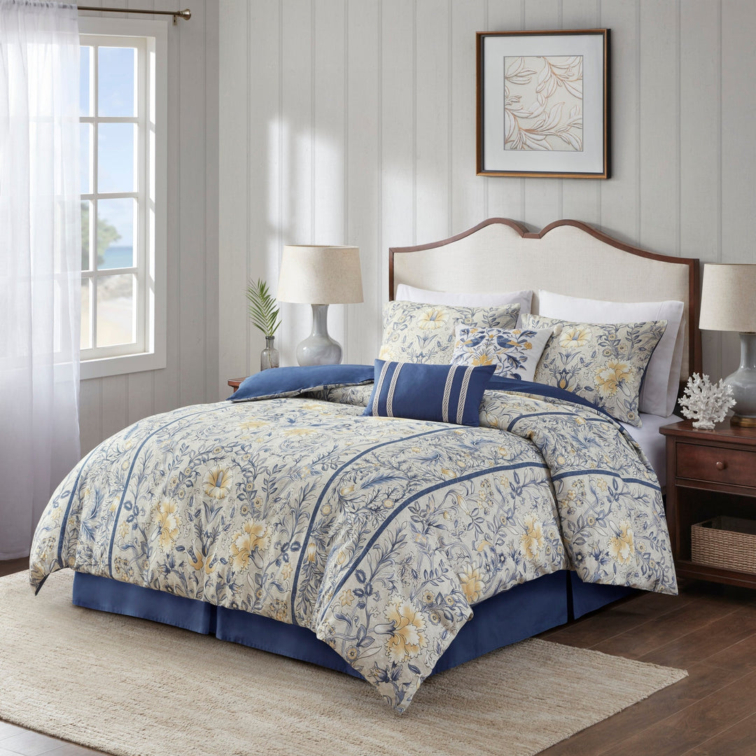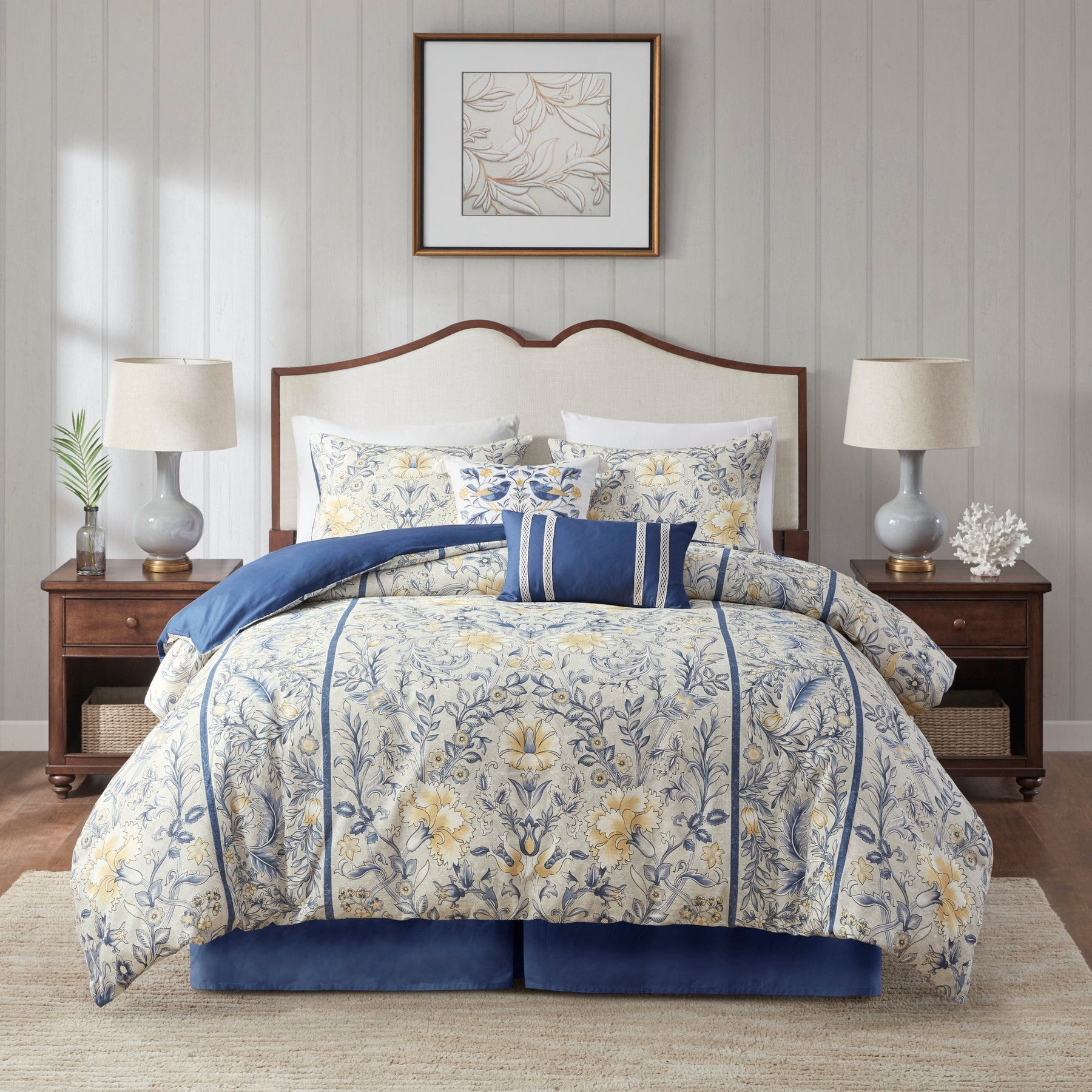 Elevate your bedroom with the refined allure of the Harbor House Livia 6 Piece Cotton Comforter Set. The 100% cotton slub comforter showcases a botanical print, in yellow and blue hues, with a solid blue reverse, for an elegant cottage look. Hidden bartacks in the oversized and overfilled comforter create a smooth duvet-like finish. The 2 matching shams pair beautifully with the comforter and the 2 decorative pillows, 1 oblong and 1 square, add complementary touches. A solid blue bed skirt provides a clean finish to round out the charming farmhouse appeal of this cotton comforter set. This bedding set is also OEKO-TEX certified, meaning it does not contain any harmful substances or chemicals, ensuring quality comfort and wellness.