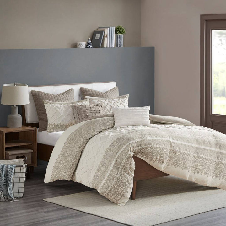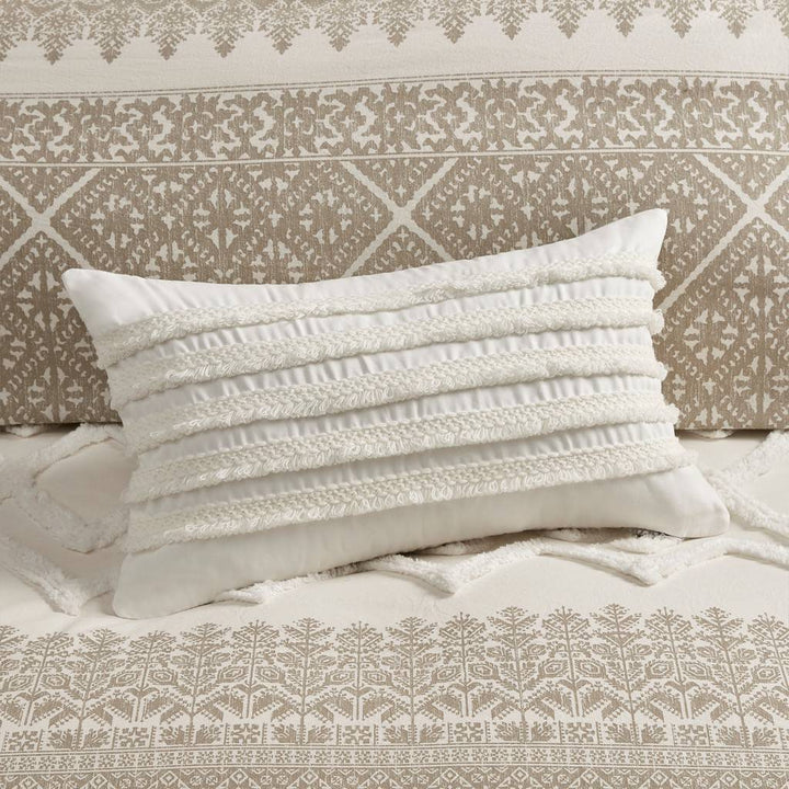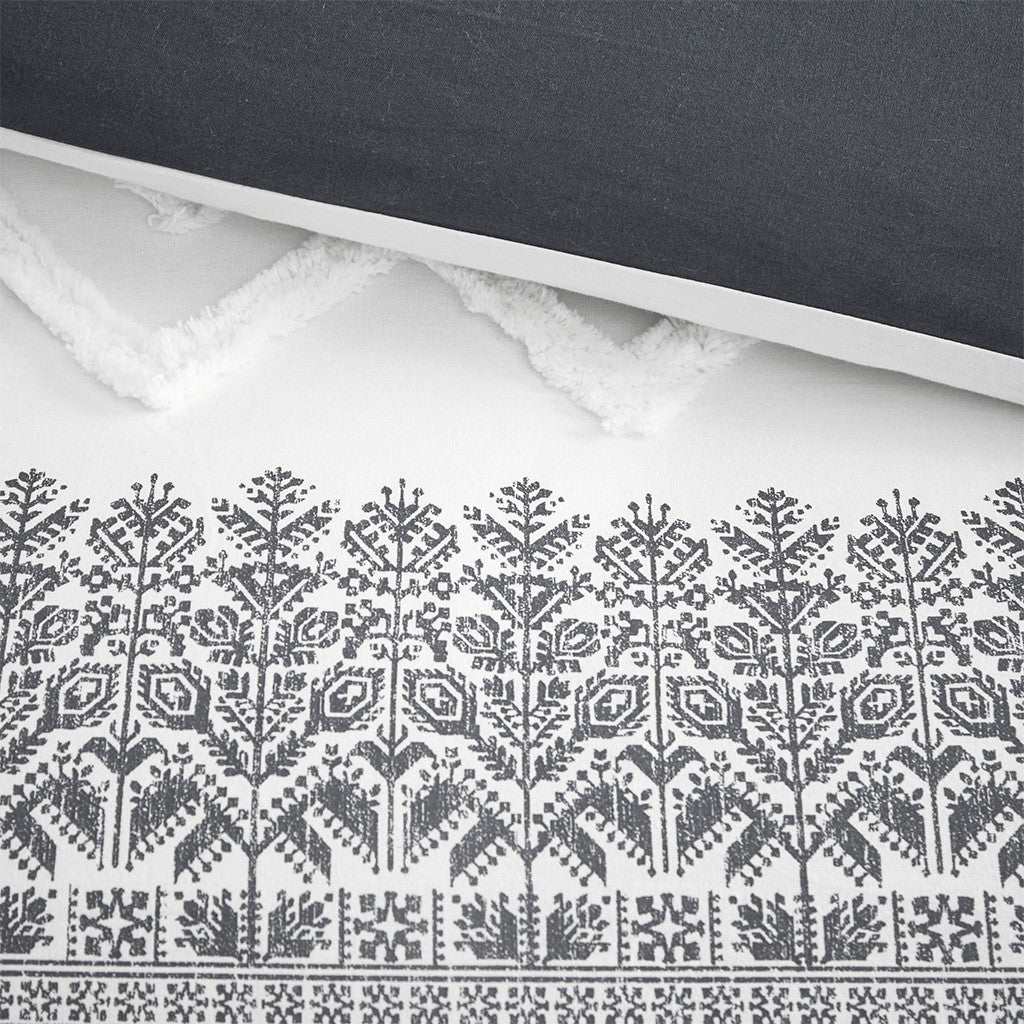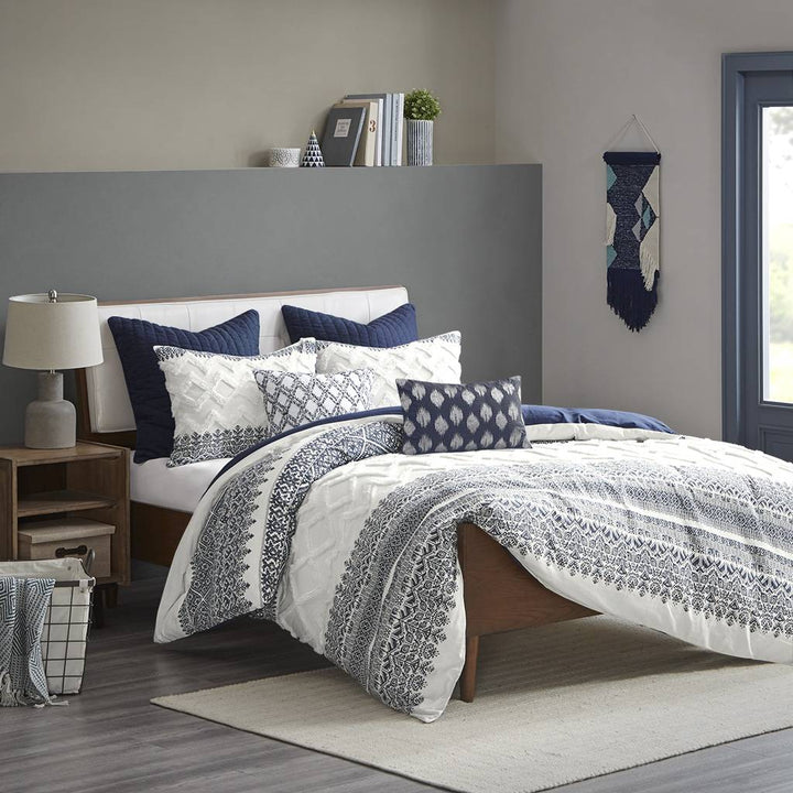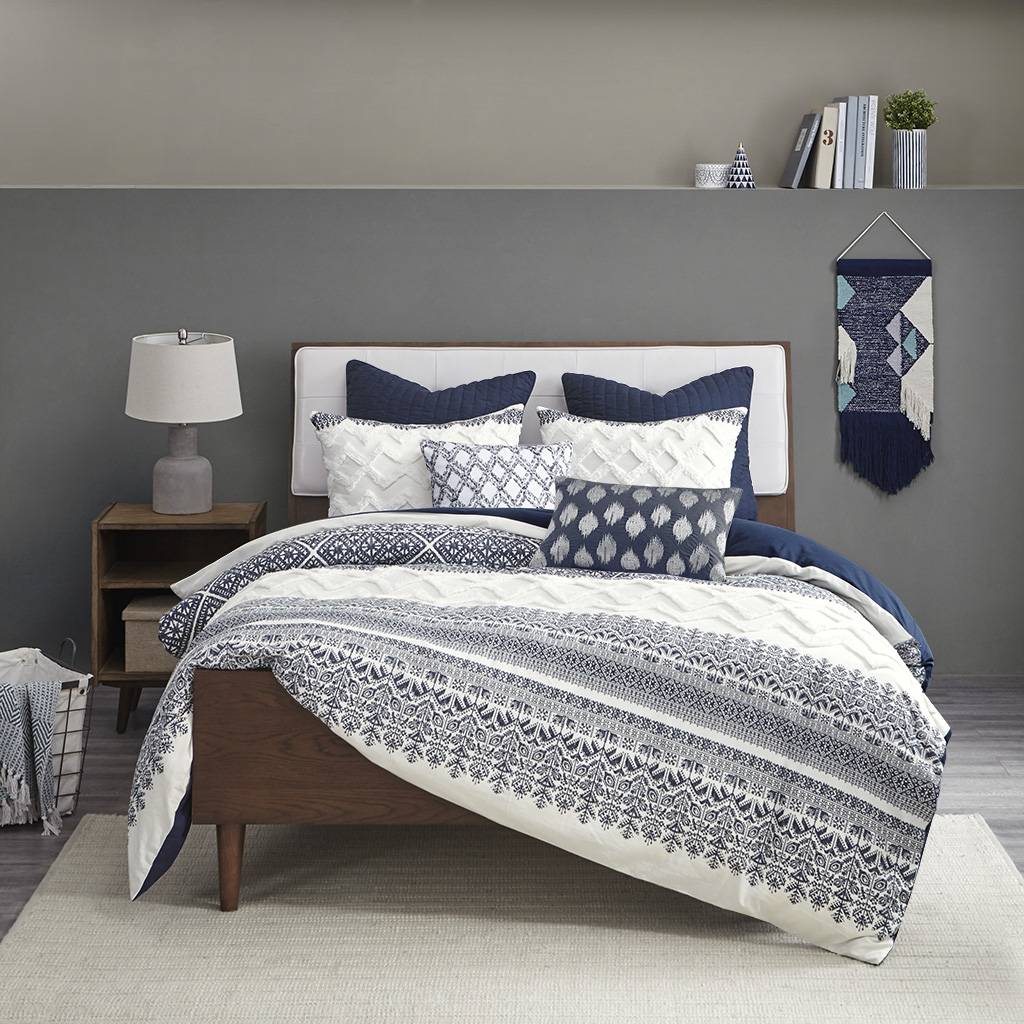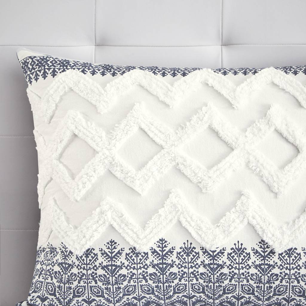 Transform your bedroom with the charming shabby chic allure of the INK+IVY Fary 3 Piece Cotton Comforter Set with Chenille Tufting. The cotton comforter flaunts an updated navy botanic print, on a natural white ground, with tufted white chenille, in a chevron design, to create a charming farmhouse look. A solid navy reverse complements the top of the comforter, while hidden bartacking secures the hypoallergenic polyester filling without visible line for a clean finish. Two matching shams beautifully mimic the design of the comforter, completing the farmhouse comforter set. Machine washable, this cotton tufted comforter set offers soft comfort and a vivid touch that elevates your bedroom decor. This bedding set is also OEKO-TEX certified, meaning it does not contain any harmful substances or chemicals, ensuring quality comfort and wellness.