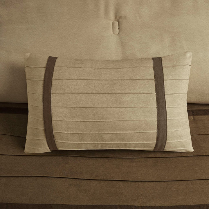For comfort and a chic design, the Calmer bedding collection is the perfect fit. Its ivory comforter is made from pieced microsuede for a soft feel while the piecing details add texture and color with their taupe and brown colorways. The decorative pillows add a mix of nature-inspired leaves and solid neutrals to combine perfectly with this collection.