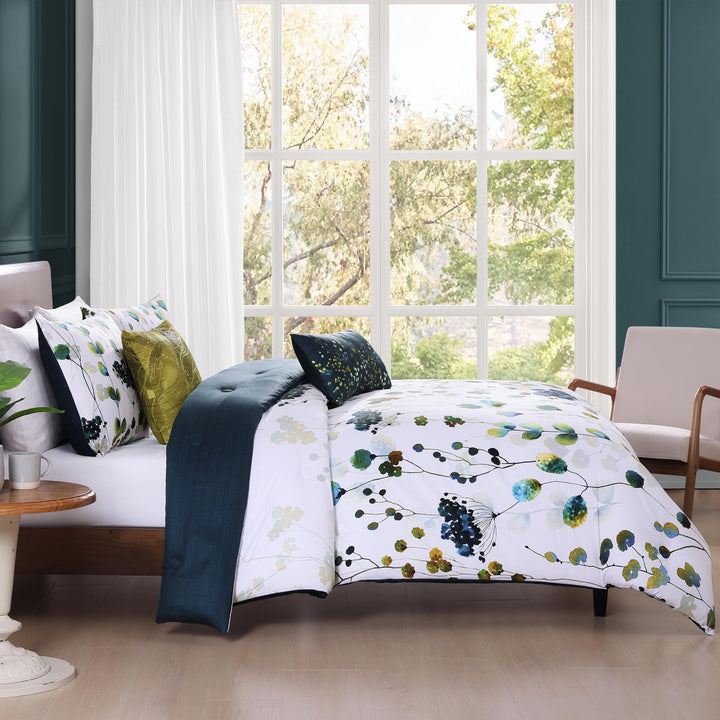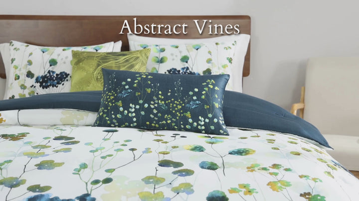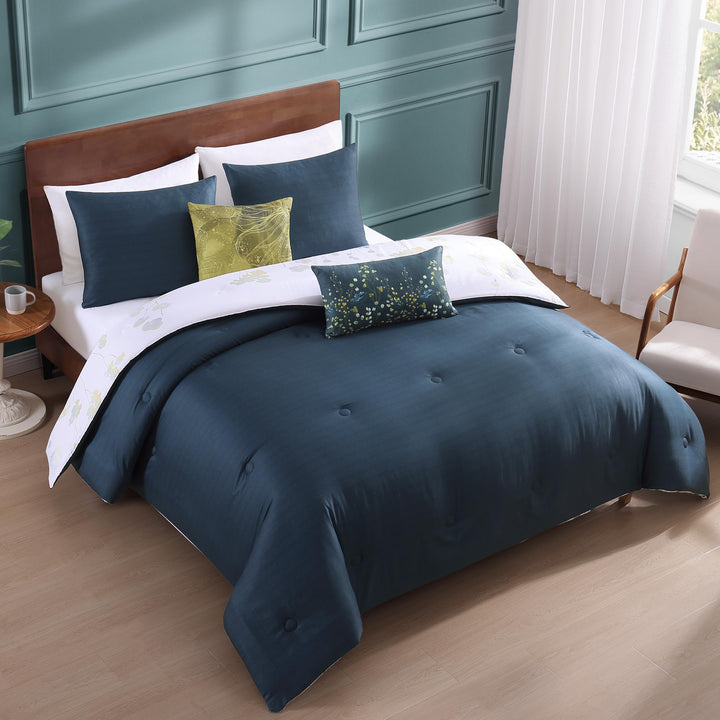The Bebejan Abstract Vines 5 Piece Reversible Comforter Set has a crisp, contemporary flair with navy blue and gold vines sitting on a clean, white background. On the reverse, a printed navy blue tonal textured weave pattern complements the front and offers a completely different second look to your bedroom. Gold contrasts beautifully on the navy textured oblong printed pillow and a gold abstract print square pillow with chain stitch embroidery complete the look for added value and style. This 100% cotton sateen 5 piece set includes 2 shams, an 18" x 18" embroidered pillow, and a 22" x 12" printed pillow. As a bonus, the set is packaged in a reusable self-fabric tote.