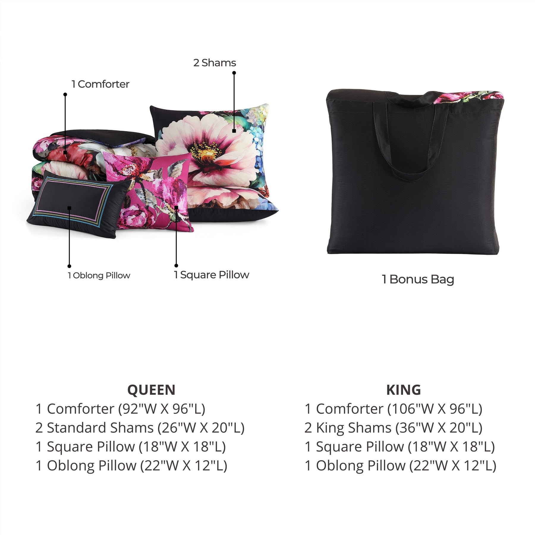 Set Includes: 1 Comforter | 2 Shams | 2 Decorative Pillows | 1 Bonus Bag