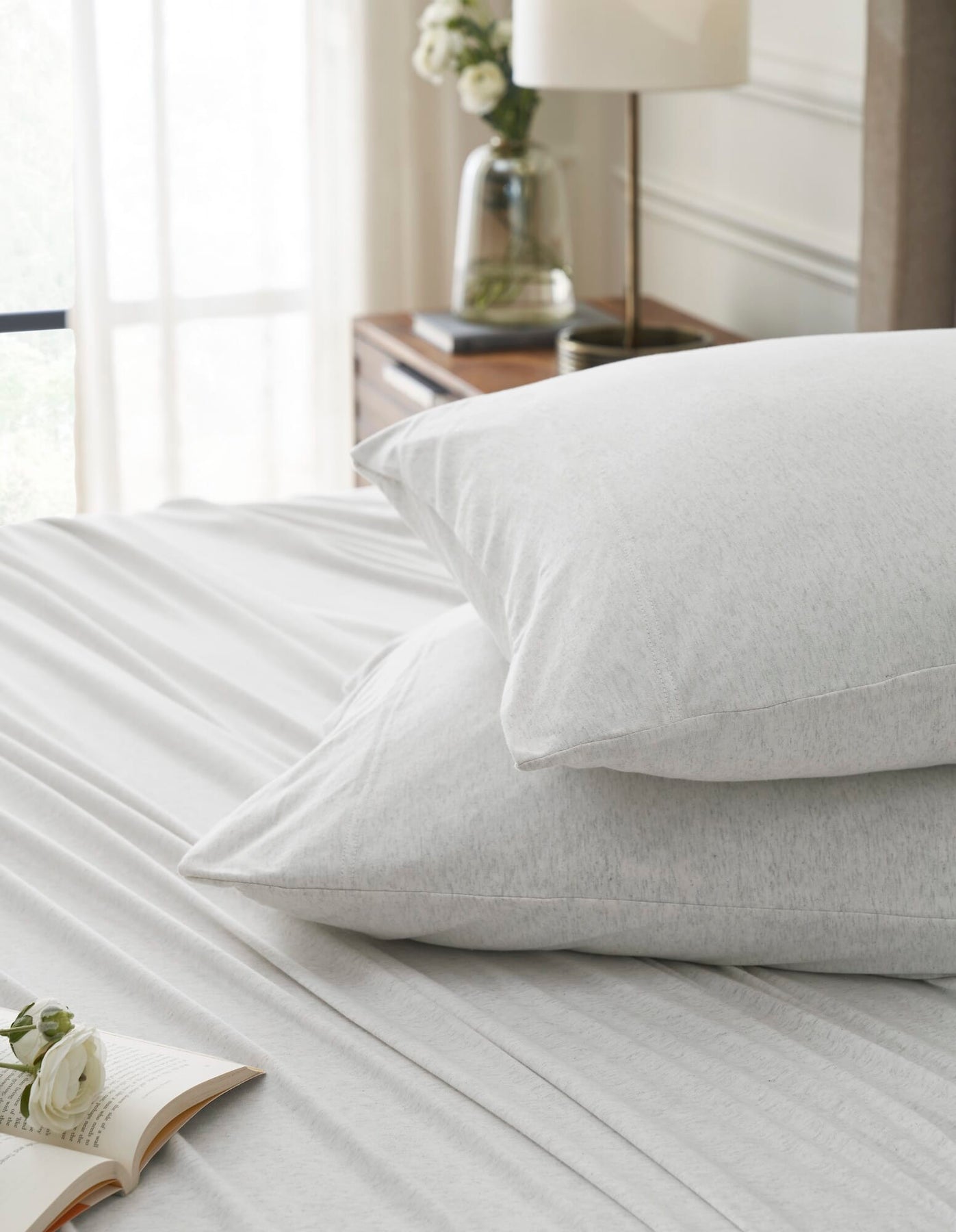 Softer than your favorite t-shirt and just as casual-classic of our Cozy soft Halston sheet set collection makes a bed you won't want to get out of. Crafted from high-quality combed, compact, yarn-dyed 100% cotton mélange knits breathable jersey bedding that's super soft and irresistibly cozy. You'll love snuggling up in this sheet set and never want to get out of bed!