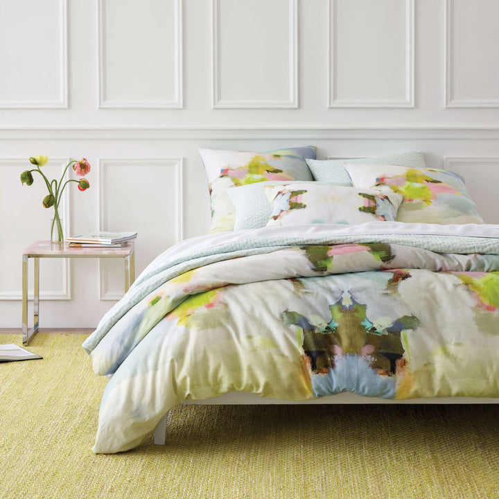 We developed the kaleidoscopic Milan print from the uniquely stylized work of artist Laura Park. Fresh and bright, playful and painterly are just a few words that describe the hallmark style of her paintings which feature layers of abstract washes within a beautiful palette. We then digitally print it for superb reproduction of the sophisticated watercolor technique on our luxuriously silky, smooth 400 thread-count long staple cotton sateen.