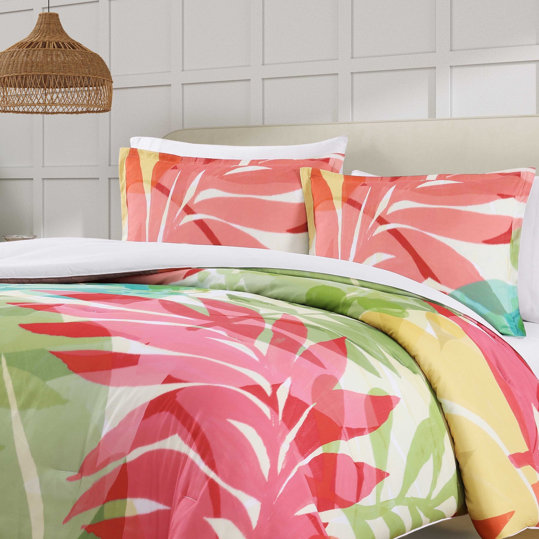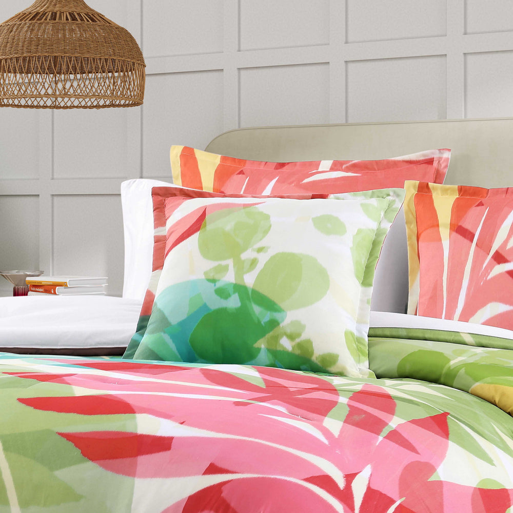 Transform your bedroom with the vibrant tropical tiki comforter set. Featuring a refreshing color palette that is crafted for comfort and style. Constructed with a durable yet soft lightweight fabric, this nature-inspired design brings a resort-like feel to any space. The set includes coordinate pillow shams and it is available in a stunning fuchsia or green color option (euro shams and throw pillow sold separately).