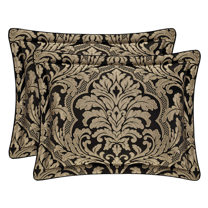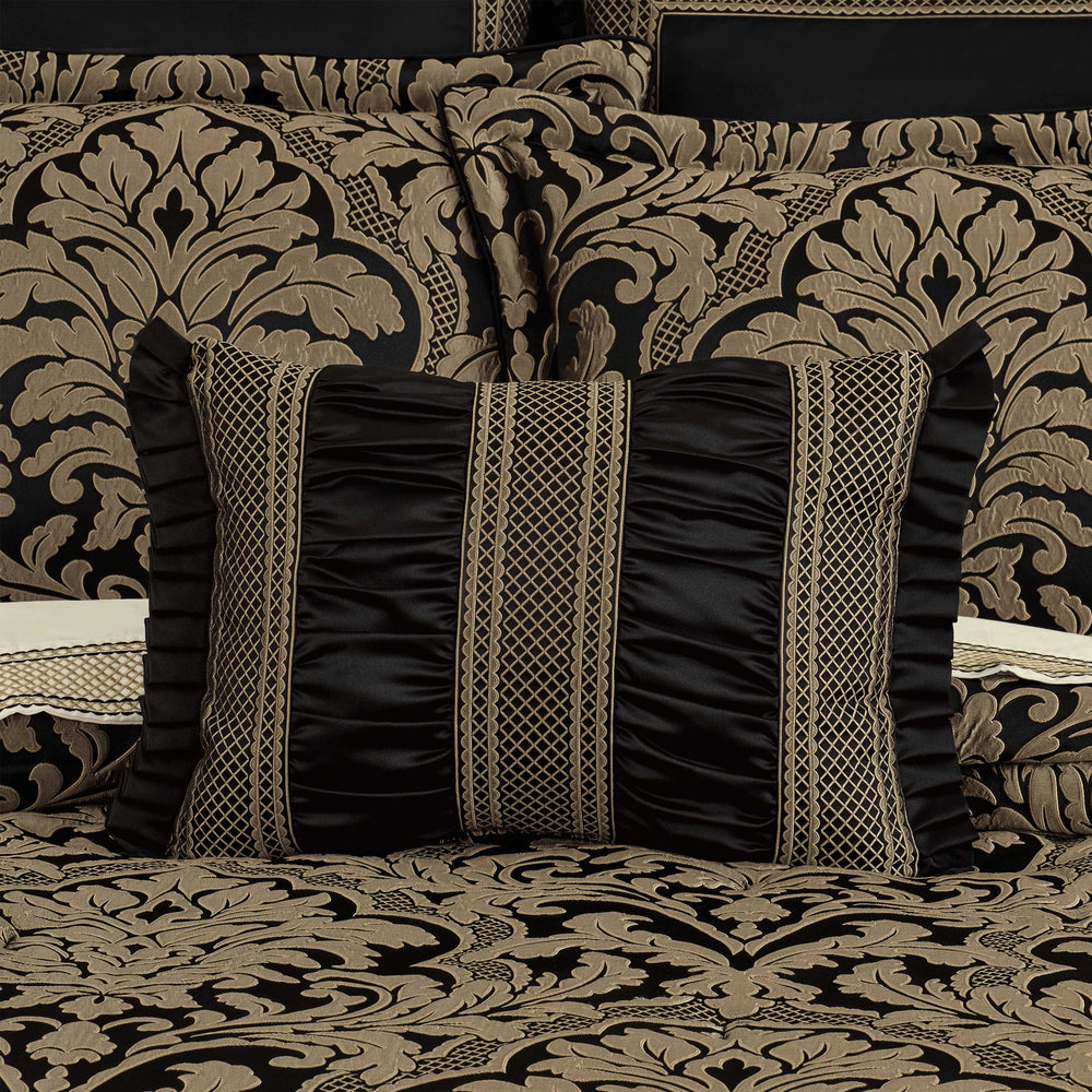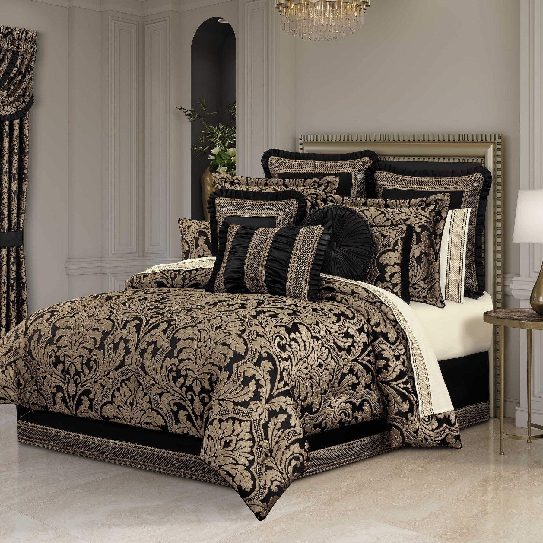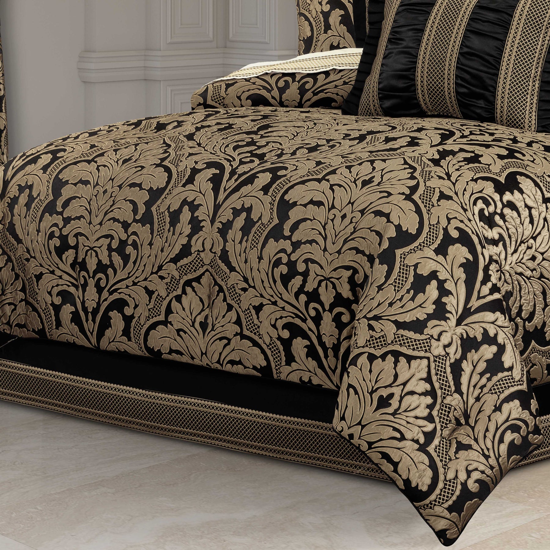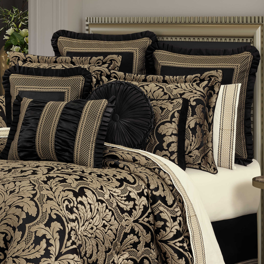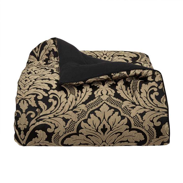 The brunello 4 piece comforter set features an intricately woven damask that is positioned perfectly to optimize the sheen and texture of the grand design. The dramatic black and gold fabric adds depth and interest to any room, while the timeless design creates a sense of sophisticated ambiance. A small satin piping finishes the lofty and oversized comforter that reverses to a soft and smooth coordinating solid fabric. Pair this bedding collection with the brunello throw pillows, shams, and window treatments for a timeless luxurious look.